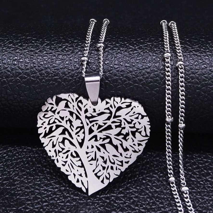 19" stainless steel necklace with a "stations" chain. 1 3/8" heart is a laser cut (through and through) tree with branches, leaves and birds distinguishable.
