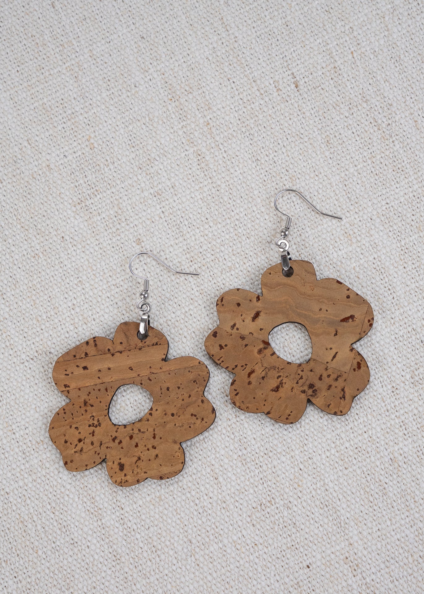Fun "lop-sided" flower with cut out middle, hangs 2.75" on silver colored stainless steel.