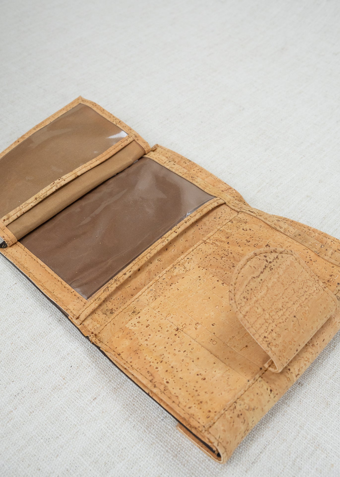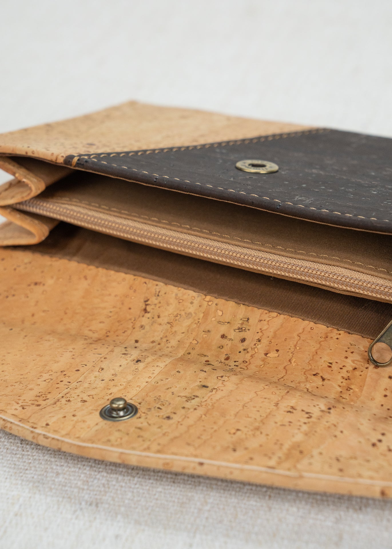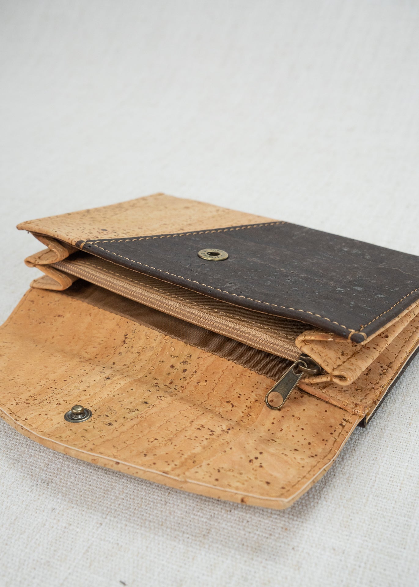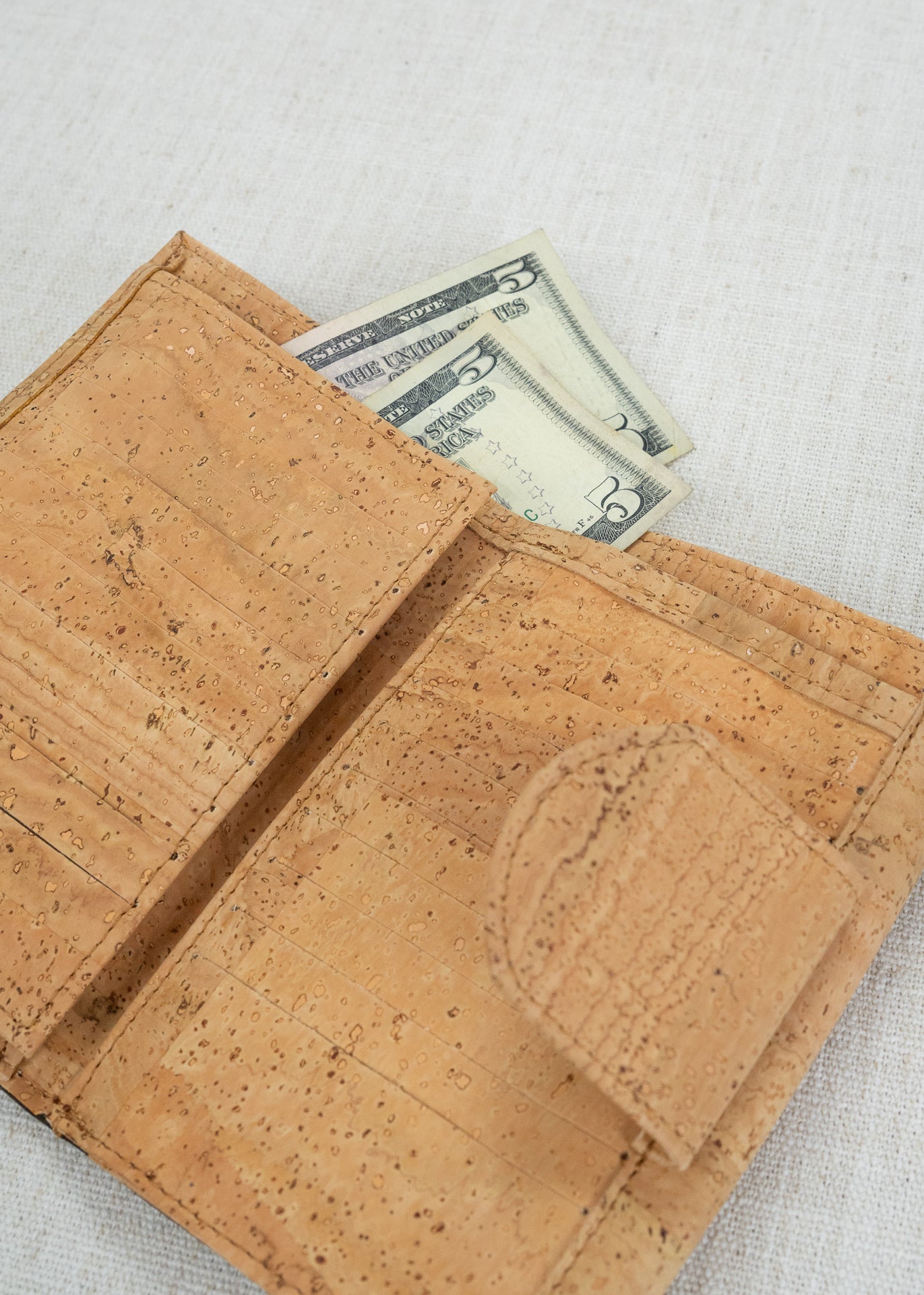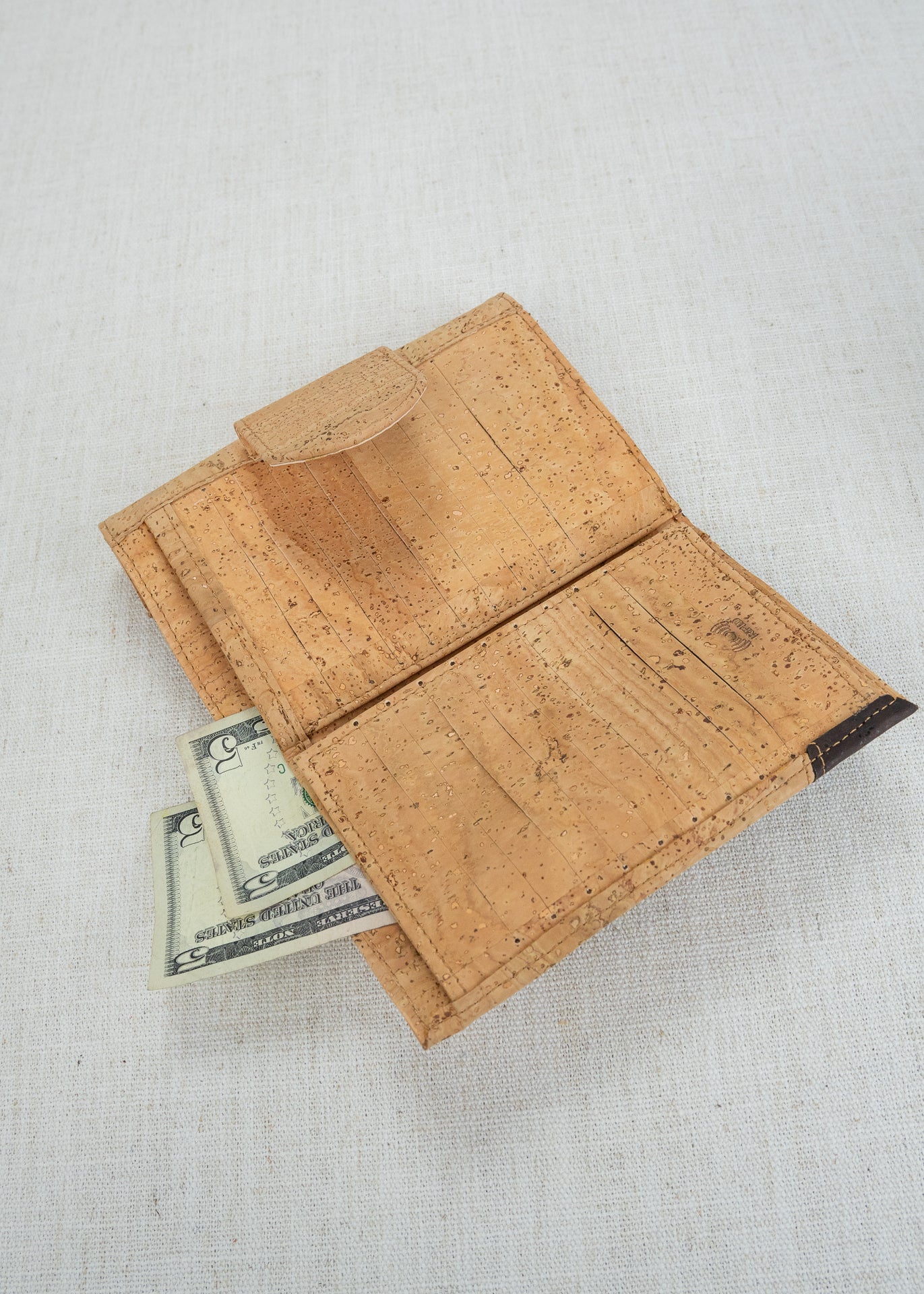 RFID protected Cassidy has 18 credit card slots on the snap tab side, as well as two window pockets for your license and anything else that needs to be visible. The top of this side opens with a two compartment section for bills. The other side opens to two compartments, divided by a zippered pocket for coins. Soft and easy to clean cork!