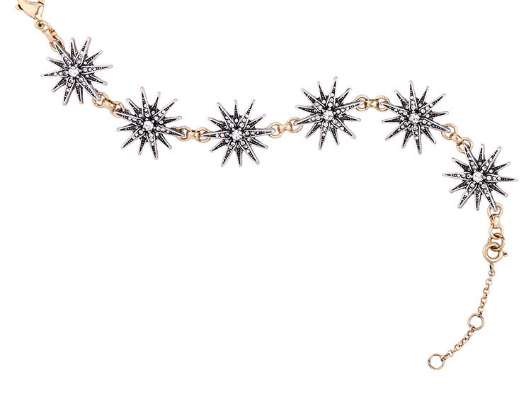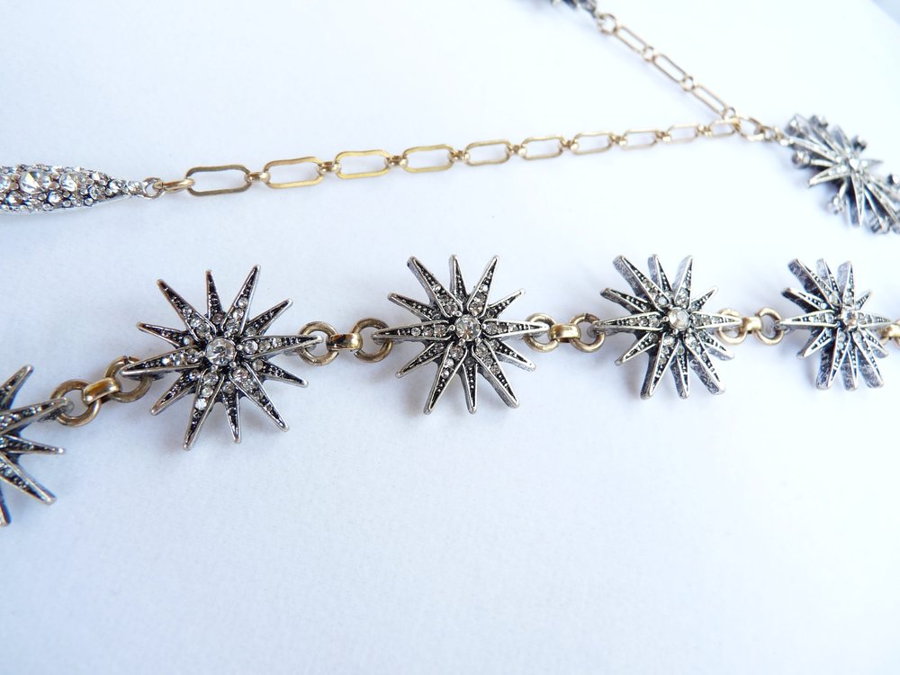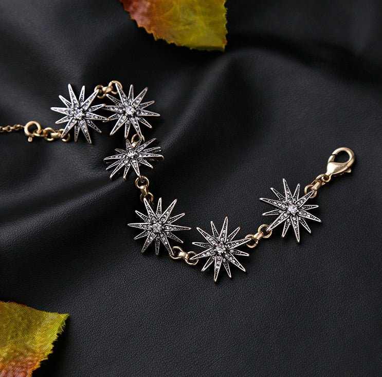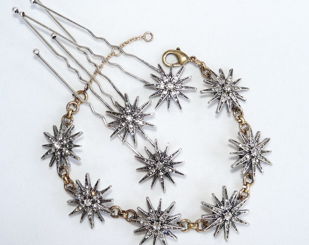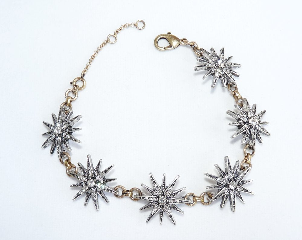 Nickel Free. Adjustable bracelet - 7 1/2"-9". Bracelet has the same 7/8" antiqued silver star found on the Celestina Necklace - 6 stars linked with the worn gold links. Use with Celestina pieces, mix and match in with the Newcastle pieces, Ulyana, Vashti, Fletcher or Alisha. See also the Celestina Hair Accessories!