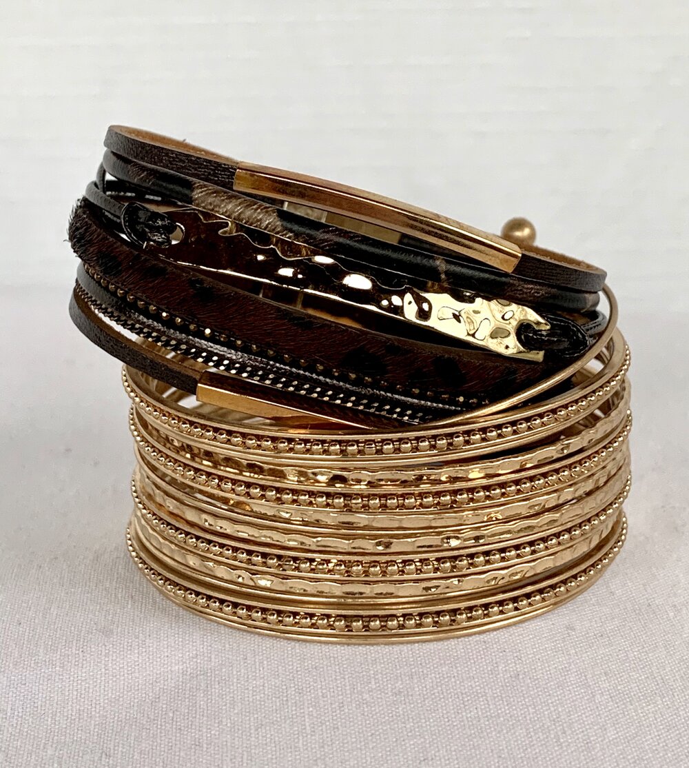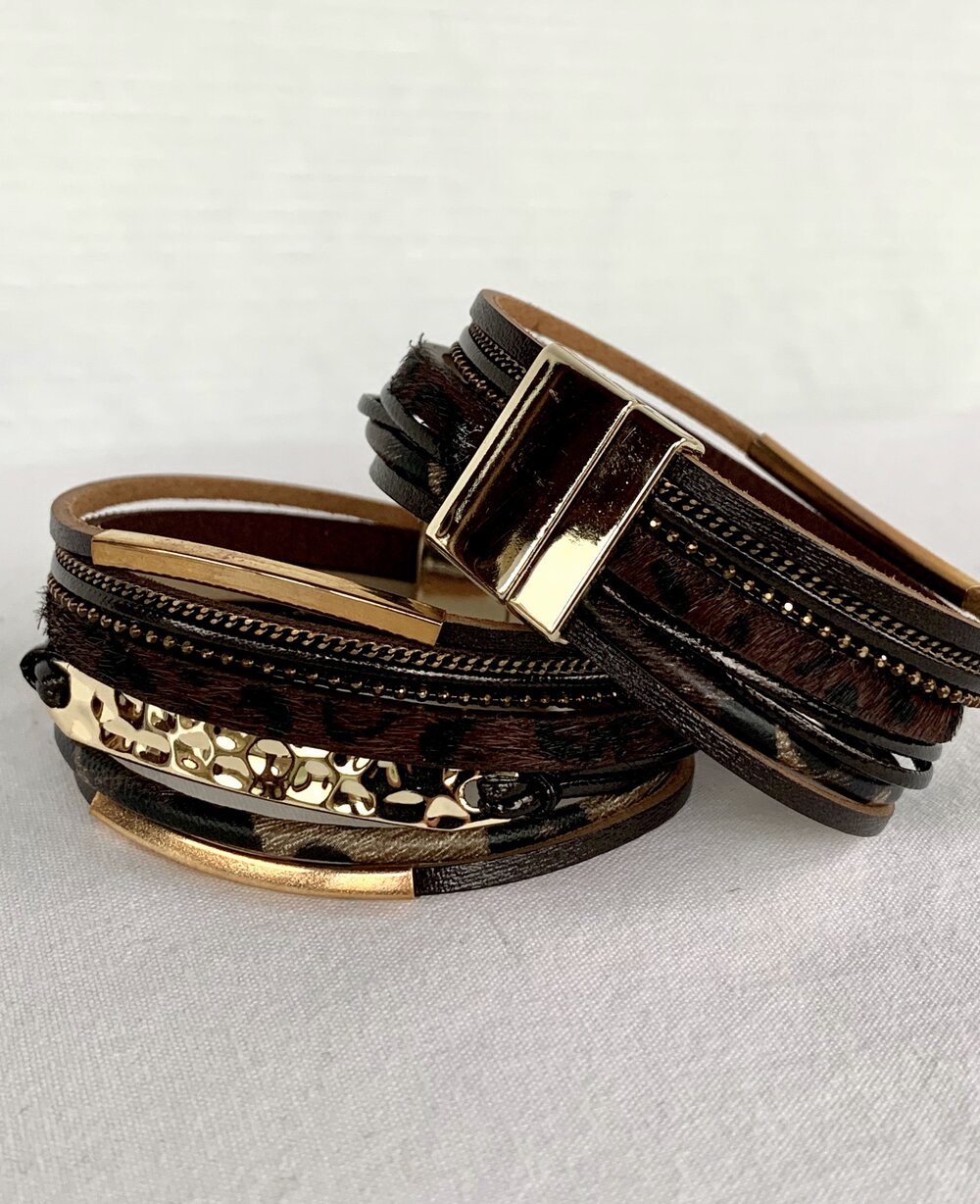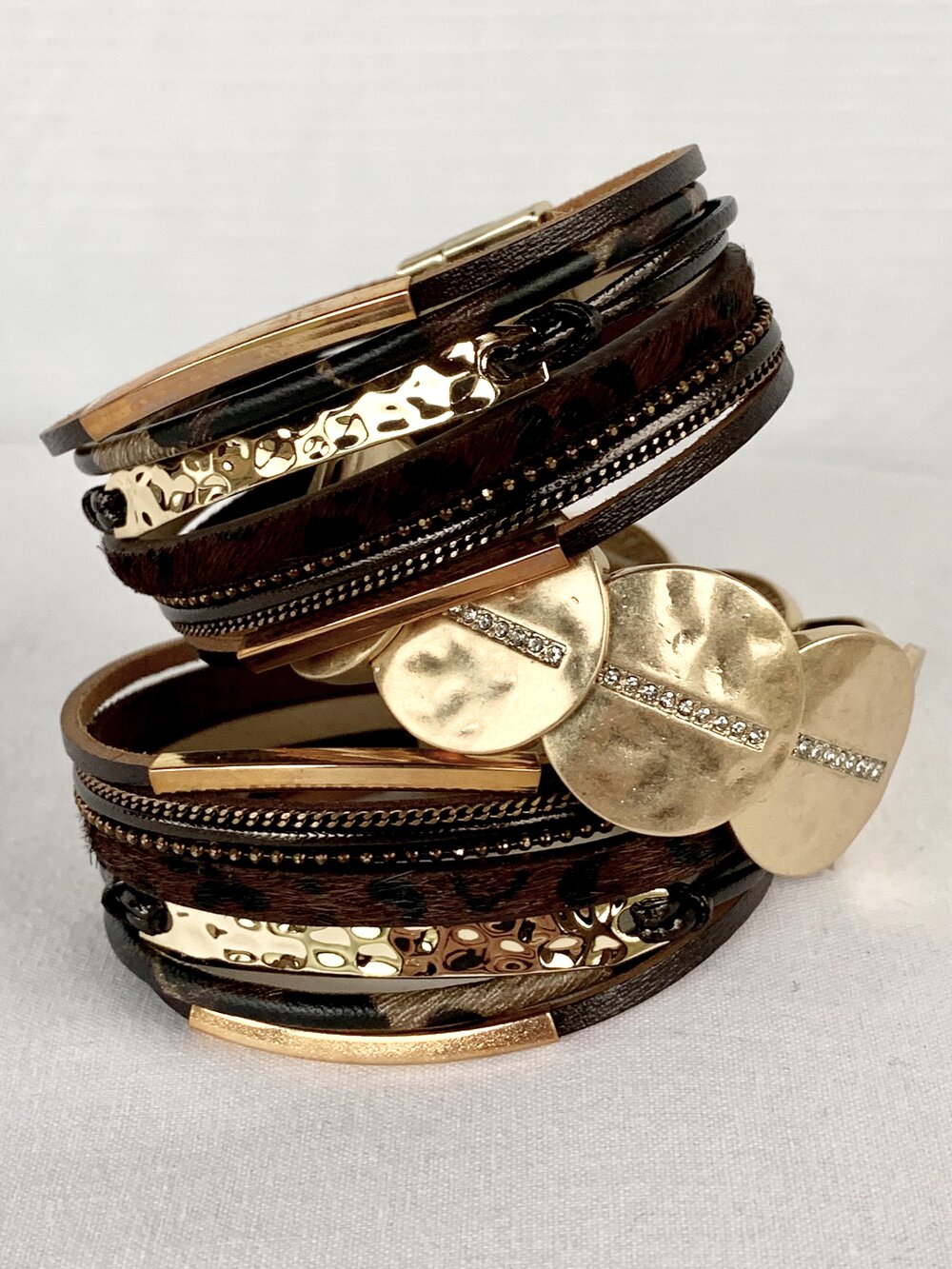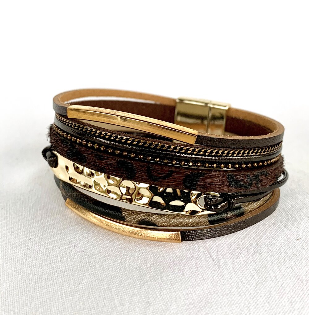 Six fun chocolatey layers of leather and cord with different textures and gold accents. Average size and magnetic closure.