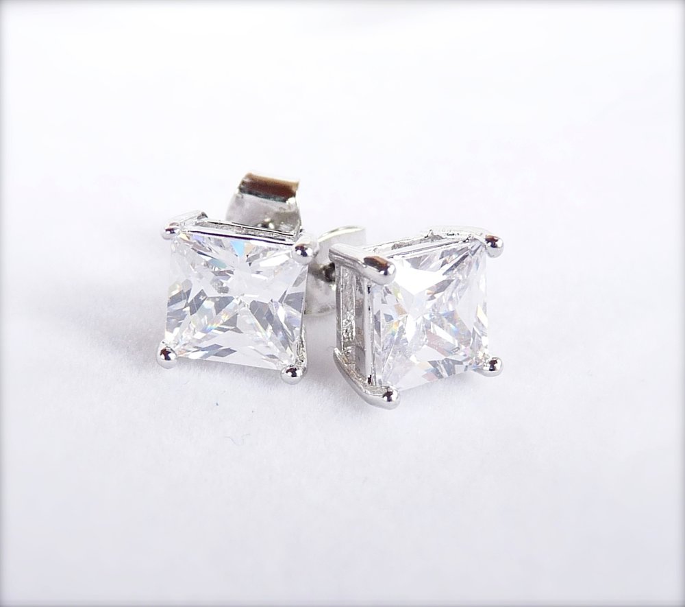 Classic CUBIC ZIRCONIA square cut studs, set in silver. 5/16" wide. (Little more than 1/4") These are your perfect "everyday" go to, but also blingy enough for that little black dress! Made in the USA.