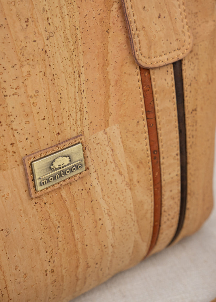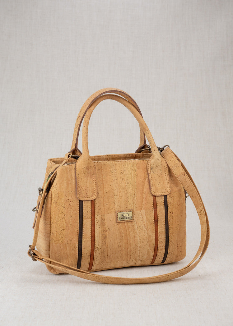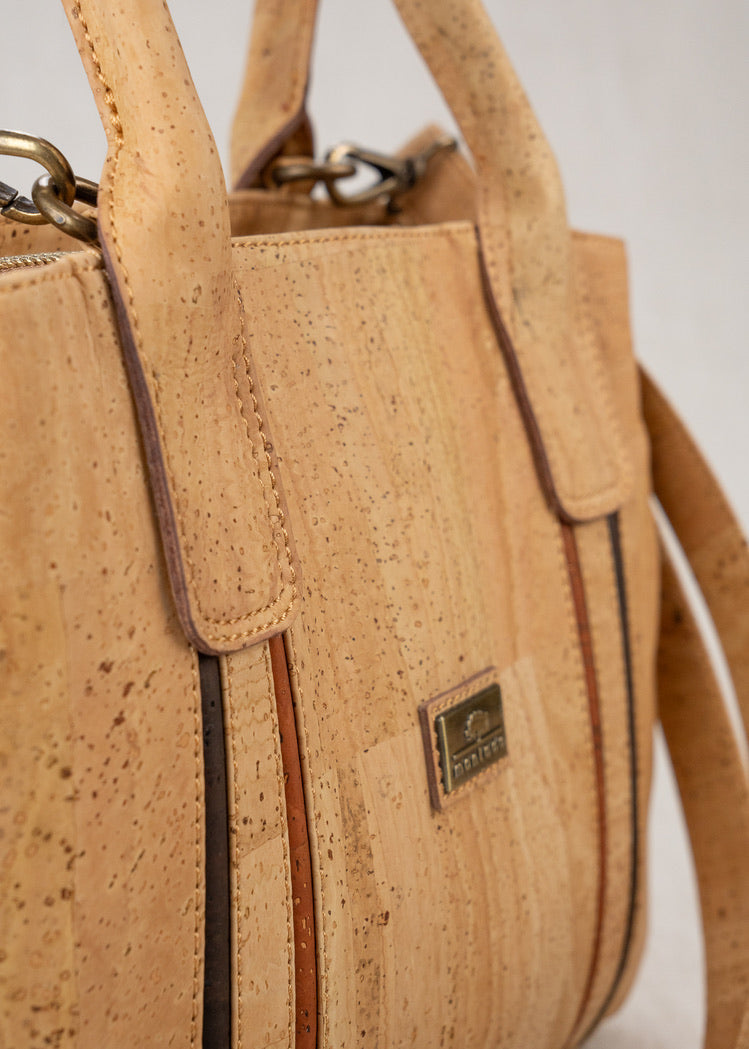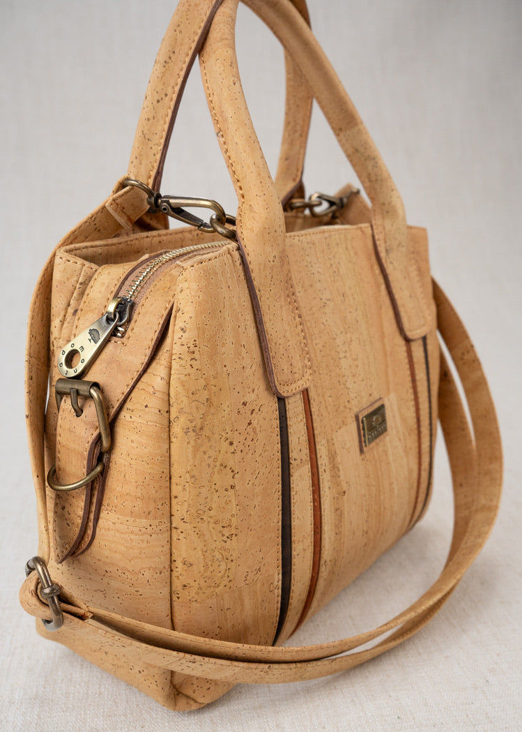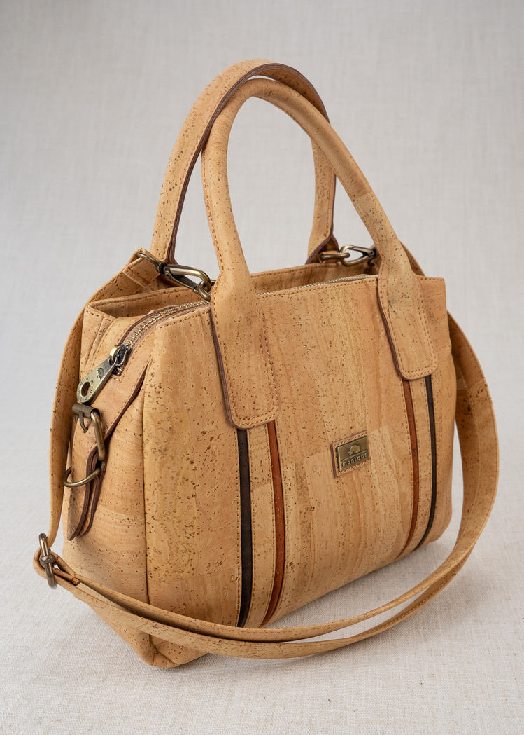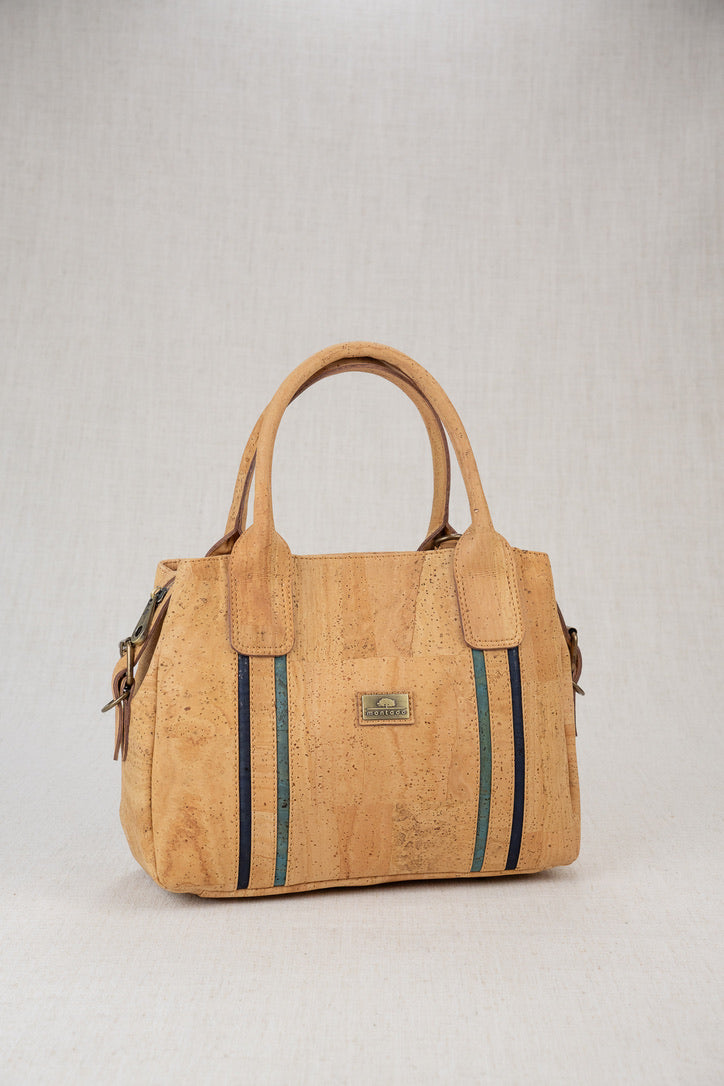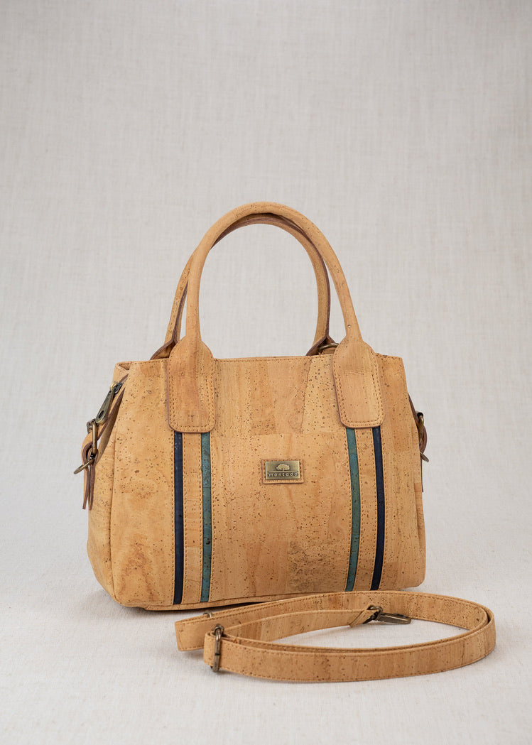 Beautifully finished with squared off handle tabs, inset colored cork stripes, and a buckle embellishment on the side.