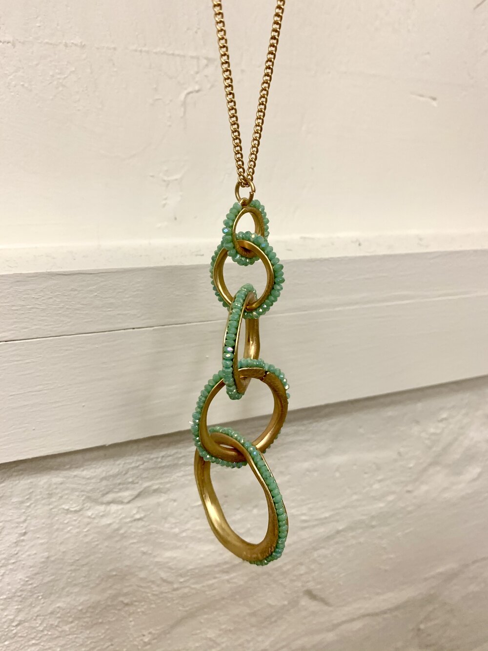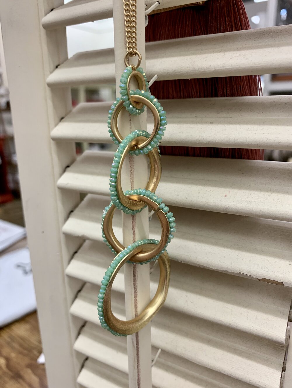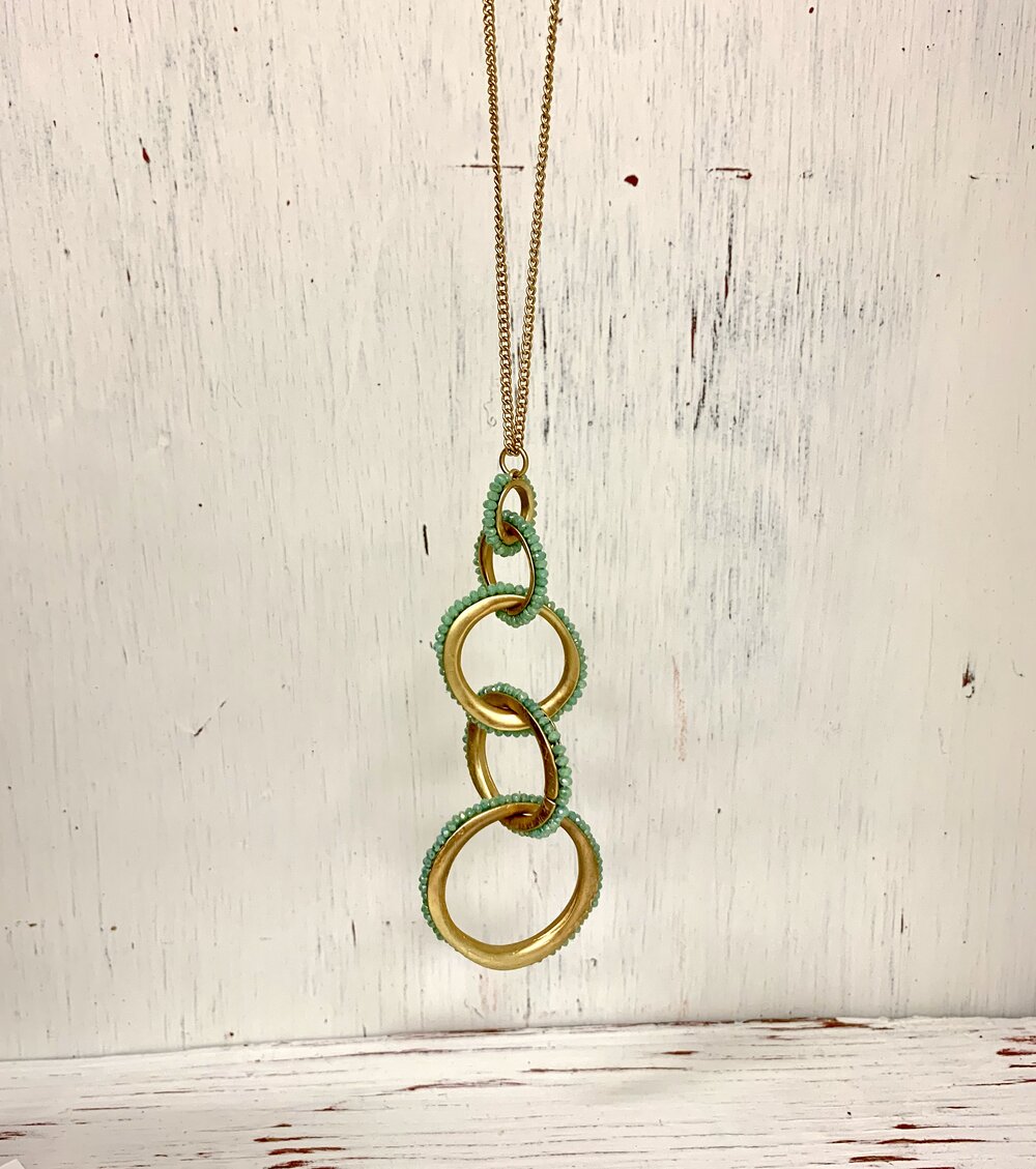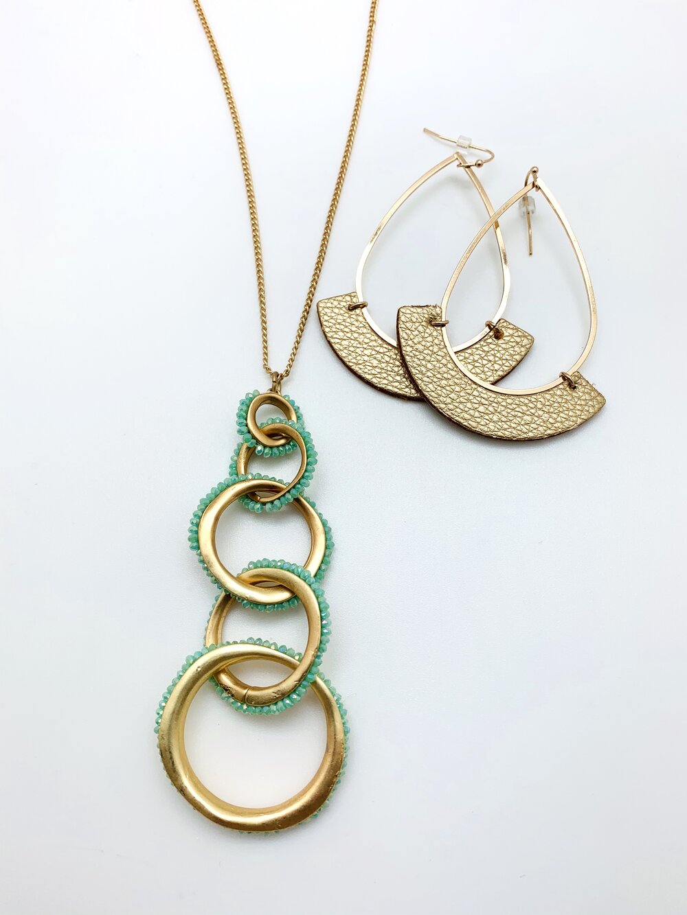 There is something about this necklace that just makes me happy. Matte gold and light sea foam green organic circles on a 32” chain is somehow a good mix of classic, new and unique. Be a standout with an Elisabetta. Embolden your statement with a pair of gold Capetown earrings.