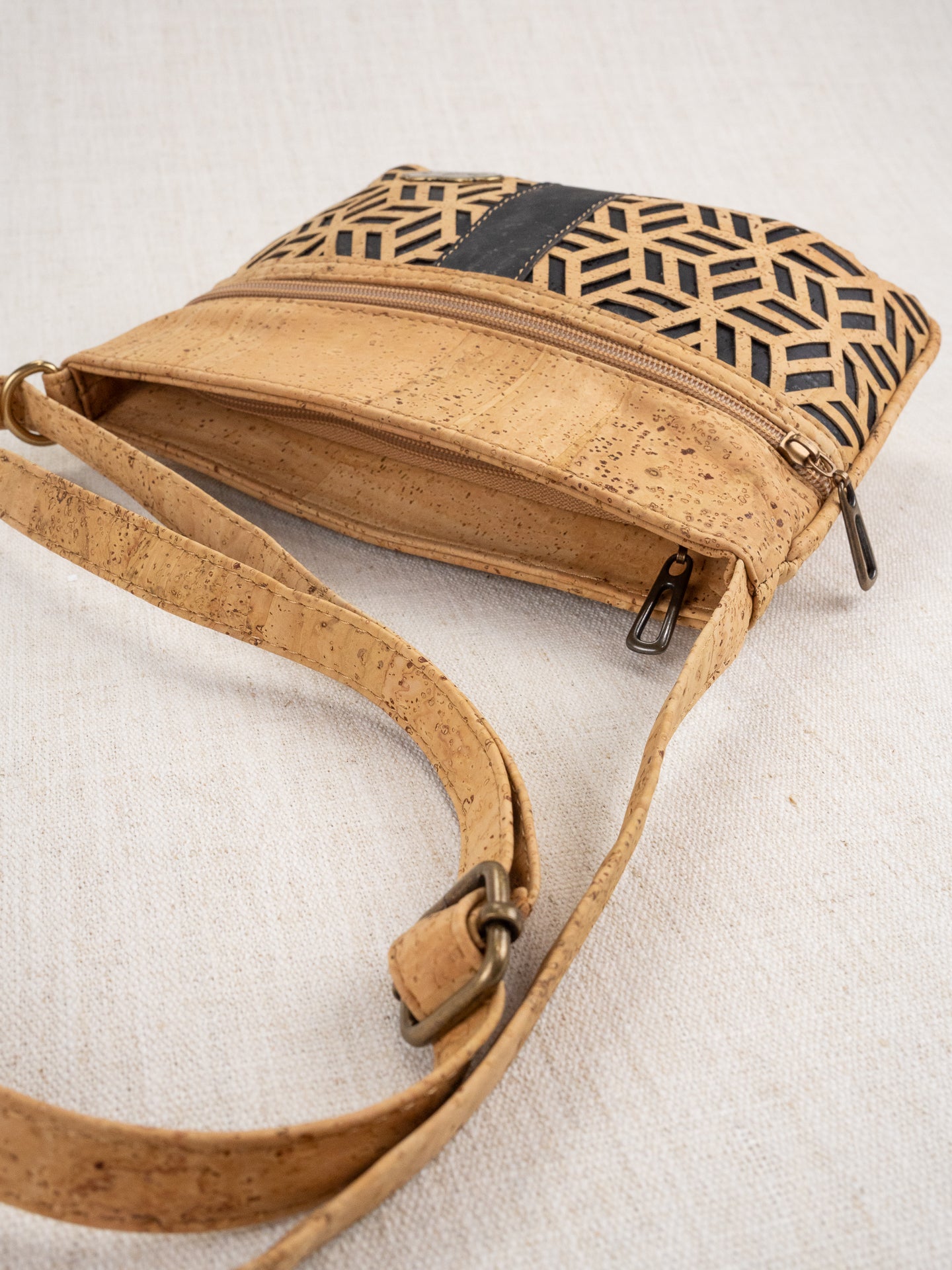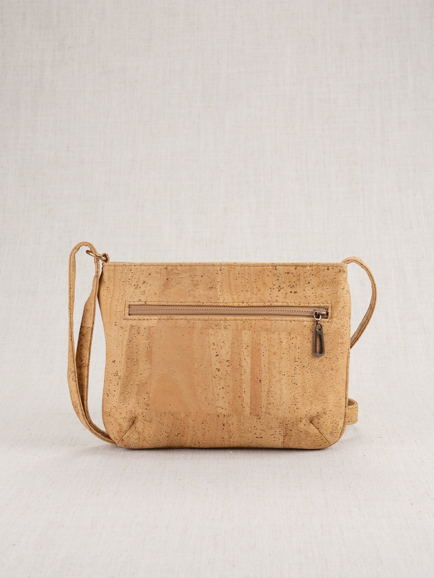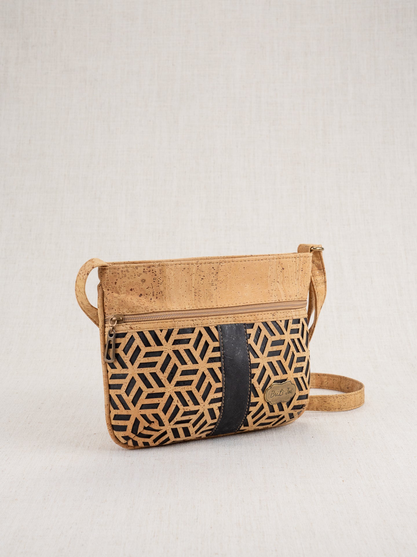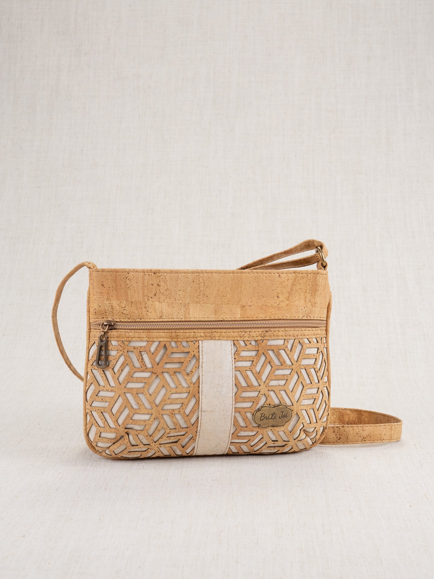 Everlee (Laser) is small, but with an elegant quality! 10x7.5x2 still affords you an extra front pocket zippered compartment, one on the back, one back inside, and a cork pocket inside front. Natural cork and laser-cut cork over color makes a stunning contrast! Adjustable shoulder strap.