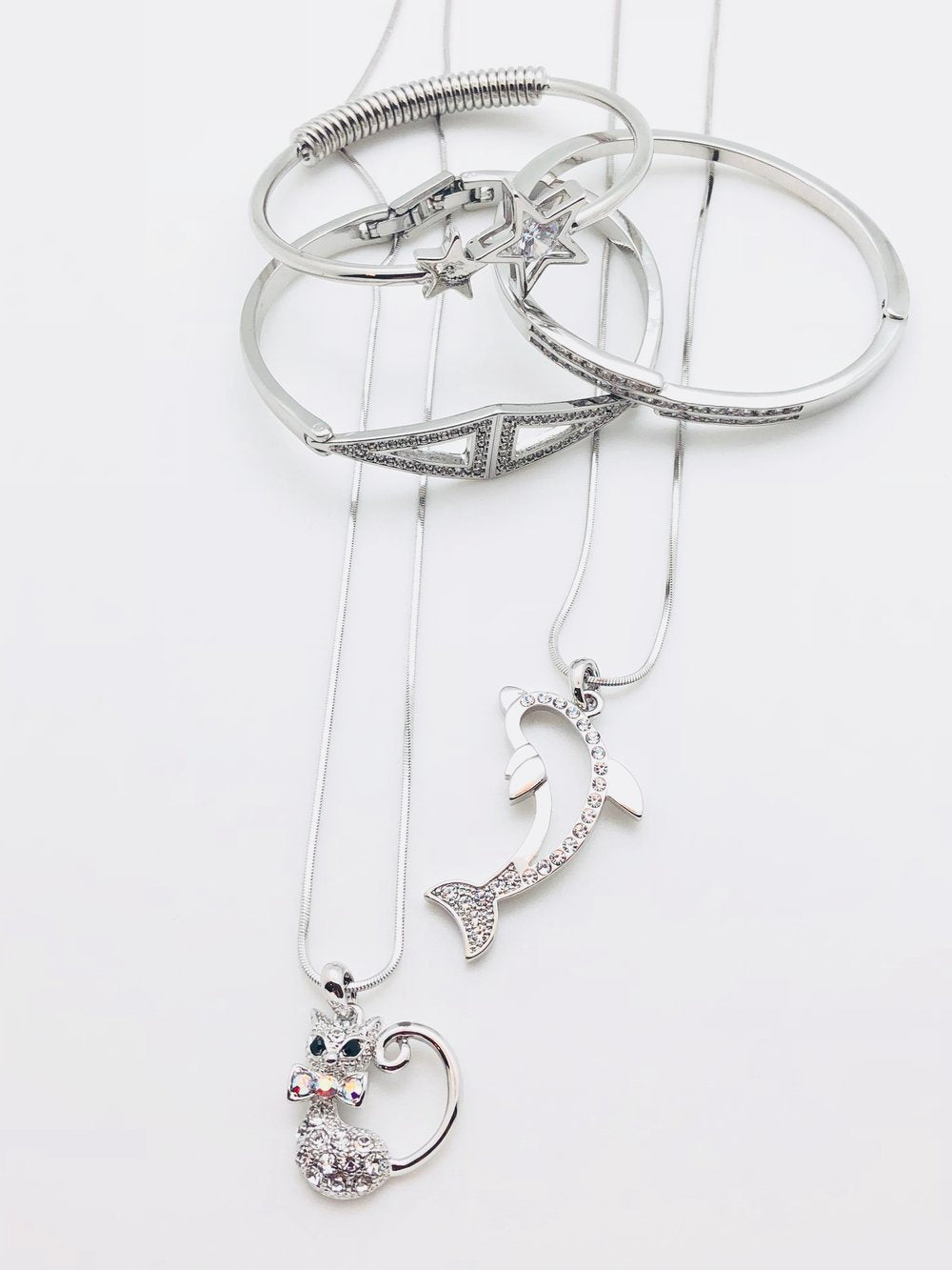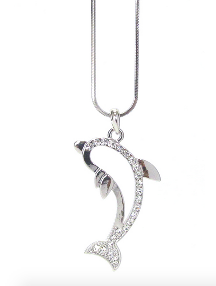 White gold pated 1 1/2" jumping dolphin with just enough bling! Hangs on a smooth 16" chain. Add a Starlight bracelet.