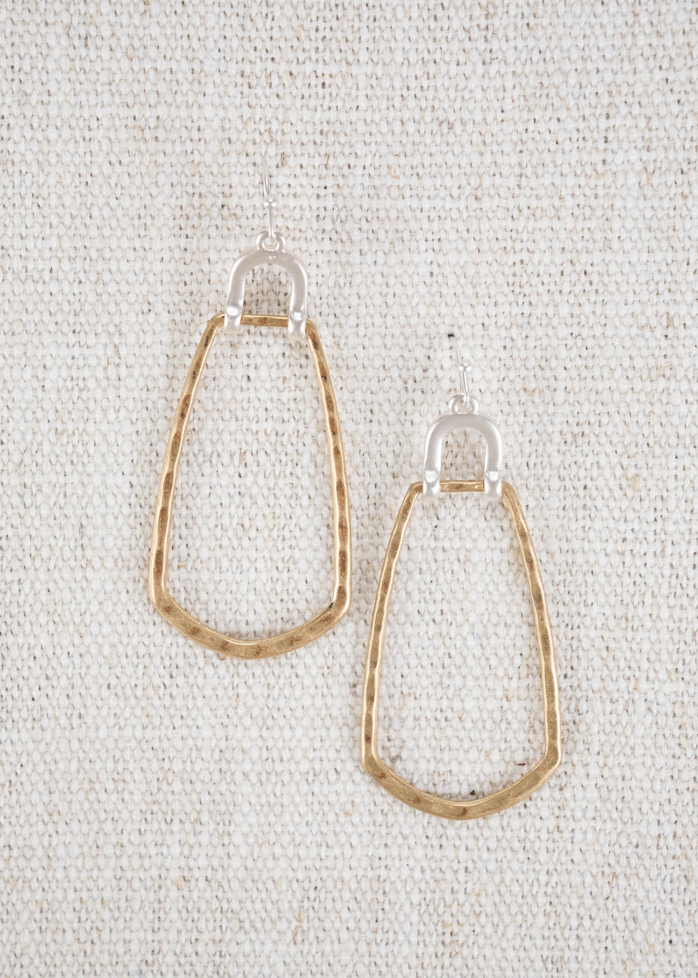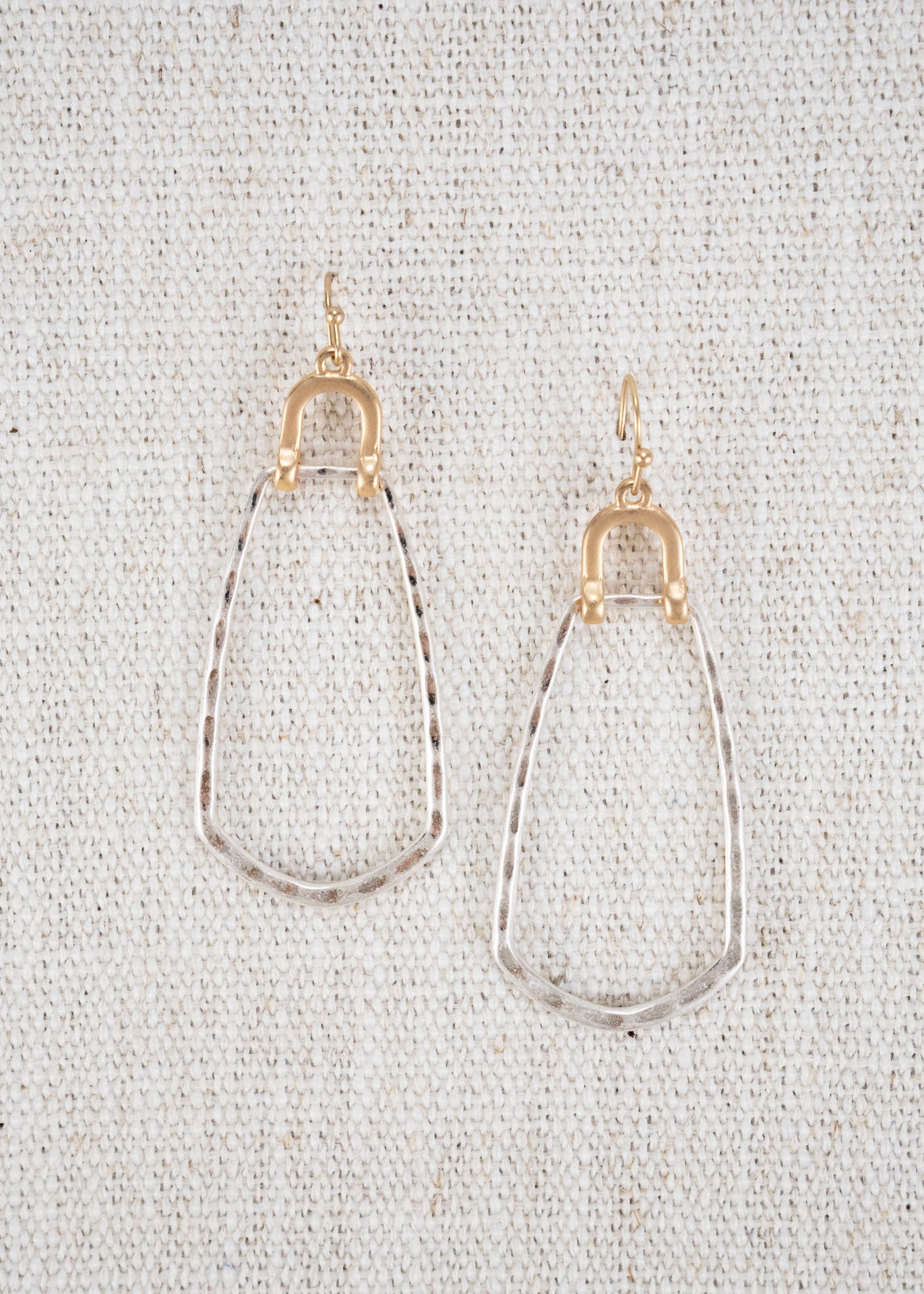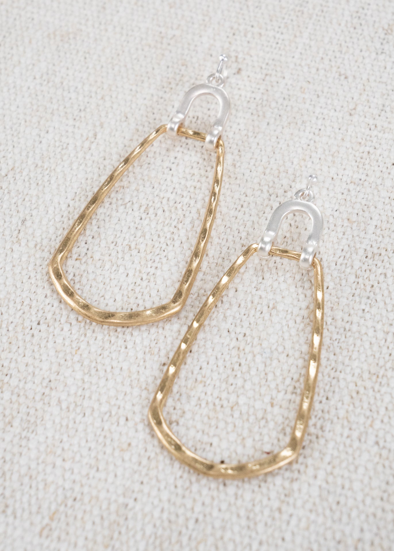 Great mix and match earrings! They hang 2.5" from a shepherd hook, and you can choose if you want to accent the gold or bring out more silver. "Beveled" bottom and smooth matte horseshoe shape at the top.