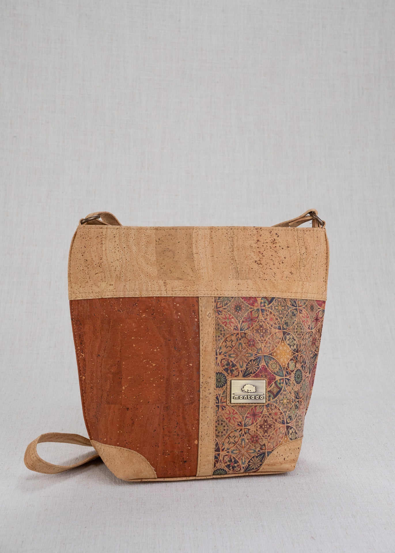 It's a two way street. Chocolate and tobacco, or camel and mandala...? Nice little tote with a wide bottom to hold more! 12.5' at the widest, 11" tall, 5" bottom, with feet, because it's just cute like that. Zippered pocket on the back, inside back zippered pocket, inside front drop in pocket. Adjustable strap.