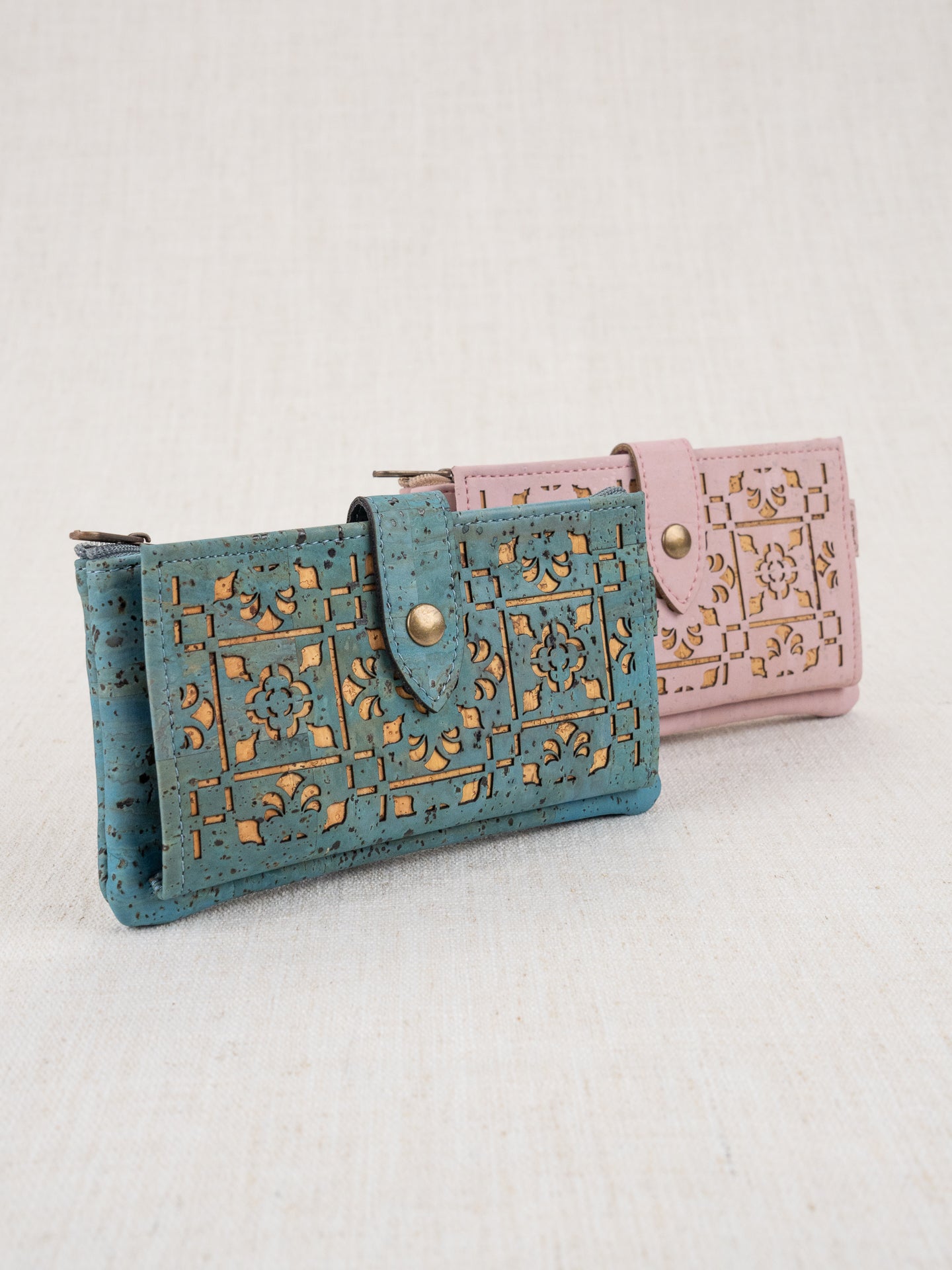 Our medium sized wallet - Jenn. Now RFID protected! She measures 6.5x3.5”, gives you 8 slots for credit cards and a little hidden pocket in the snap compartment. Zippered compartment has plenty of room for bills and change. Our lasered version is fun on it's own, with coordinating colored bags, or with matching lasered purses.