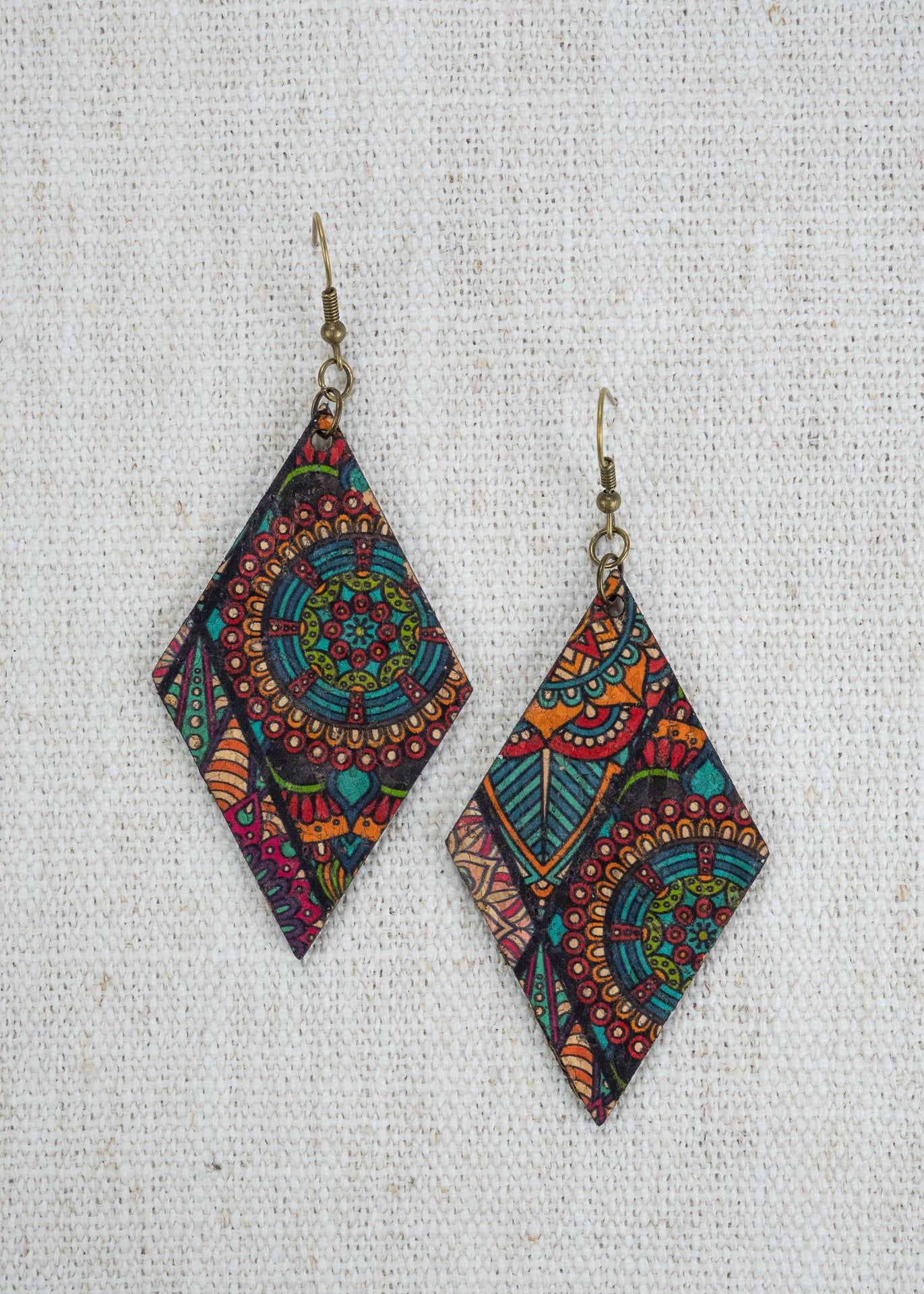 Katia is a double sided earring that measures 2.6" point to point, and approximately 3.4" hanging length. All are cut from the same fabric, but highlight different colors present in the design. Hardware is burnished brass. Hook.