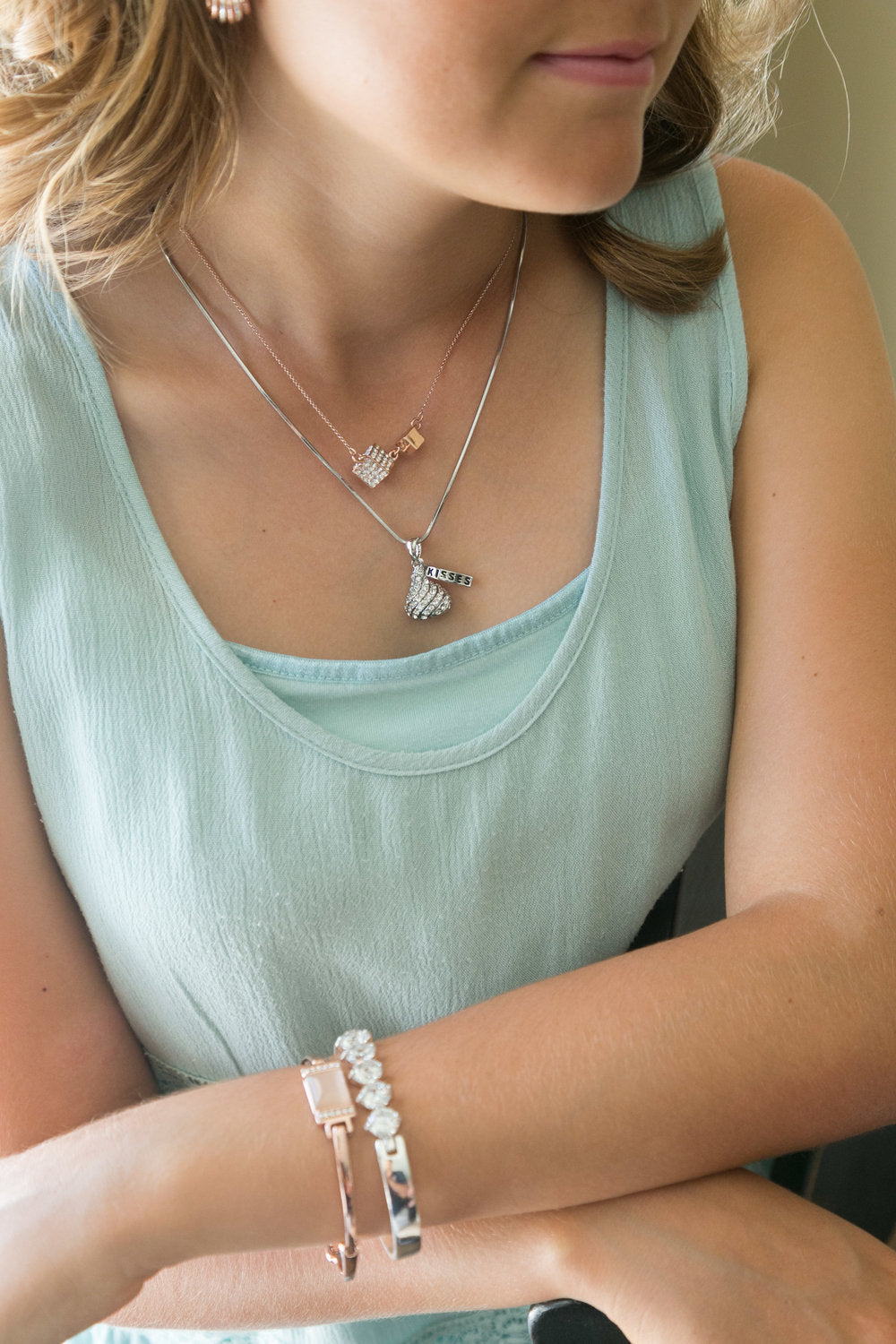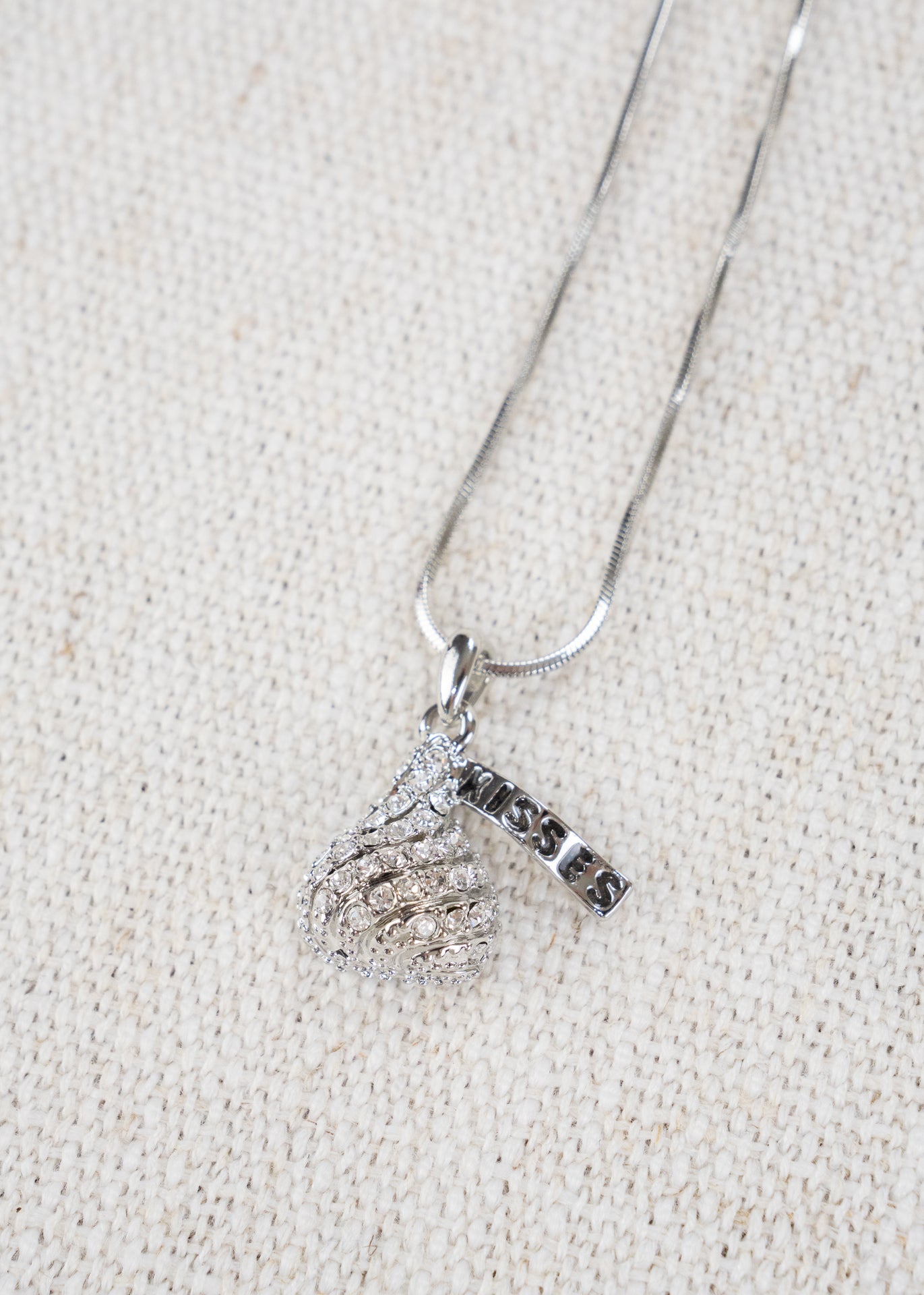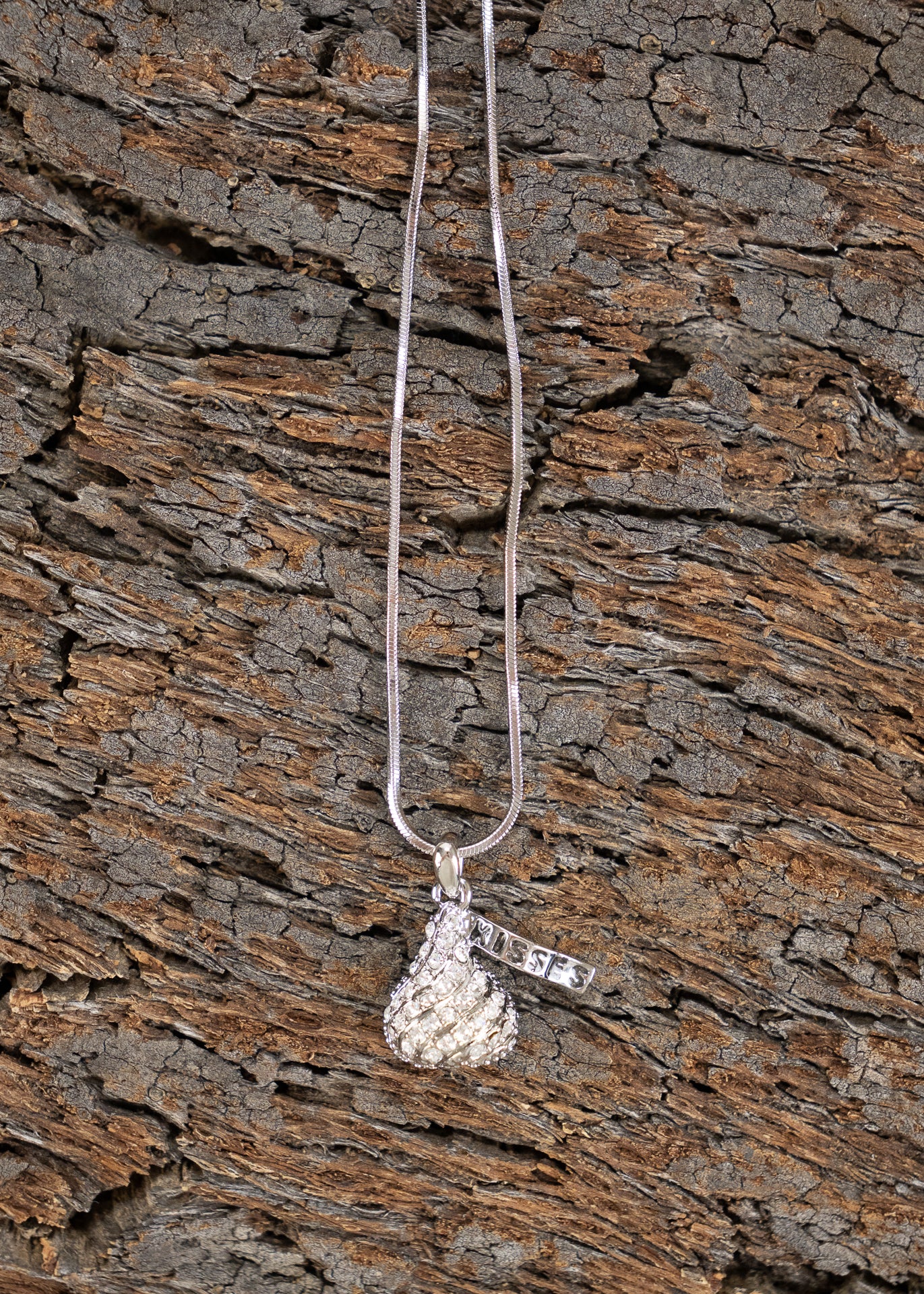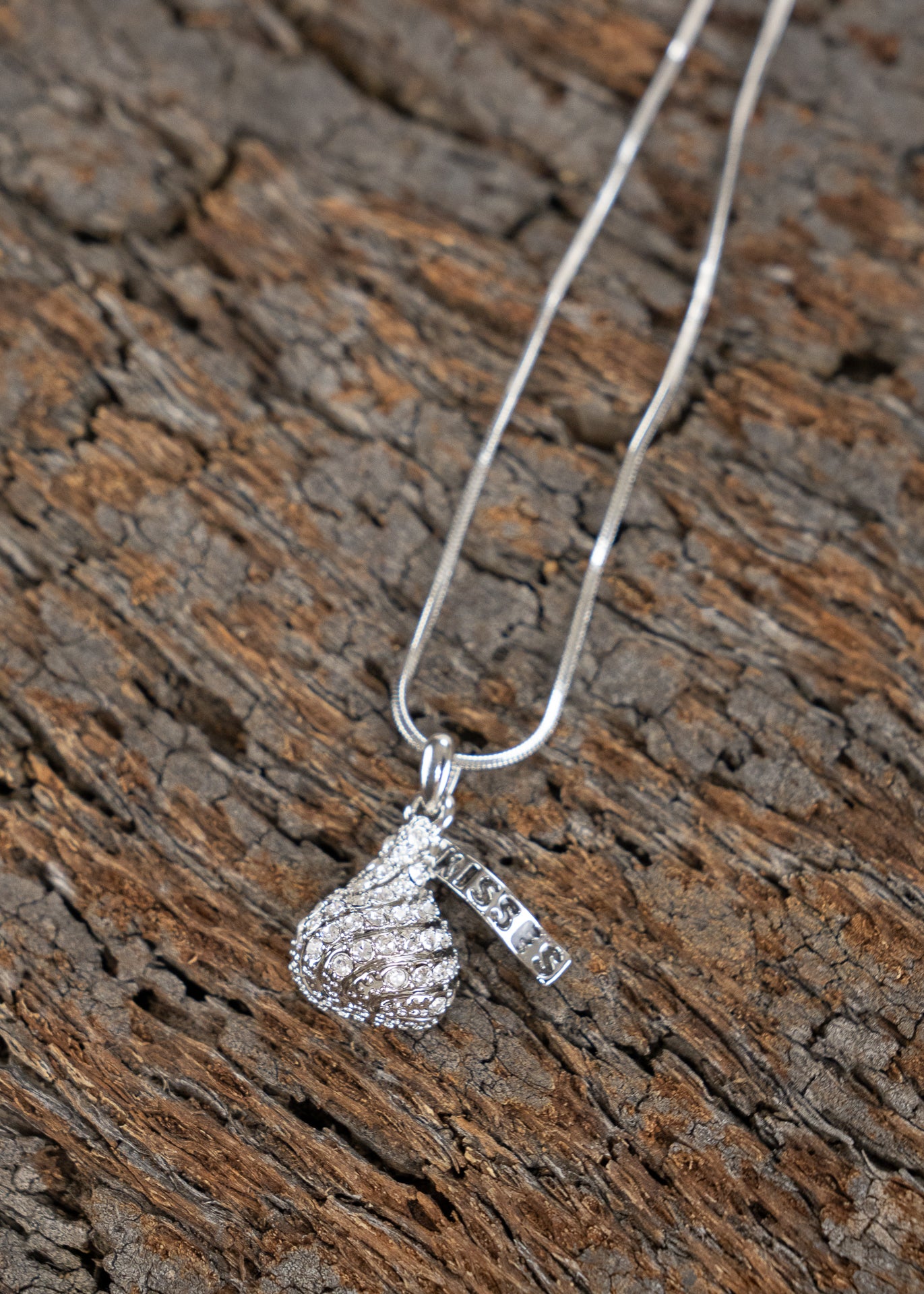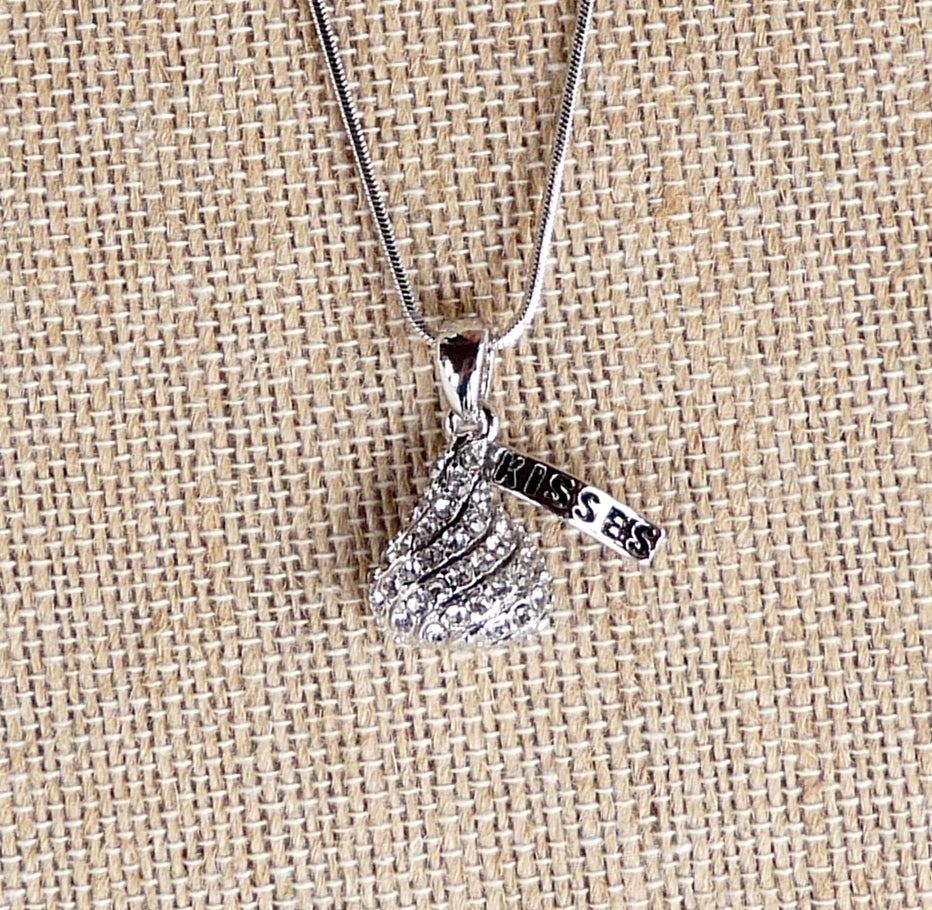White gold plated, 16" (plus extension) necklace with a crystal encrusted "chocolate" kiss! Mother's Day, for sweetheart, daughter, chocolate lover.