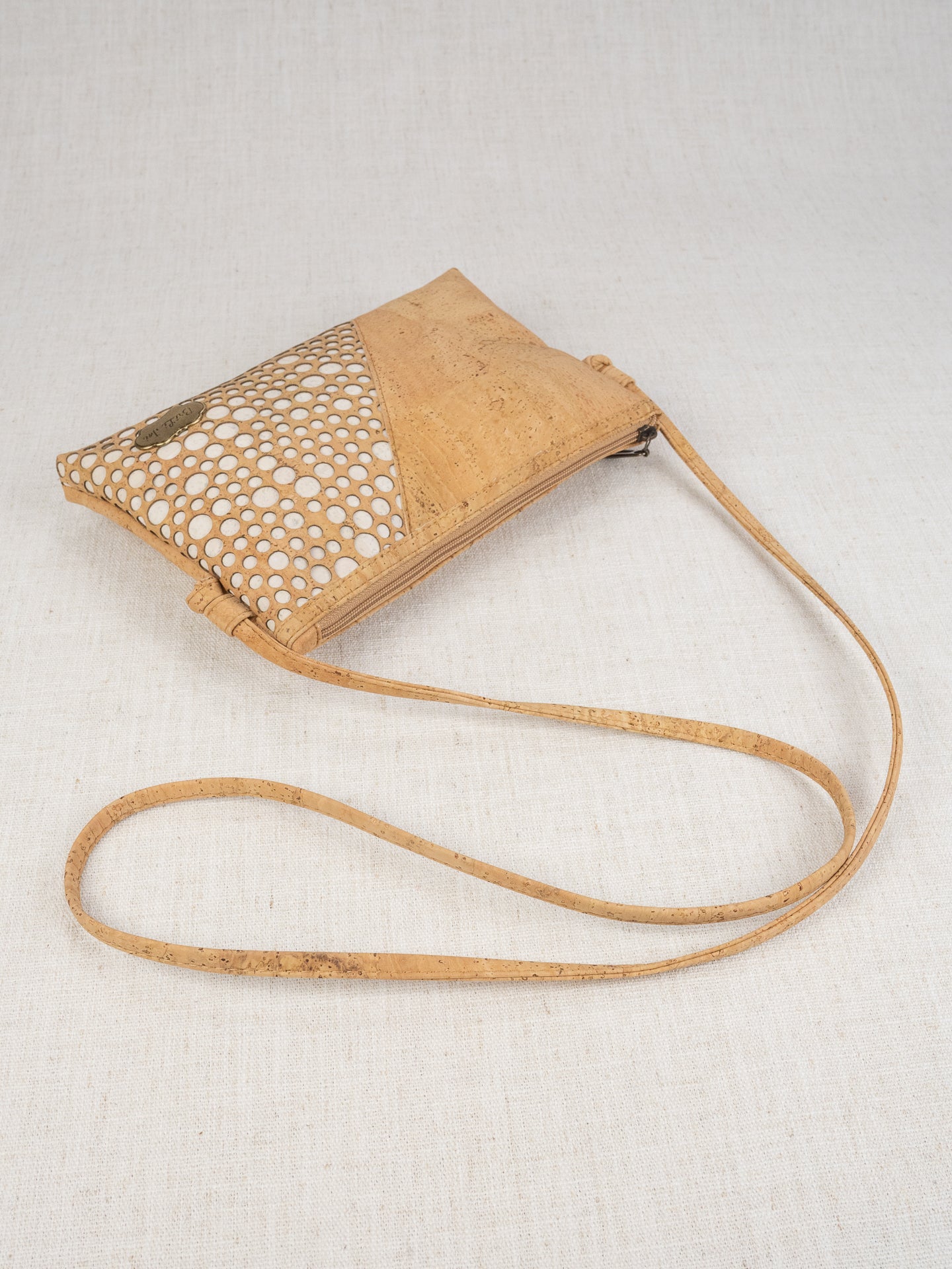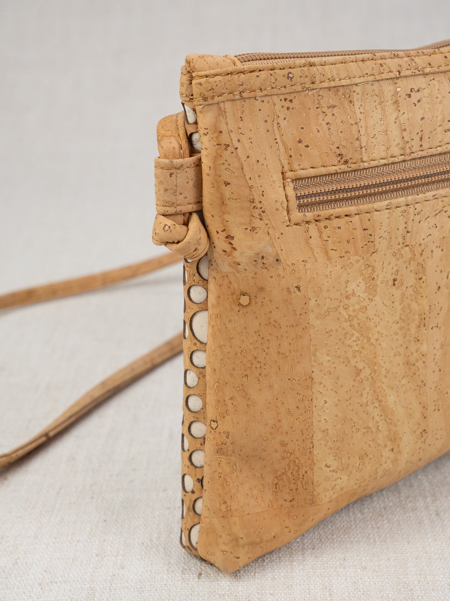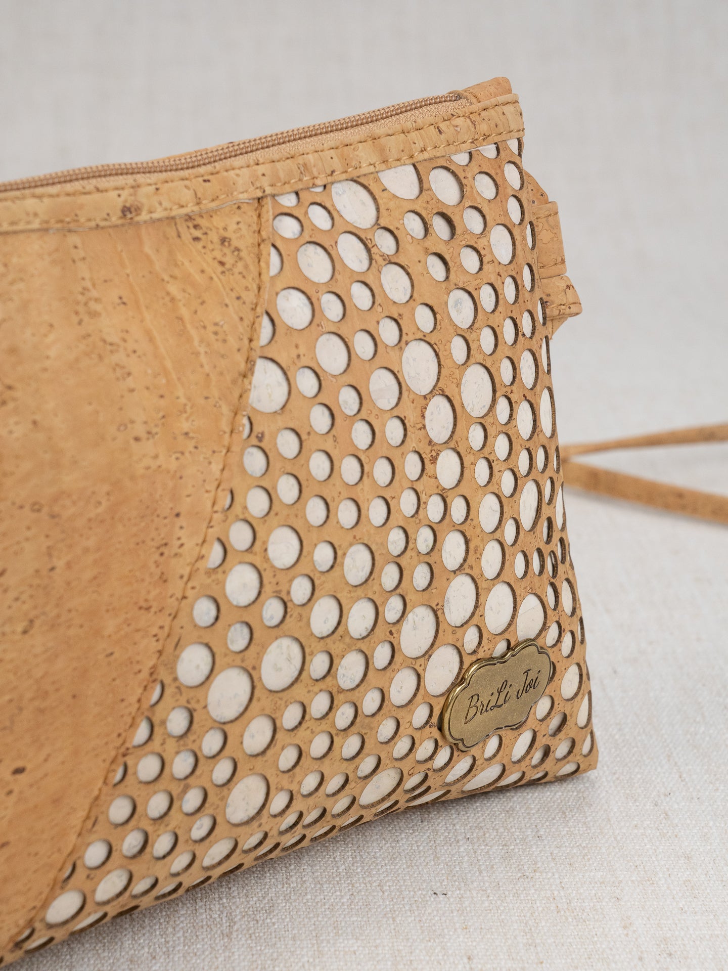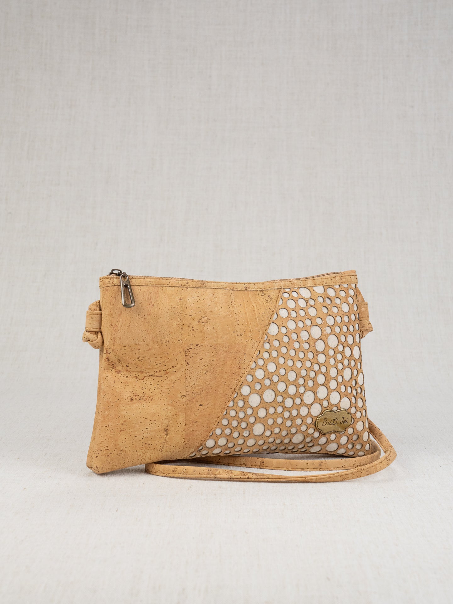 It's just fun! Laser cut layer of "bubbles" that shows the contrast color underneath. Laguna measures 11"x7", with an outside back zippered pocket large enough for just about any phone, and inside back zippered pocket and an inside front drop in pocket. Like any of our knotted shoulder/crossbody straps, if it is too long, you can pull down on one side, re-knot tightly, and cut off the extra.