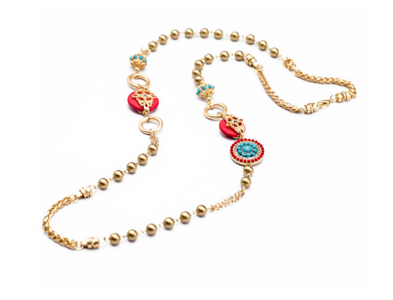 Salena is 38” of beautiful matte gold, coral-red and turquoise intrigue. It’s charms are decorative on both sides, so flipping doesn’t matter. What a super piece to bring a bright spot of color to that summer sun dress or your crisp white shirt with your favorite boyfriend jeans! Check out some great pairing pieces! Earrings: Worn Gold Teardrop, Merrikesh Bracelets: Alexandra, Midas Touch