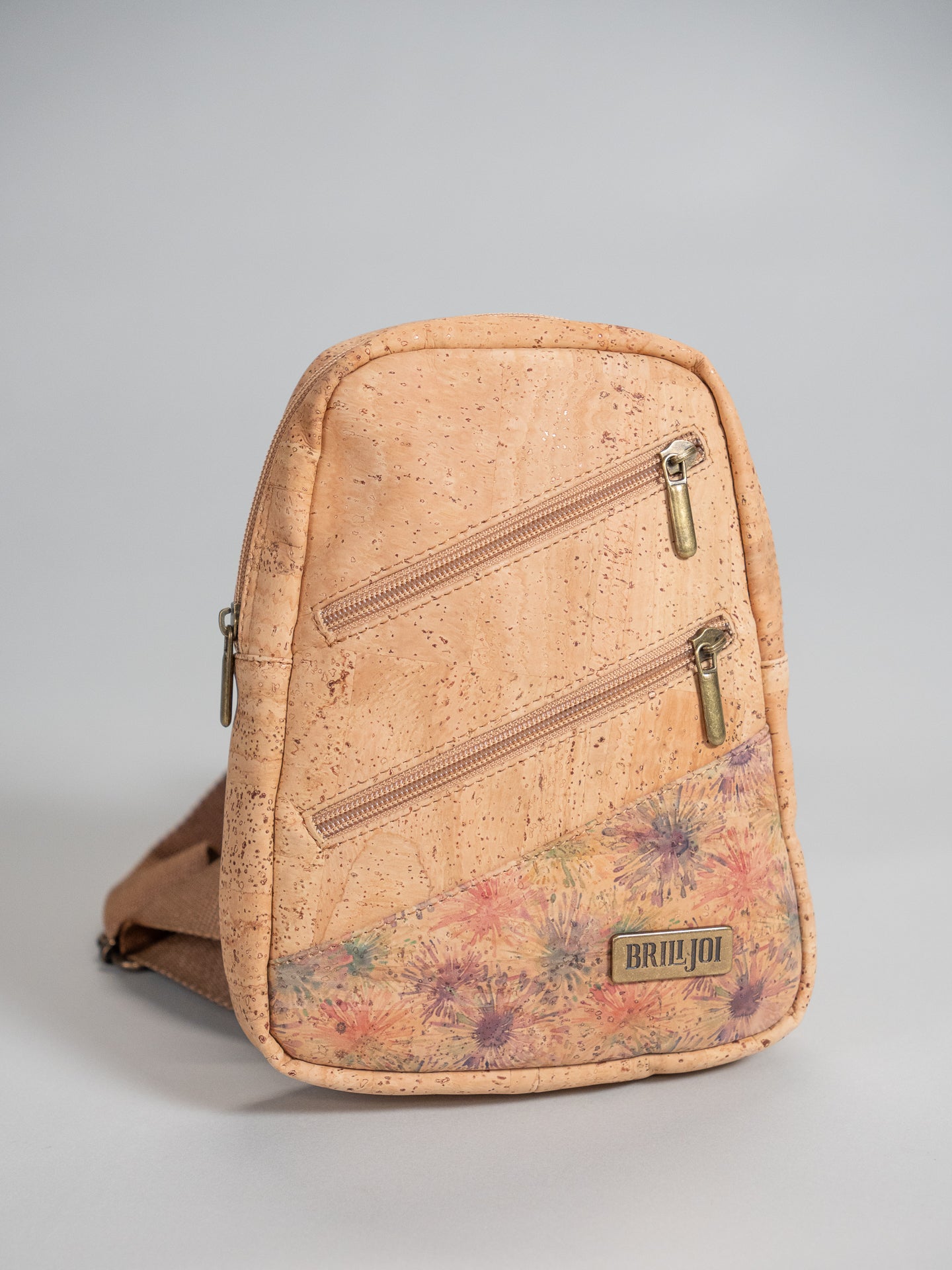The perfect little "bum bag"! This front facing sling bag measures 9"x7", with the oh-so-handy top zipper at the ready for the main compartment. Both front zippered pockets are approximately 4.5" deep (and the width of the bag), and has another 6"x5" zippered pocket on the back. The soft, wide strap is easily adjustable.