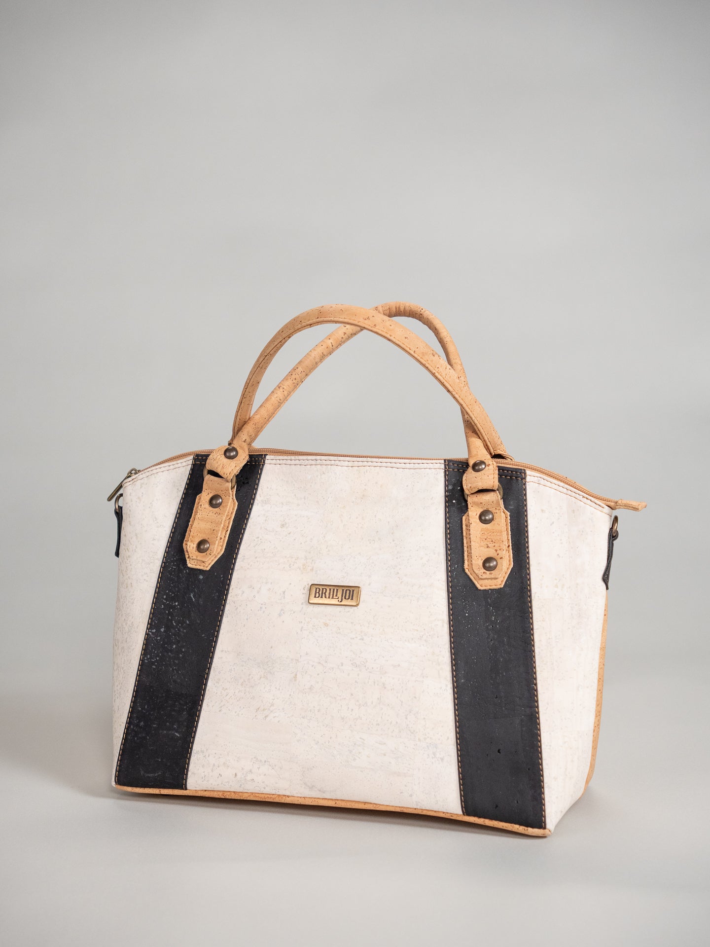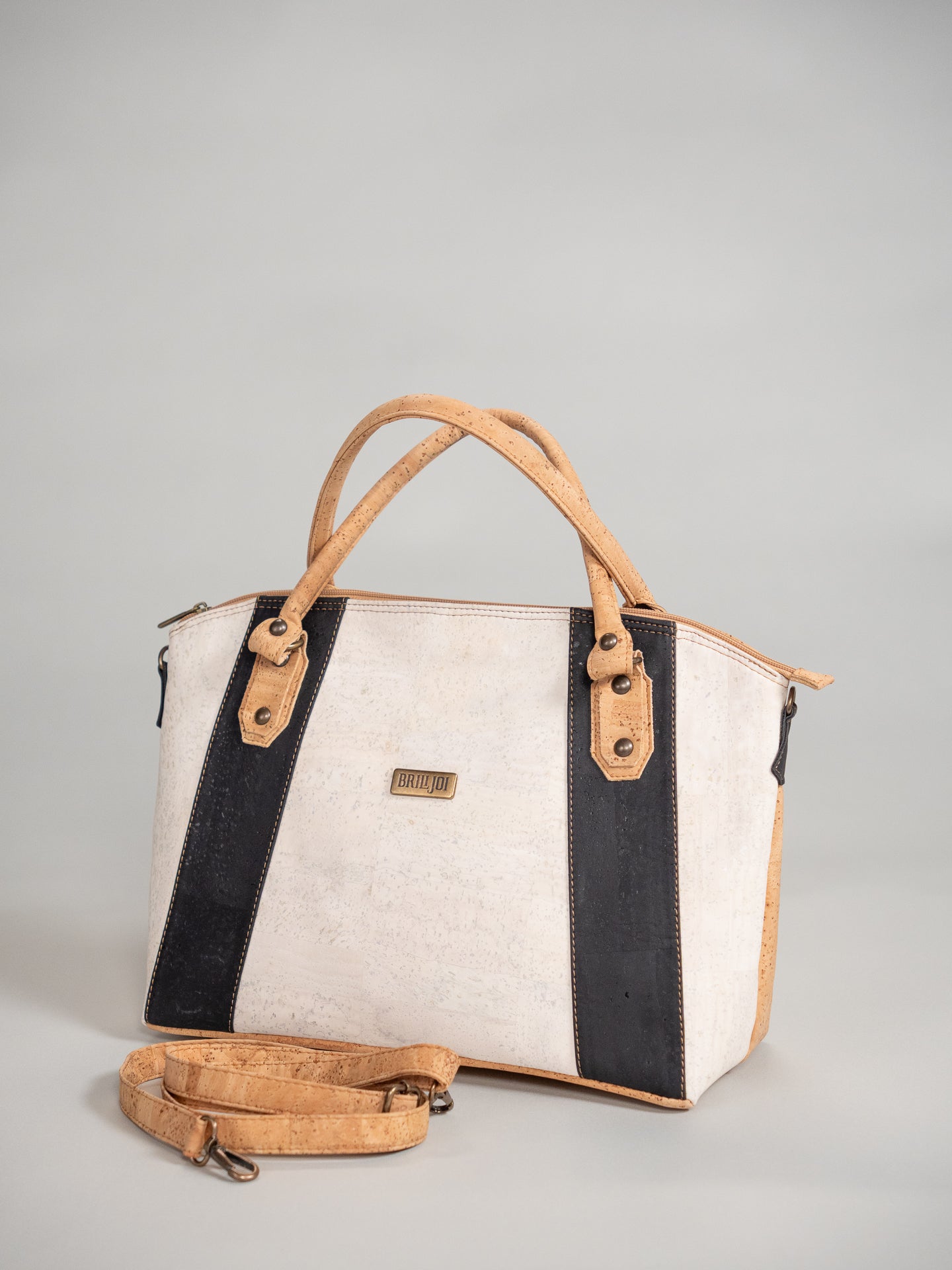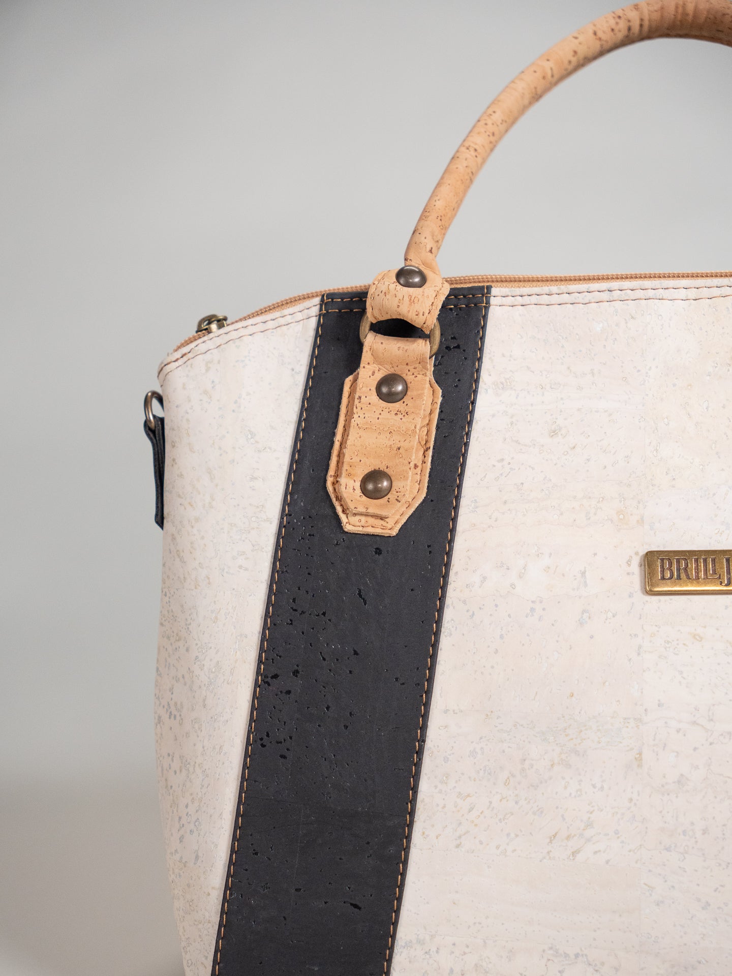 Classy Marcella! 16x10x5.5", semi-structured, class for summer or winter with cork white and black. Back, bottom and accents in natural. Outside back zippered pocket, inside back zippered pocket, inside front zippered pocket. Adjustable, removable shoulder strap, feet.