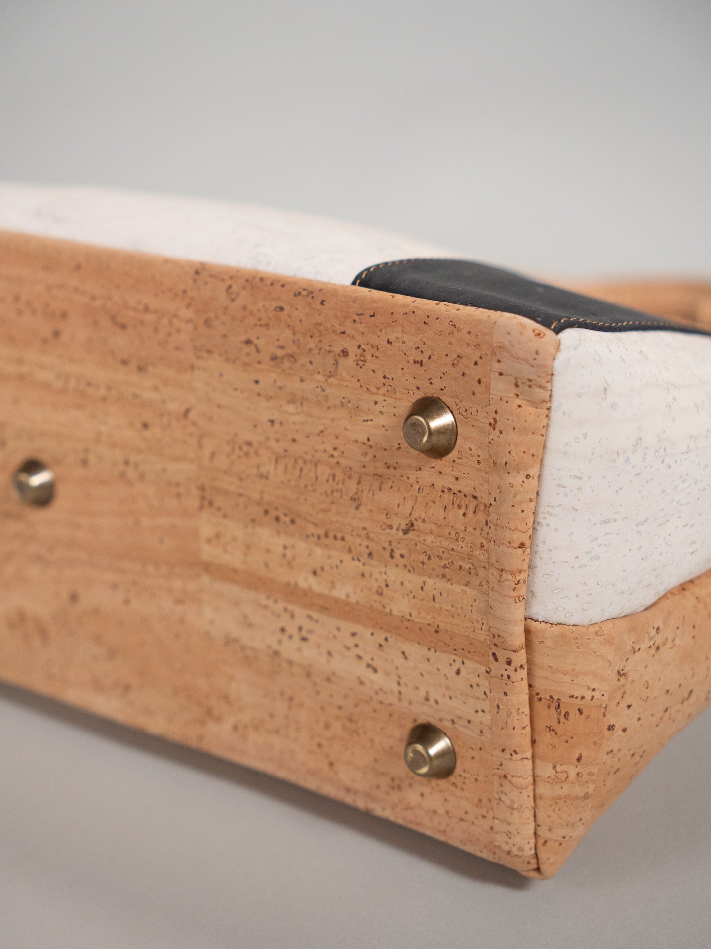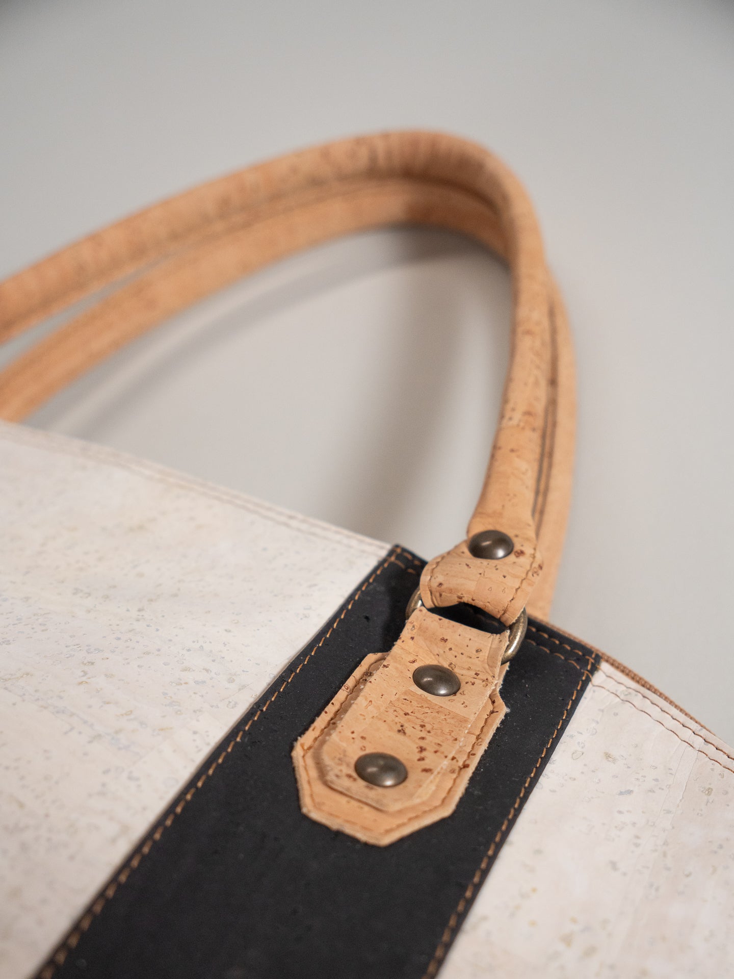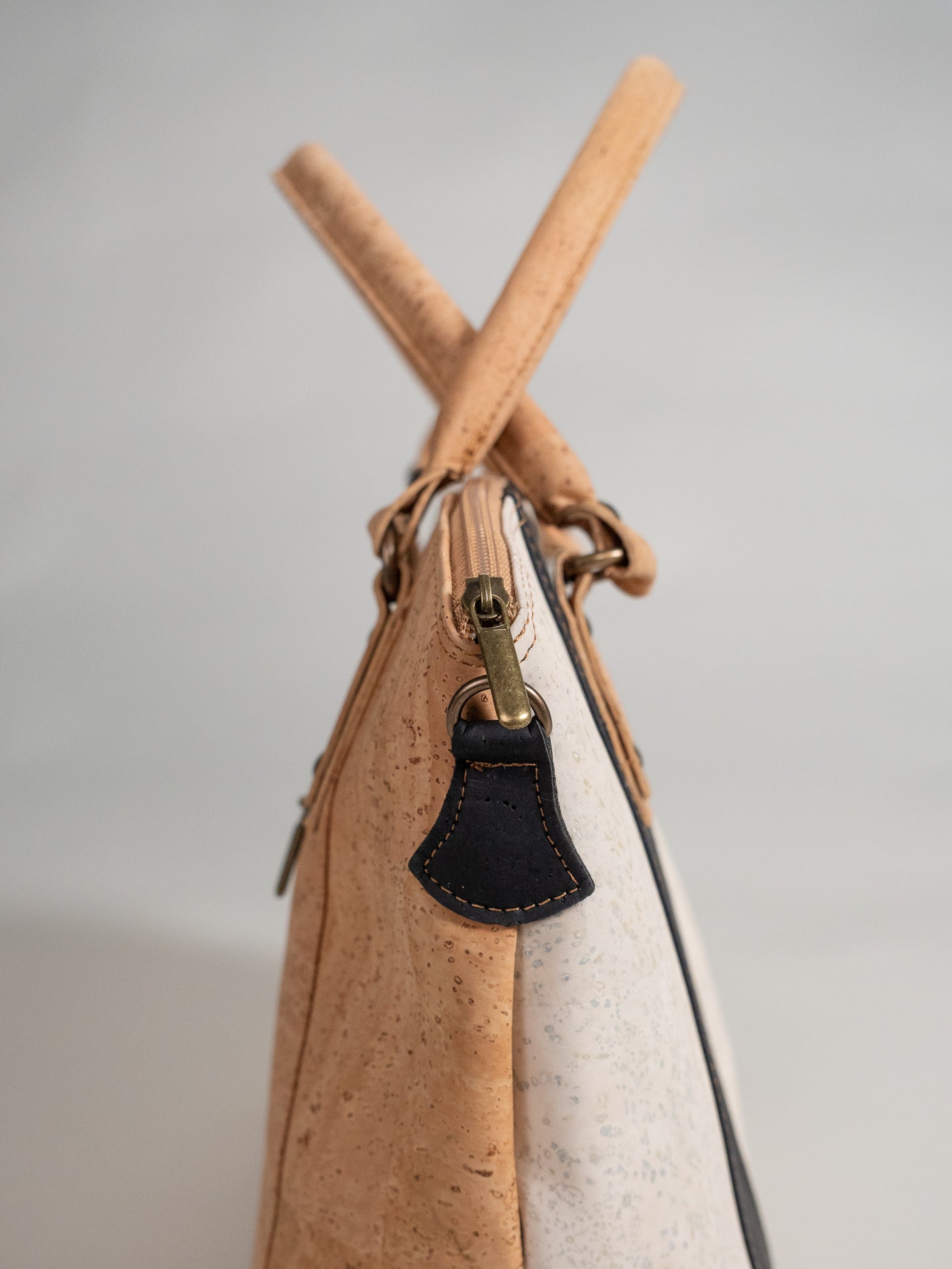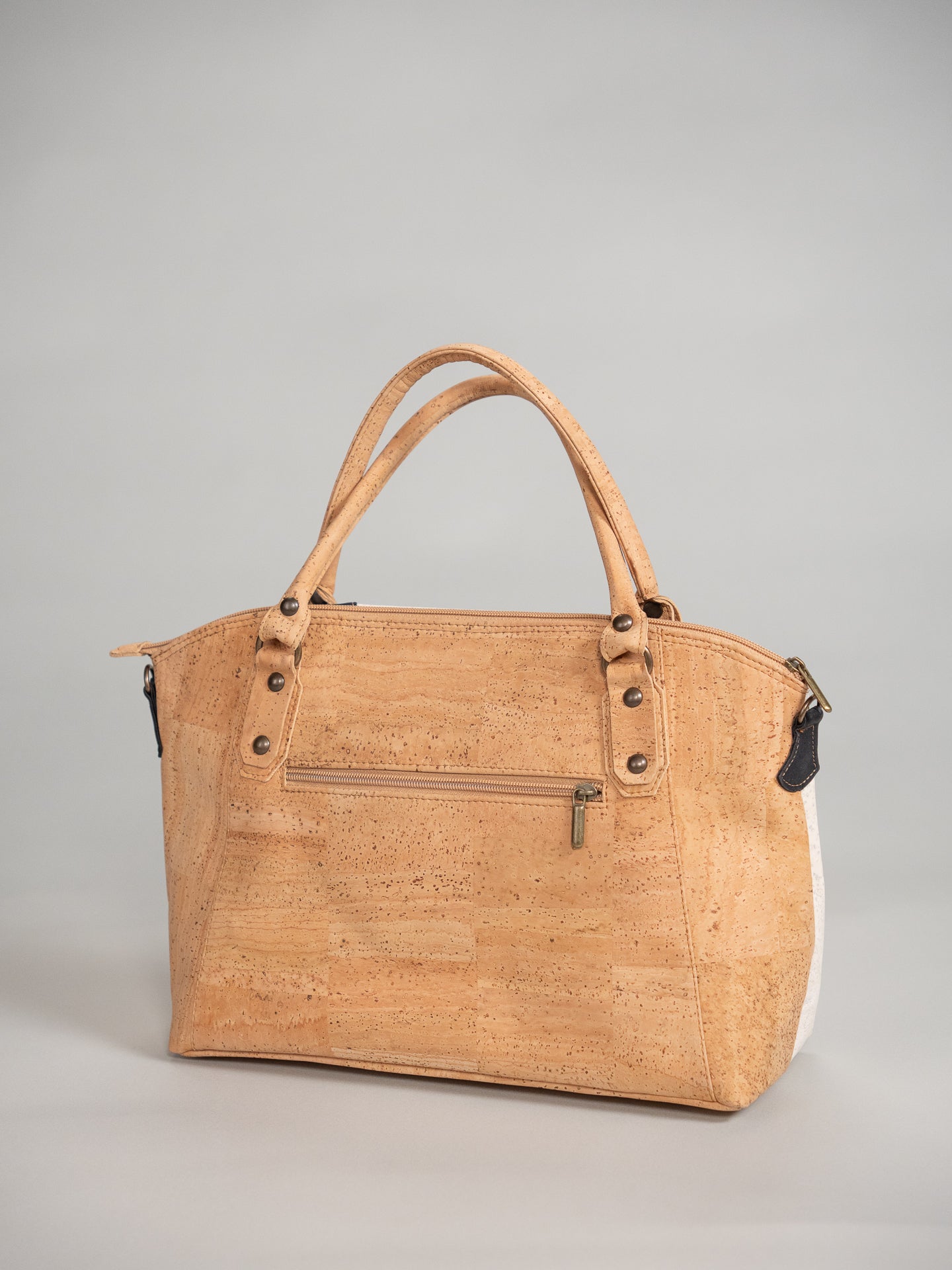 Classy Marcella! 16x10x5.5", semi-structured, class for summer or winter with cork white and black. Back, bottom and accents in natural. Outside back zippered pocket, inside back zippered pocket, inside front zippered pocket. Adjustable, removable shoulder strap, feet.