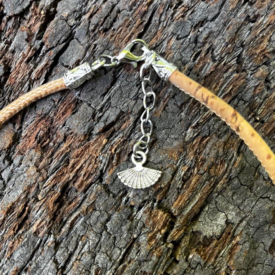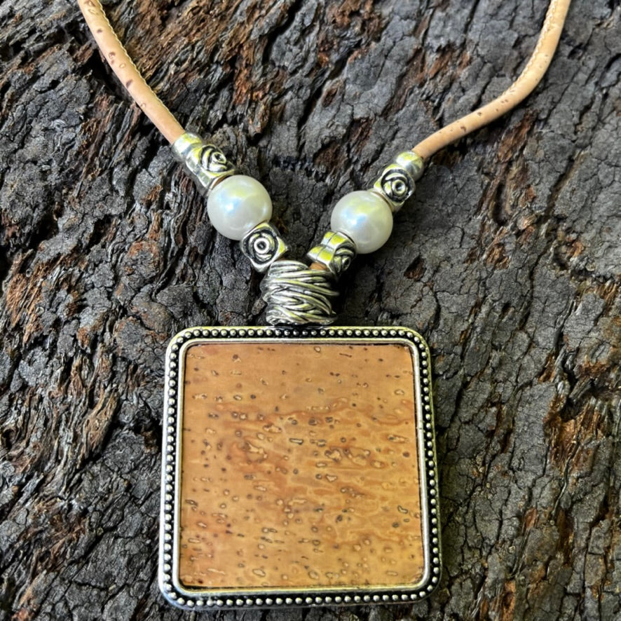 Reminiscent of BriLi Joi's first ever piece of cork jewelry, the piece that started it all, the Mariana Pearl is a beautiful square piece of cork set in antiqued silver, embellished with faux pearls and floral etched beads. A little silver fan is used as a "finishing bead" for the extension. 21" long plus extension.