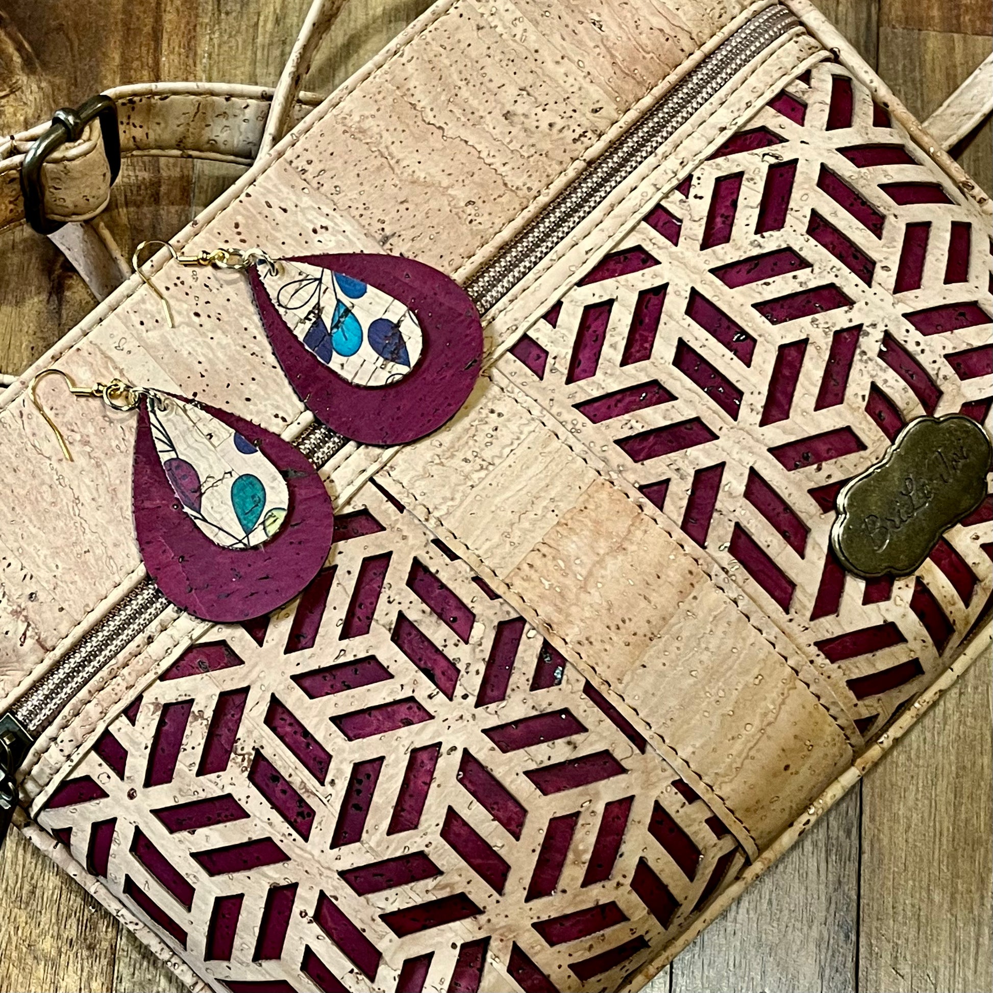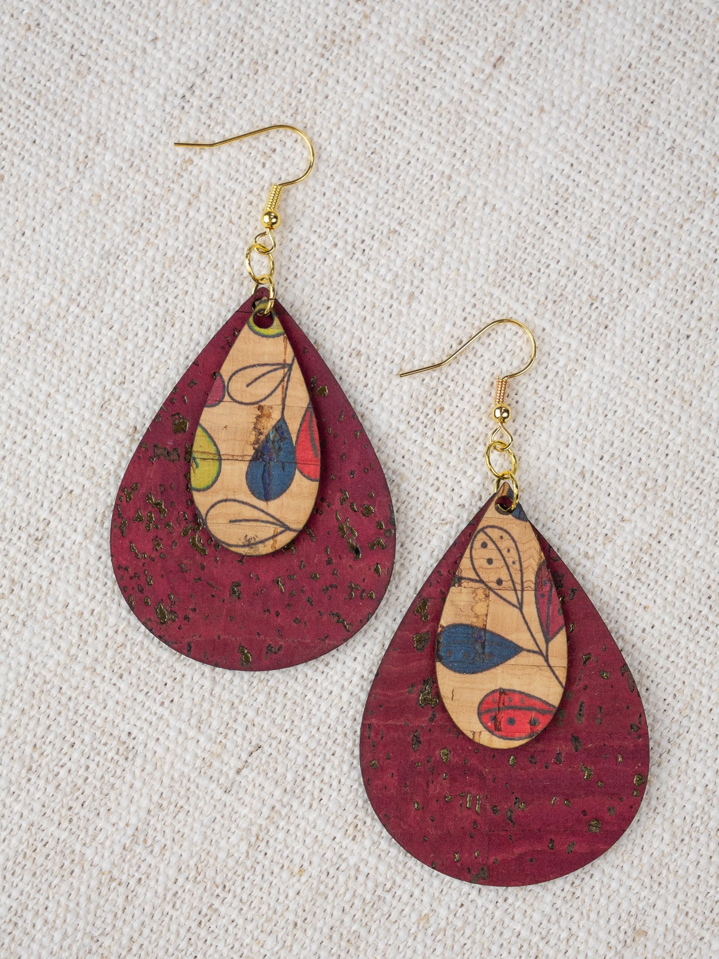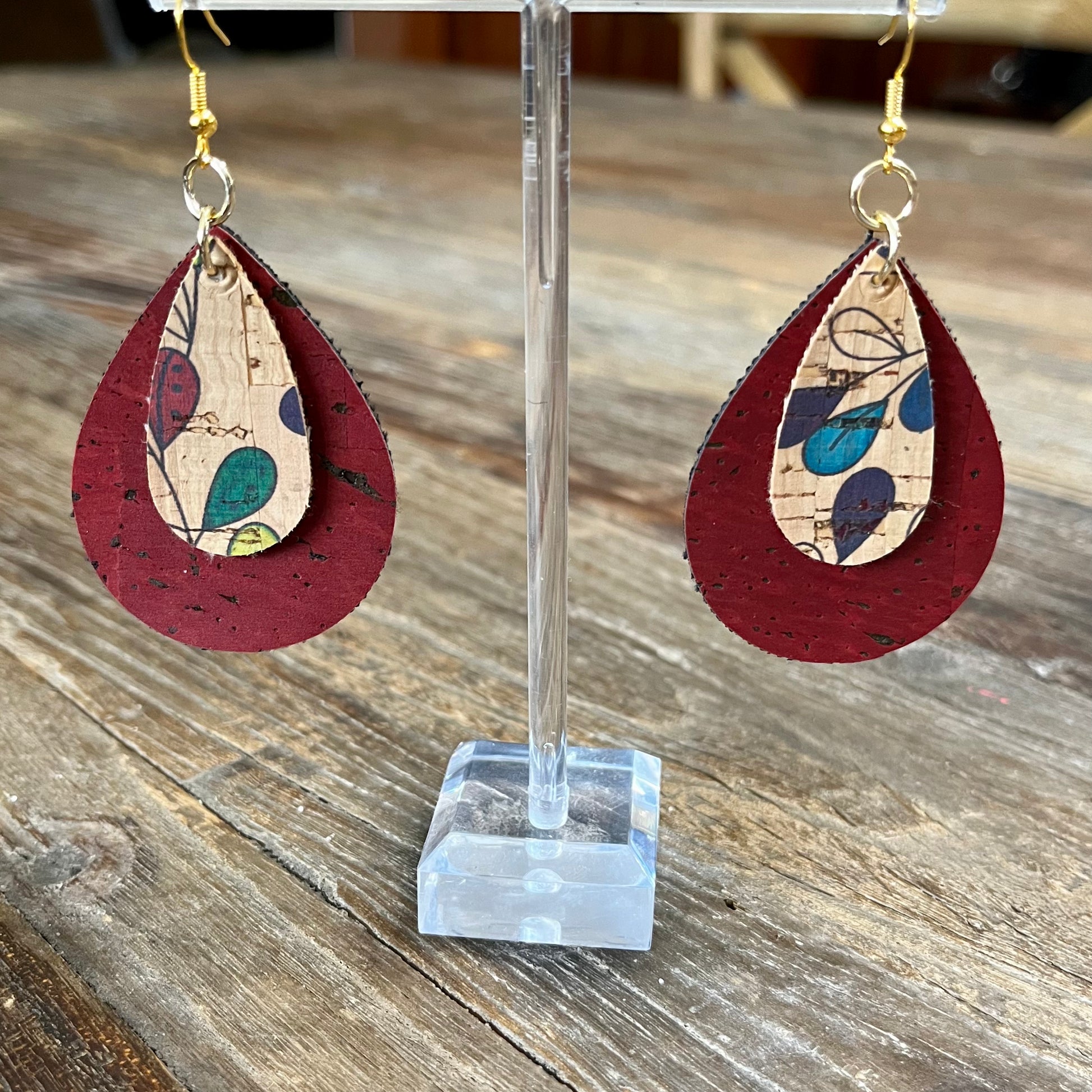 Hanging 3" (including the hook), Merlina is named for her deep wine color. Second layer on top has leaf design. You will not find an earring lighter in weight than one made of cork!