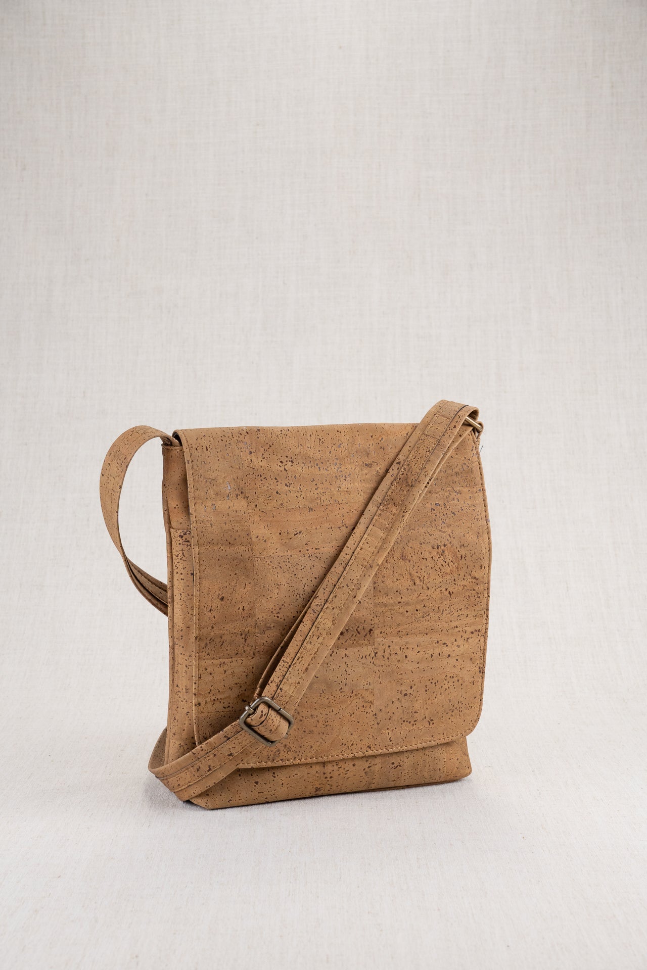 European Style man bag measures 11"x10"x3". Zippered outside back pocket or the front (under flap) drop in pocket are perfect for your phone. In the main compartment you have another zippered pocket and a cork drop in pocket. Lined in a lighter fabric to make it easier to see items. Double magnetic snap closure.