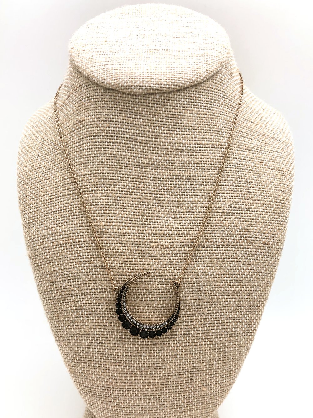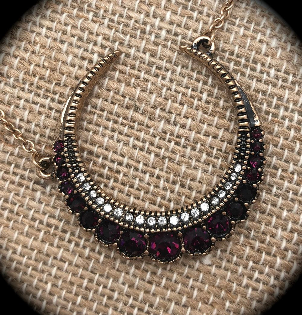 Antique gold 16-19" necklace has a deep purple moon shape that measures 1.25" across. Make it more stately with the Midas Touch bracelet.