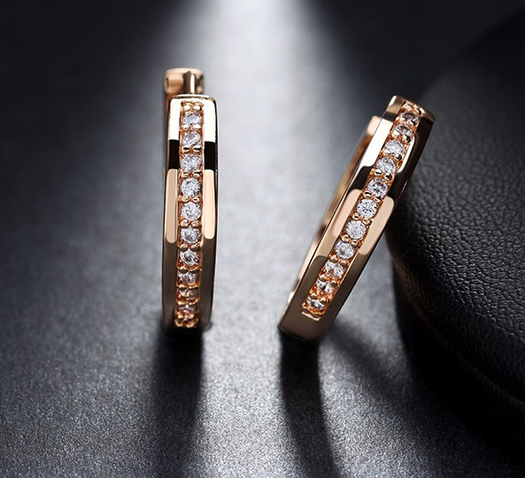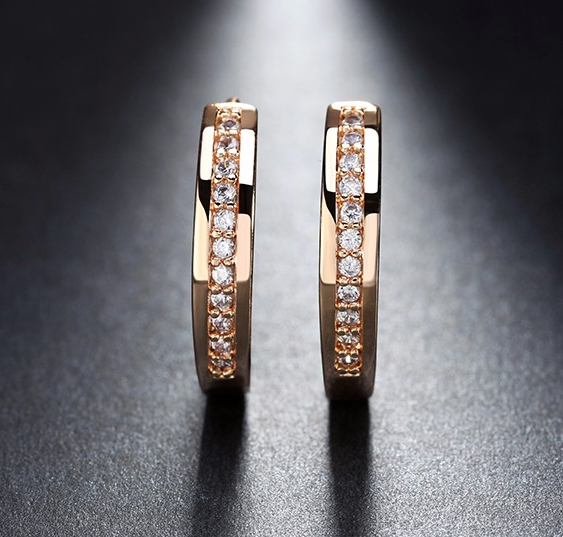 Nickel Free. AAA Cubic Zirconia, 5/8” rose gold hoop. Elegant, rich looking, and beautiful mixed with silver! Pin catch.