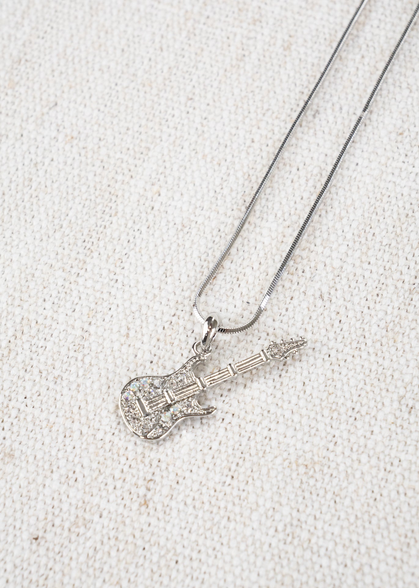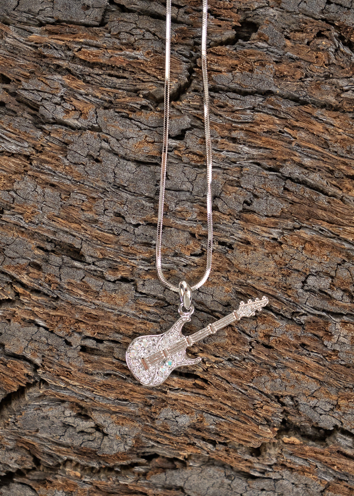 White gold plated, crystal encrusted electric guitar on a 17" chain.