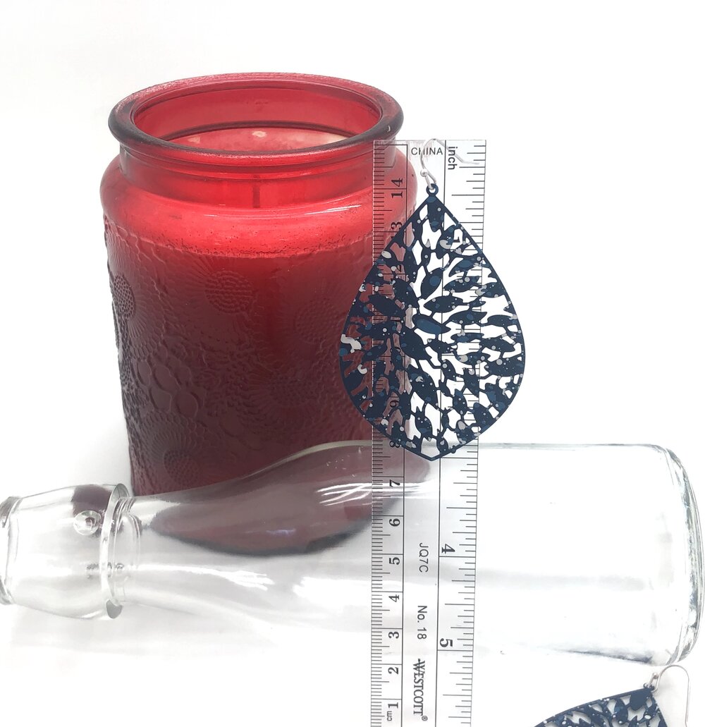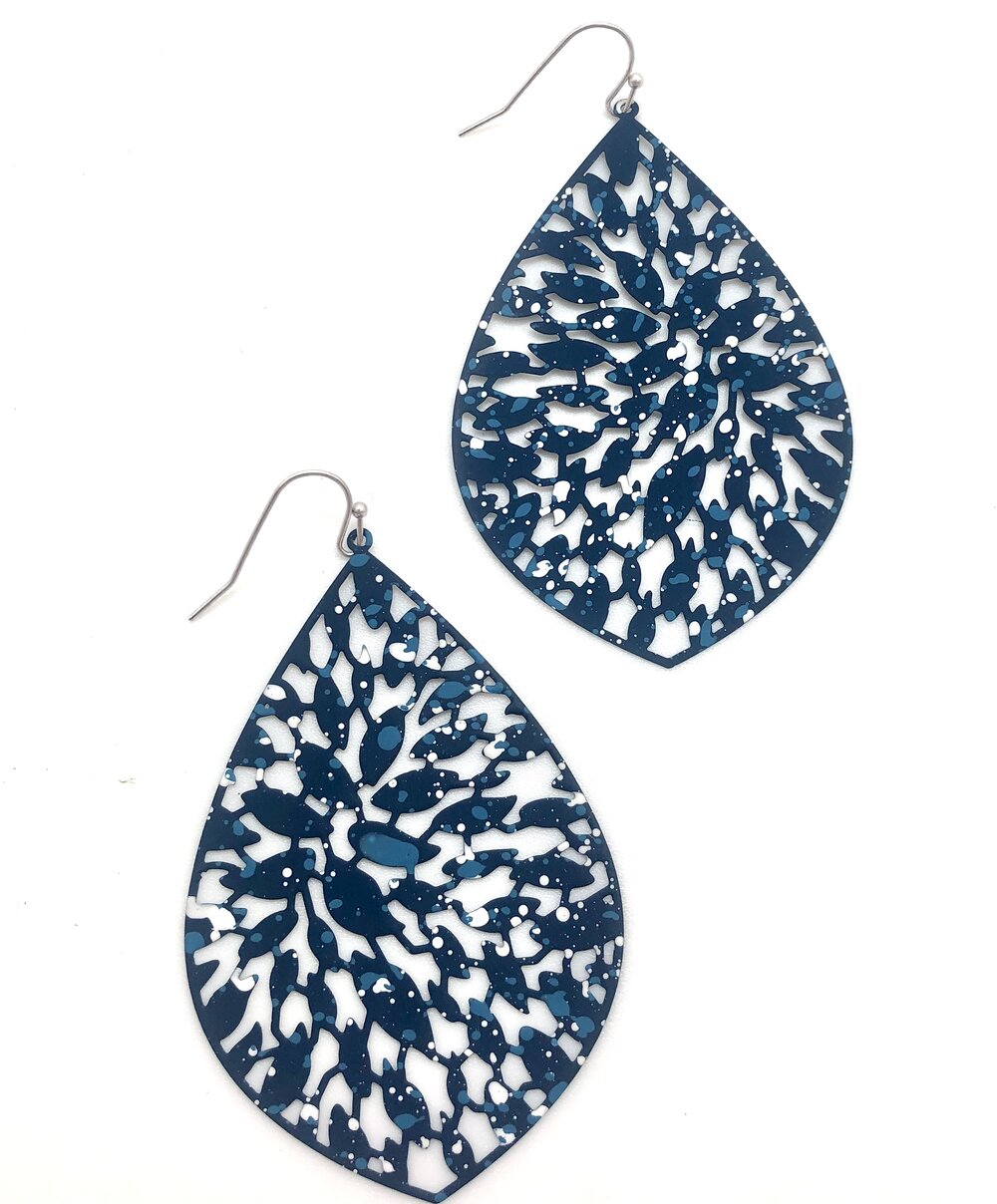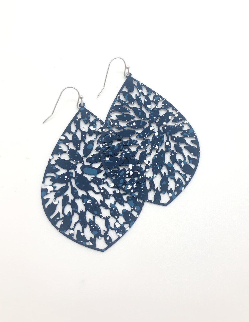 Super earring for that jean and T-shirt day!! Pagosa Springs is a navy blue, slightly pink speckled, leaf pattern hook earring that hangs 3” long (1 3/4” at their widest) , and is just a fun, casual look to pair with white, denim, burgundy, orange, etc.