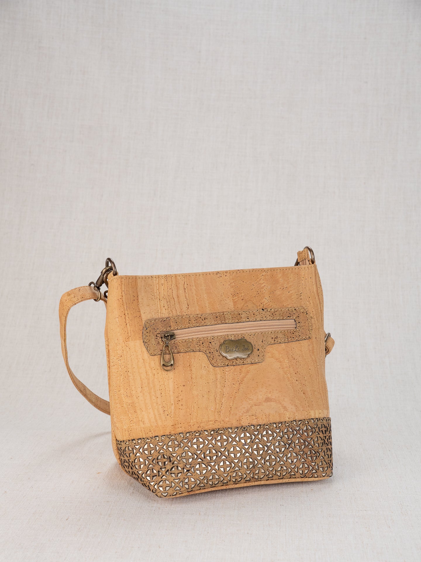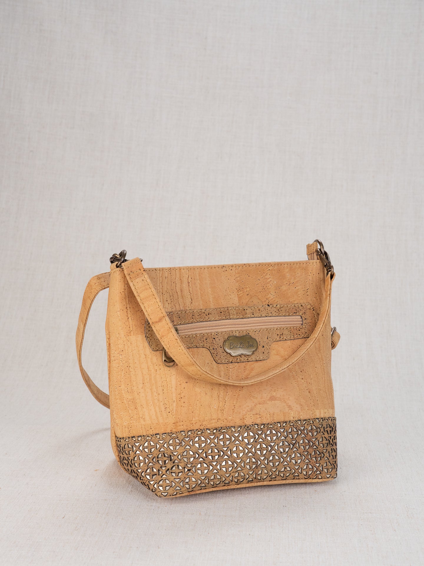 Rylie Town Bag, with beautiful laser cut accents, measures 9.5x10.5x6.5". It has a removable hand strap and removable shoulder strap, to use either/or both. Versatile! It has a front zipper pocket set in a cork placard in the contrast color, a back zipper pocket, and inside back zippered pocket, and an inside front drop in pocket.