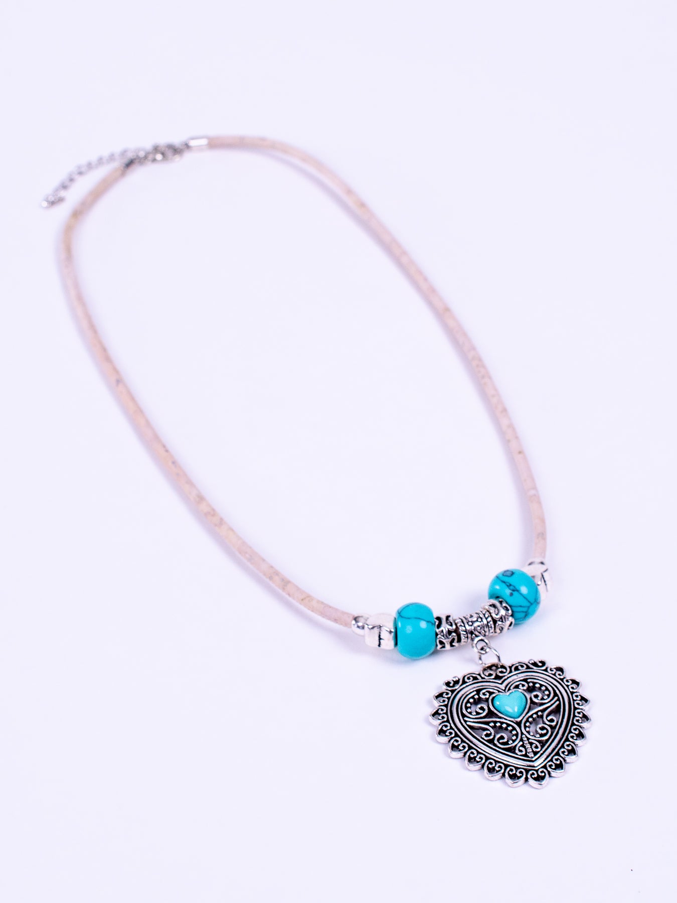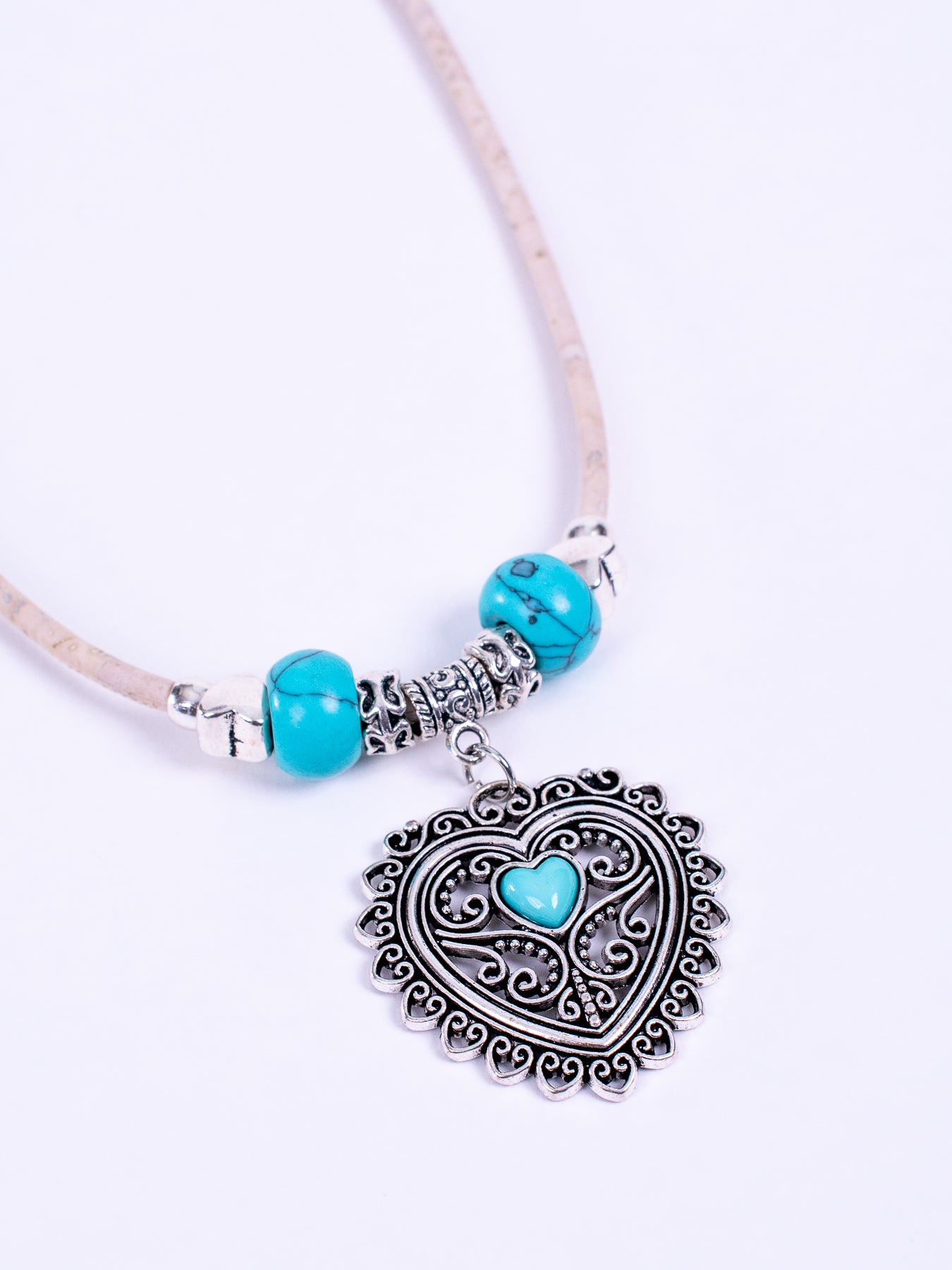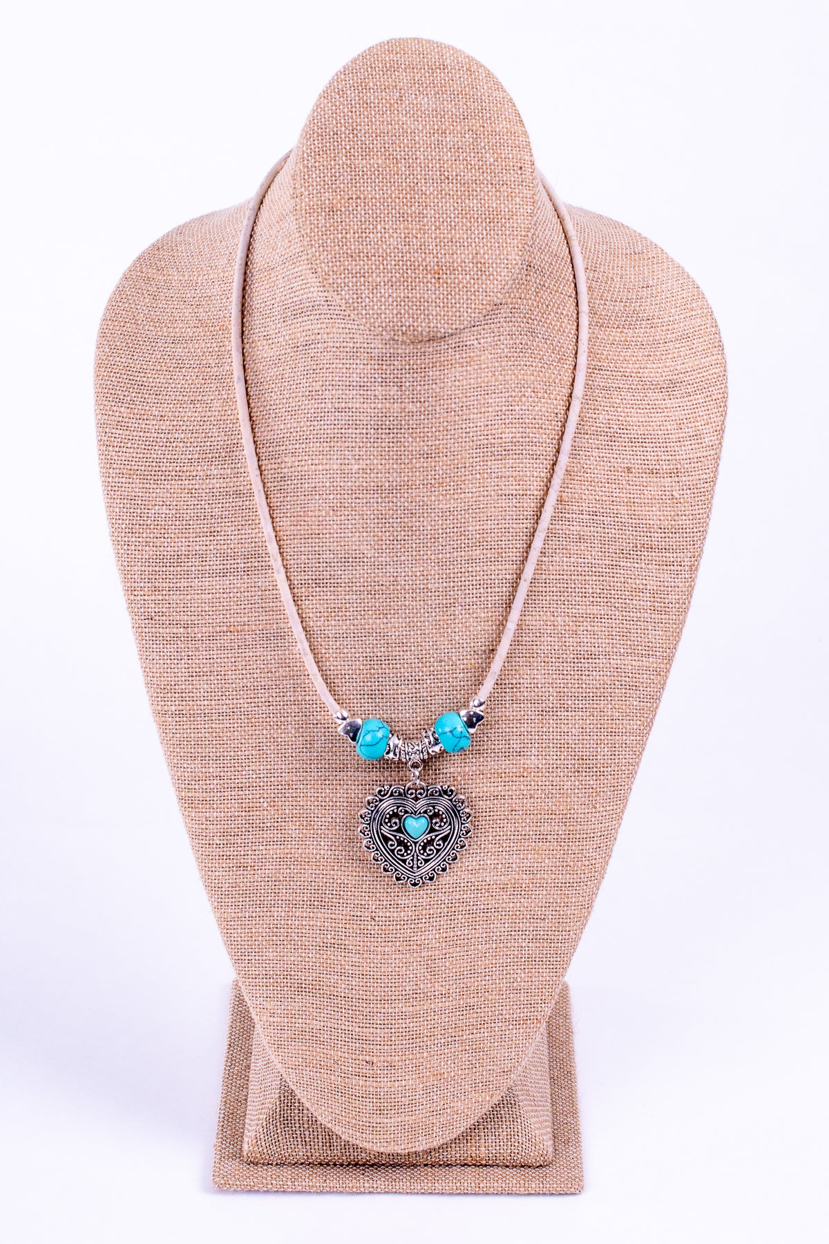 The São Domingo Heart hangs on a 19.5" white cork cord (with a 2.5" extension), and is a small turquoise heart set in a 1.5" silver filigree pendant. It is set off by two turquoise stone beads, two butterfly engraved spacers and two puffy heart spacers. Sweet.