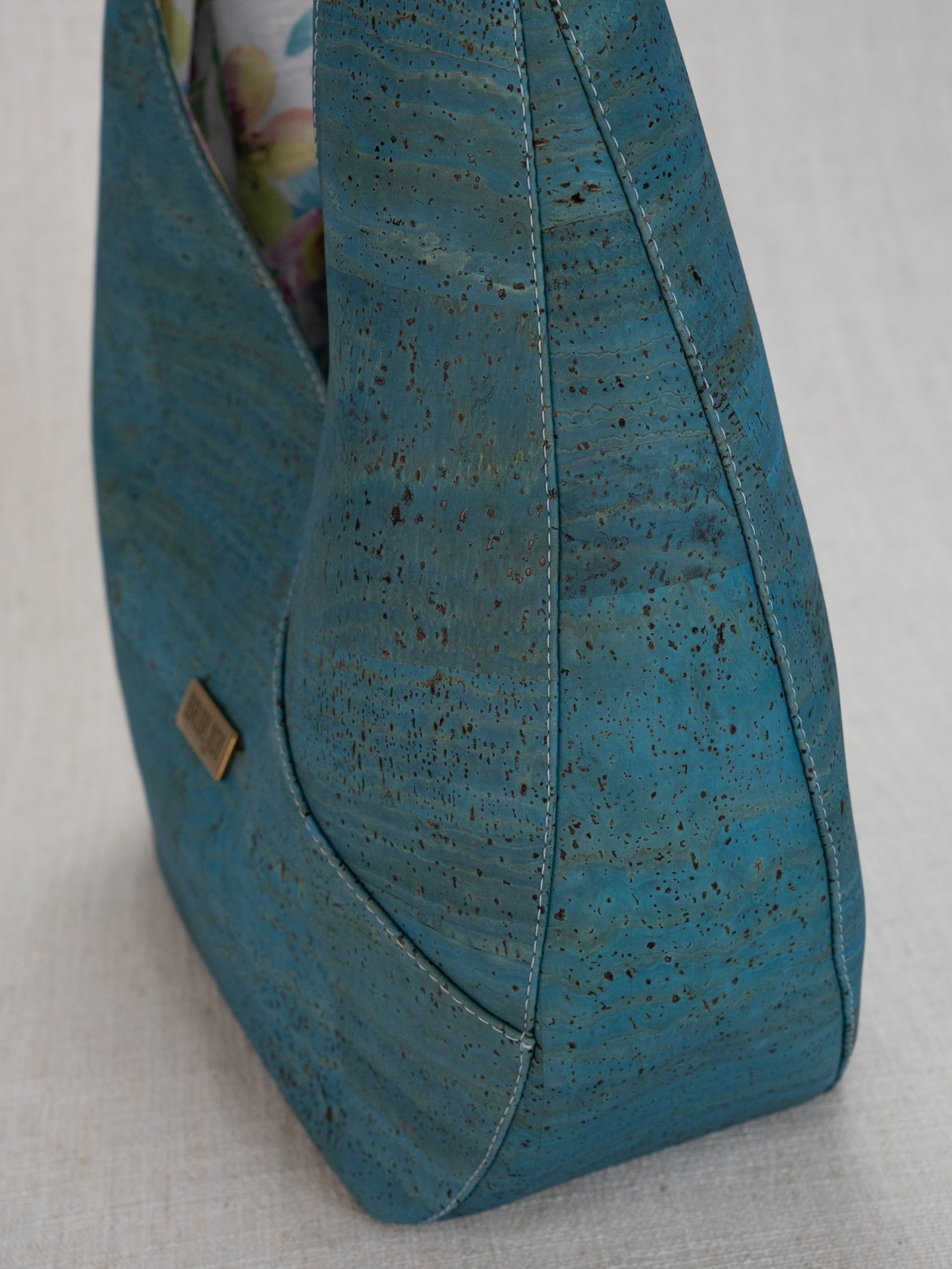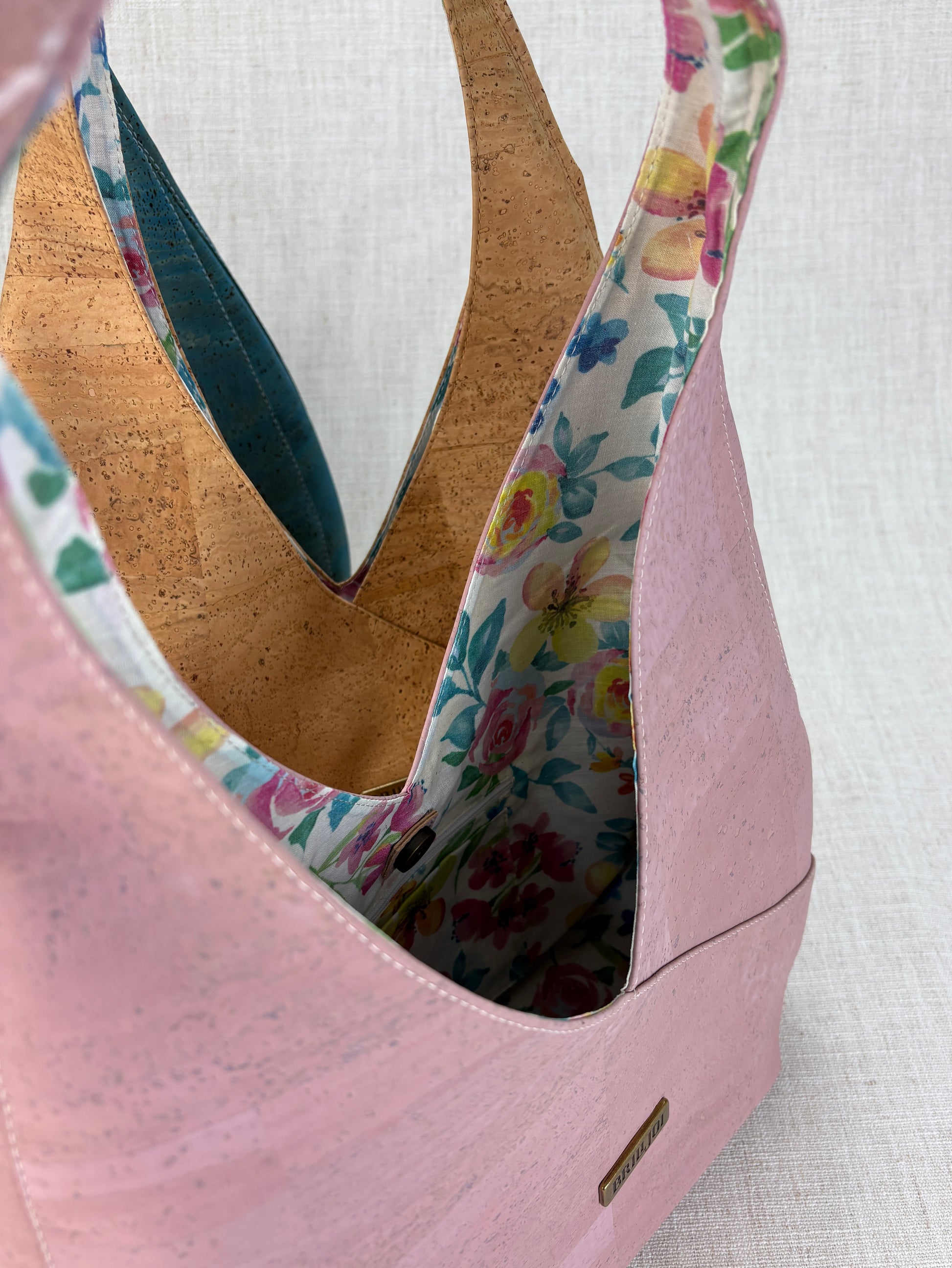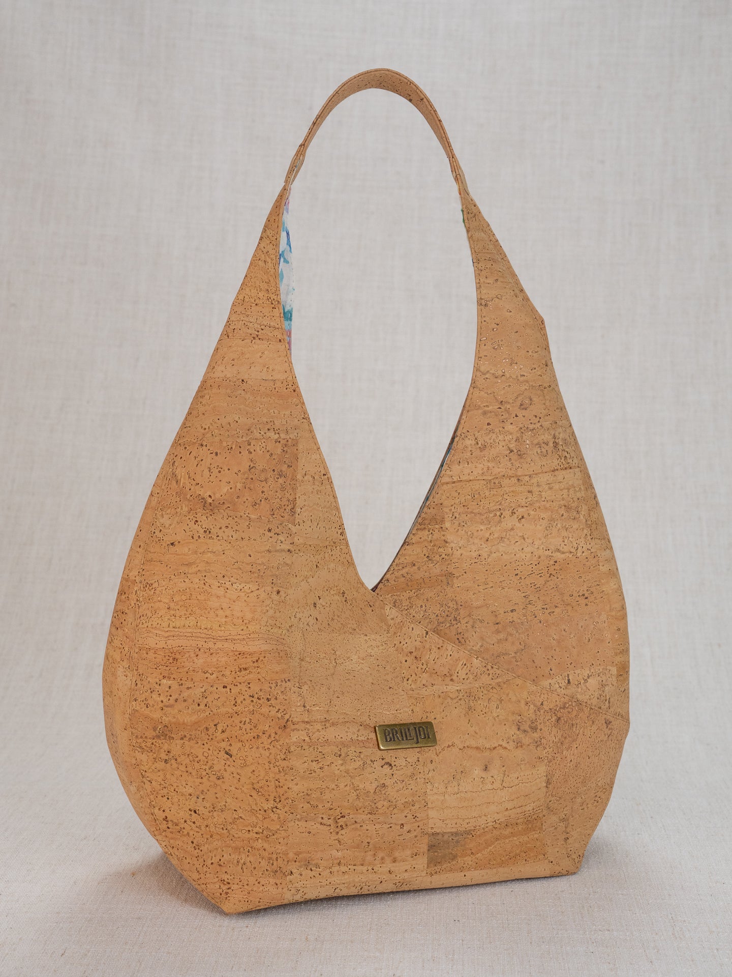 Unique floral lining with bright colors to coordinate with beautiful cork colors. 12" wide, bag part 8" tall, with a 5" deep bottom, and 20" full length from top of shoulder strap. Inside back has a drop in pocket and a zippered pocket.