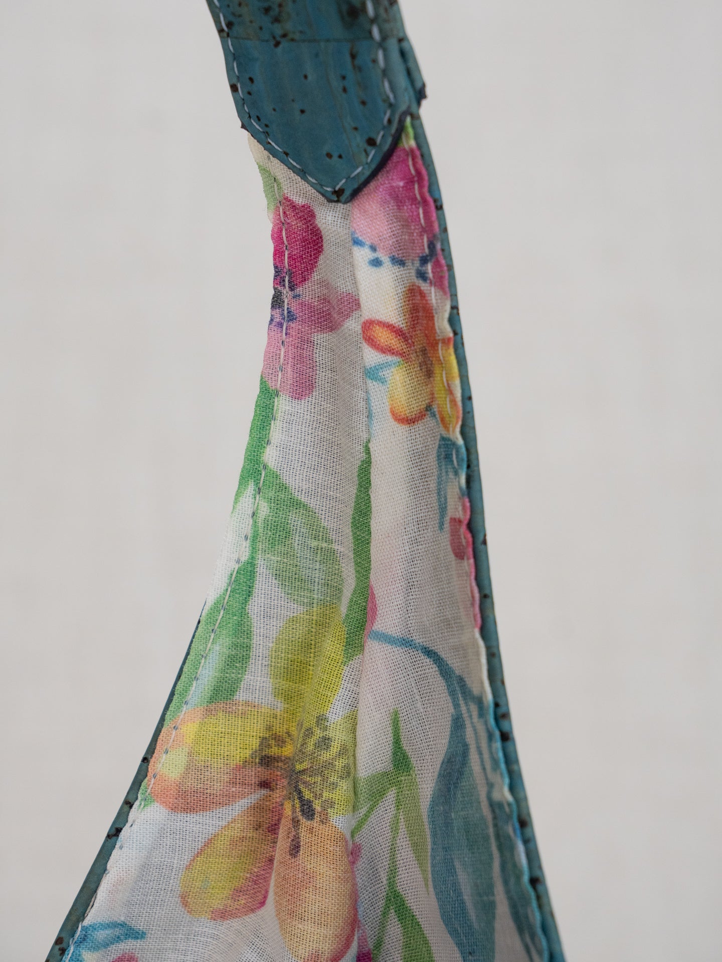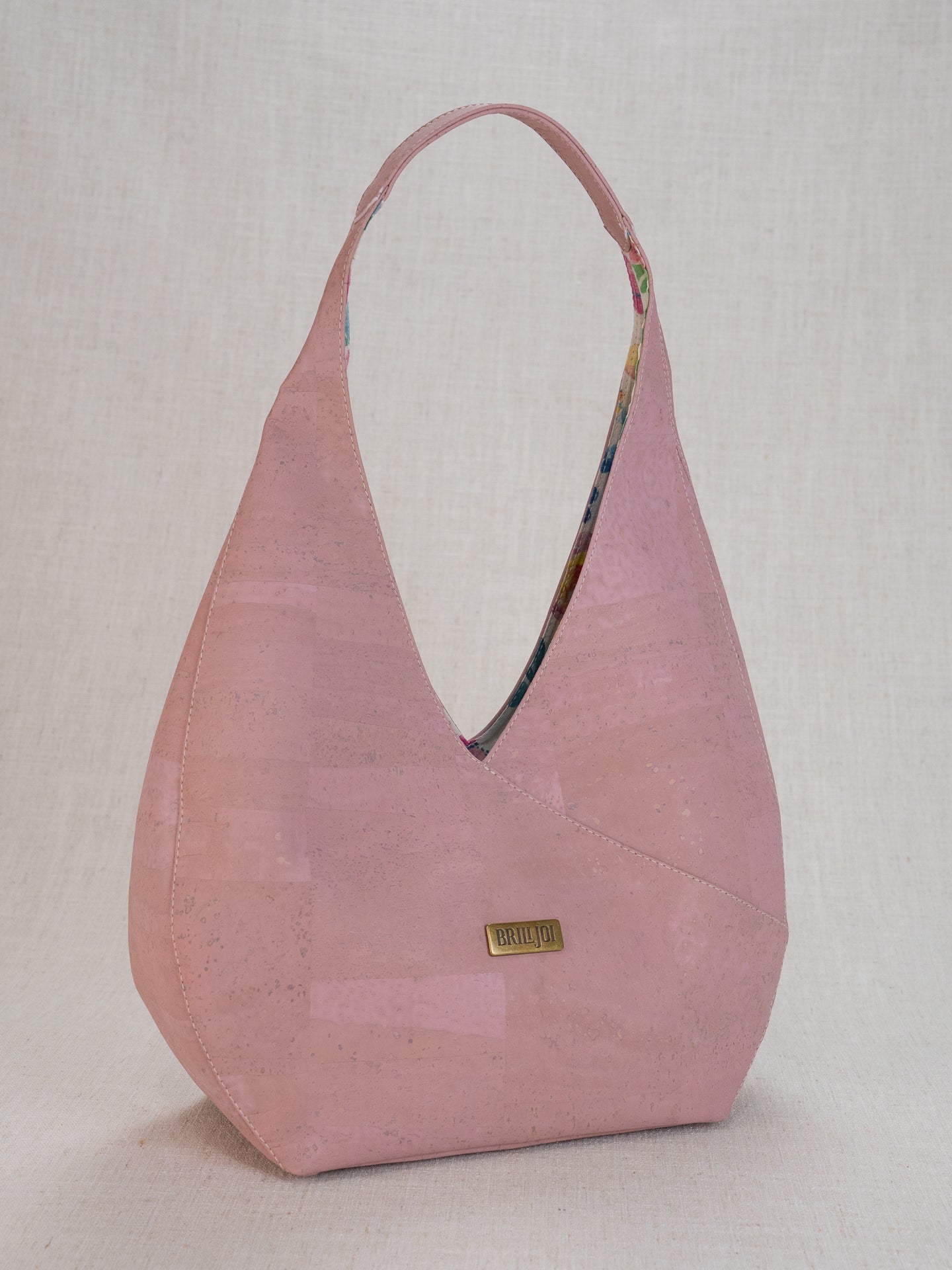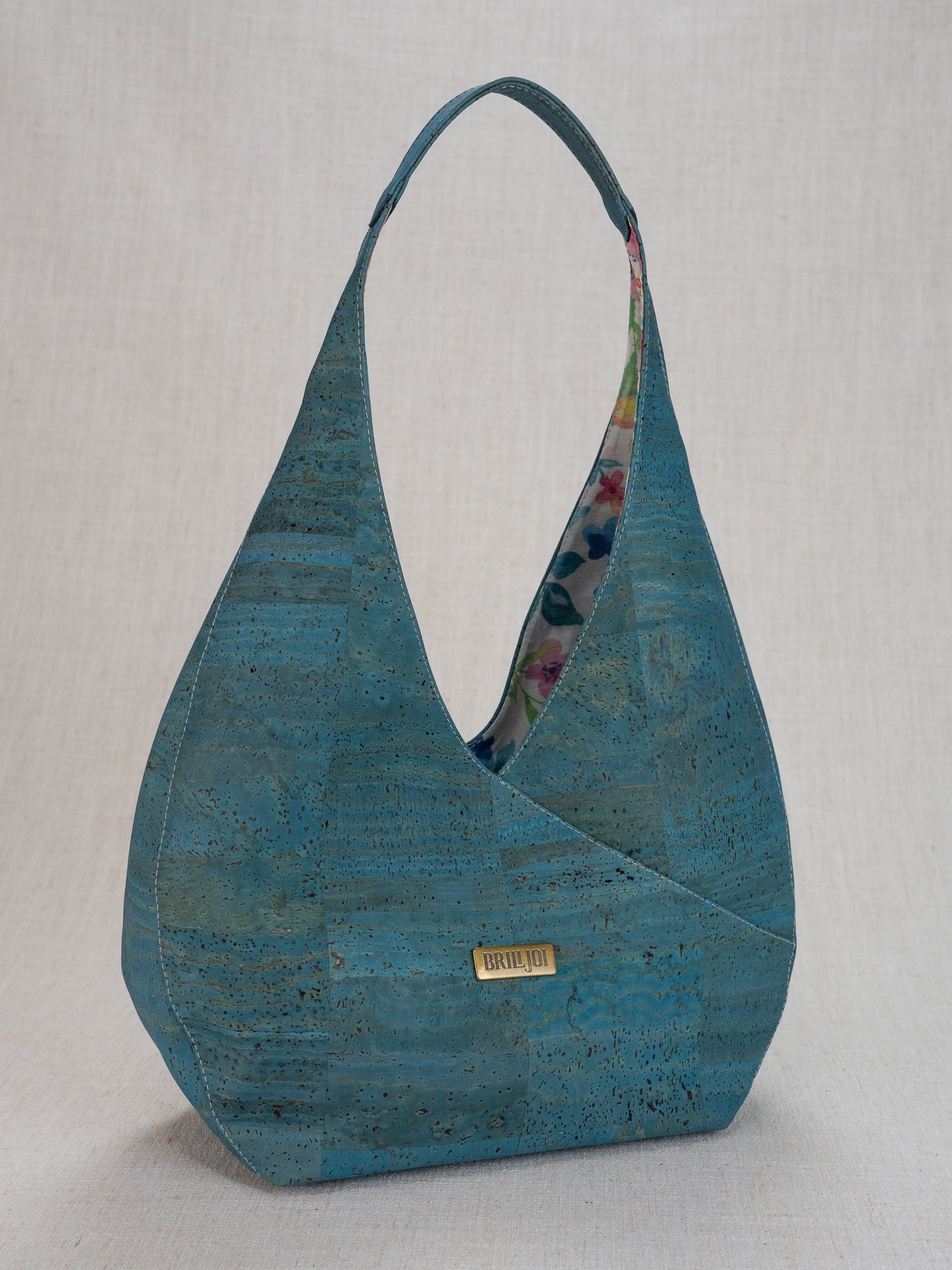 Unique floral lining with bright colors to coordinate with beautiful cork colors. 12" wide, bag part 8" tall, with a 5" deep bottom, and 20" full length from top of shoulder strap. Inside back has a drop in pocket and a zippered pocket.