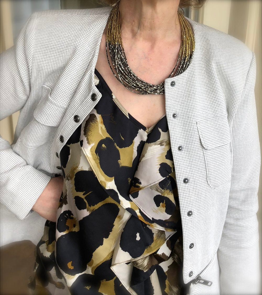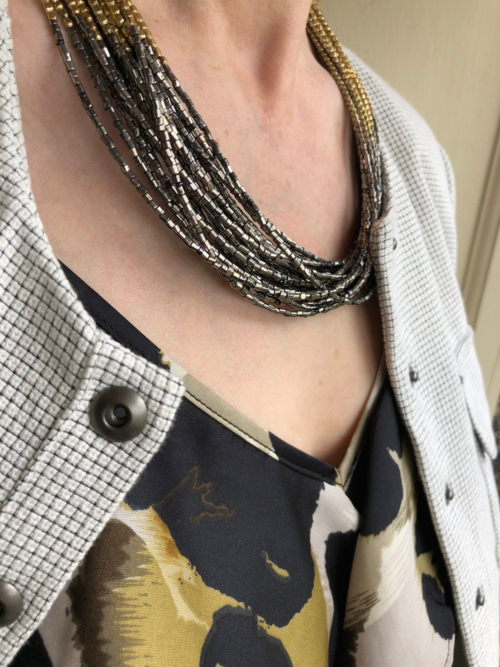 16 inches (plus extension) of festive gold and silver seeds beads that light dance off of. If you're bold, pair it with the Sarabande earring. If you're a little more sheepish, go with Divia. The Carlisle is a pretty bracelet pairing.