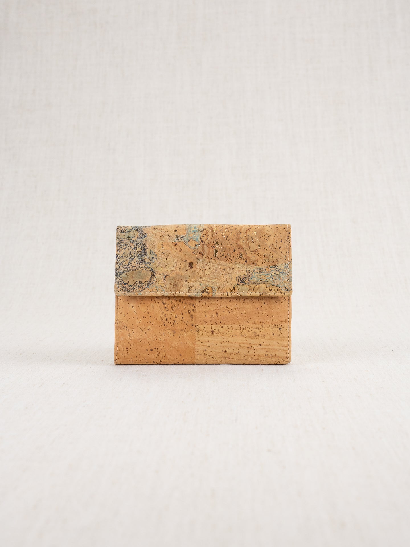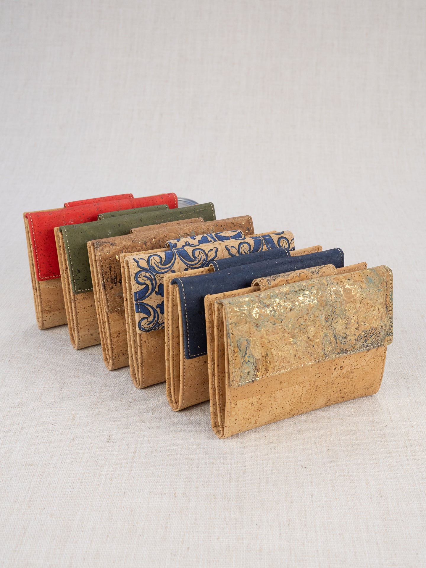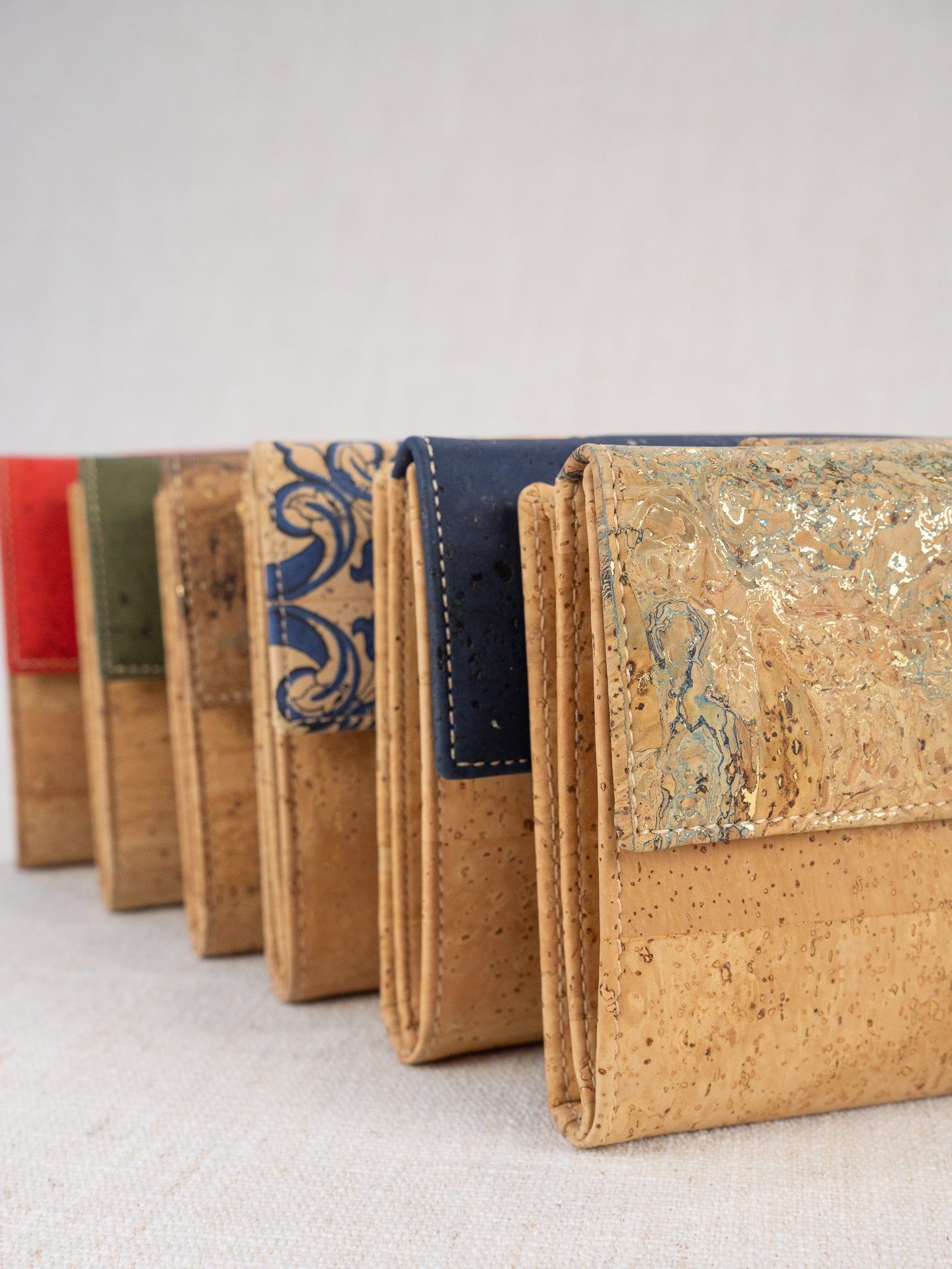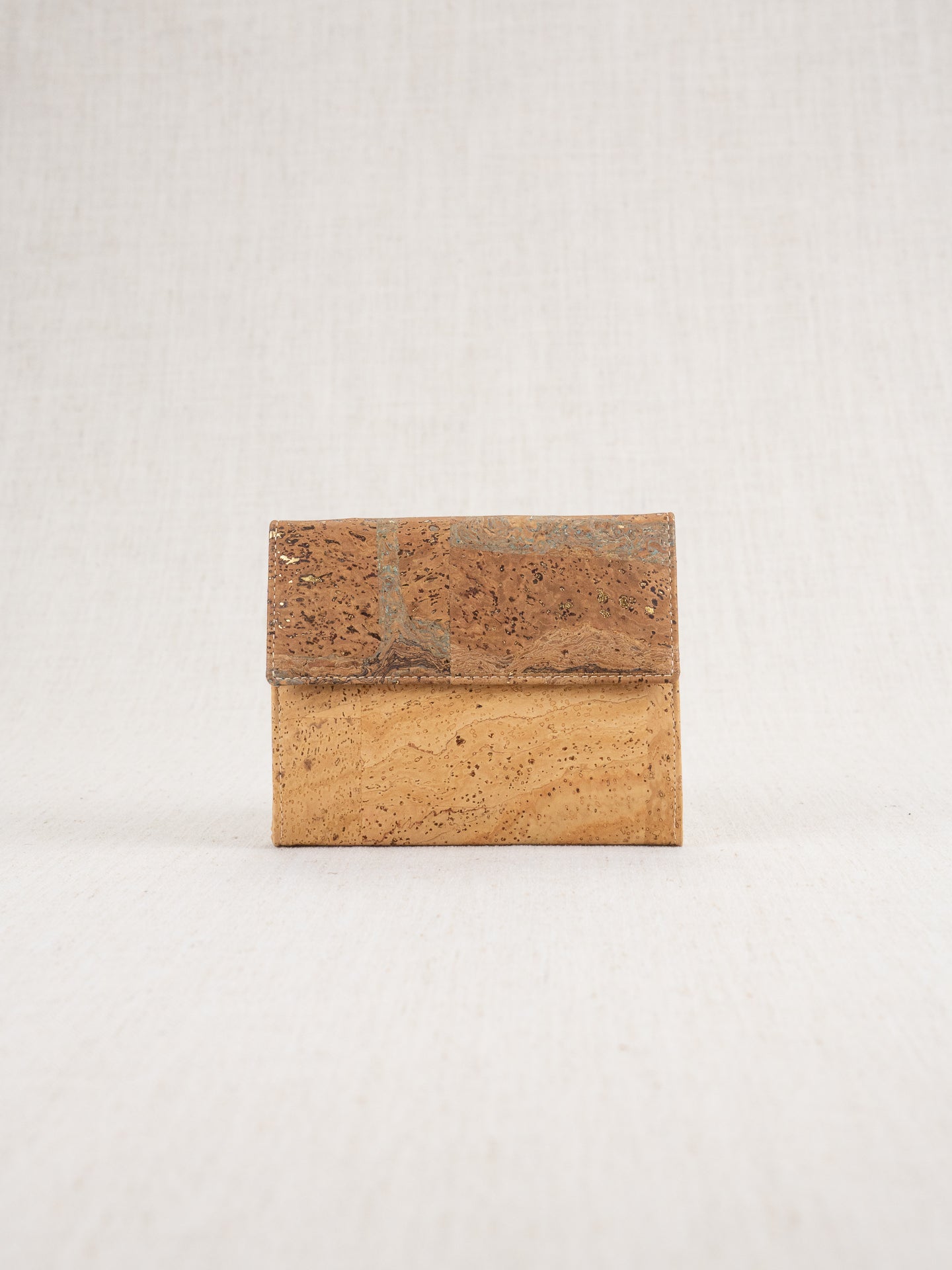 Measuring 5.25x4.3", the Small Clara is the little sister to the Clara. It still boasts 8 credit card slots, 4 window compartments, one larger compartment for bills, and the coin side with a zippered compartment and room on either side. As are all our cork products, beautifully vegan and renewable!