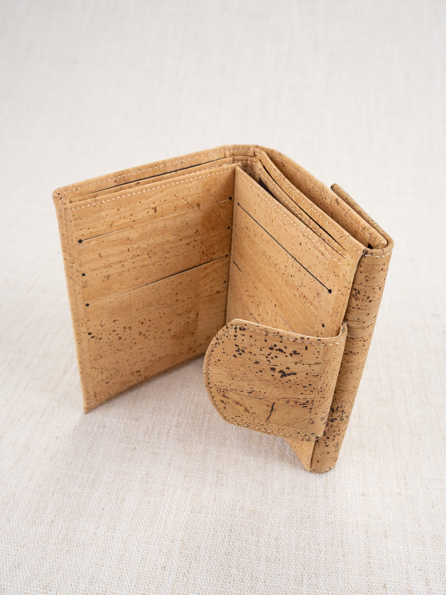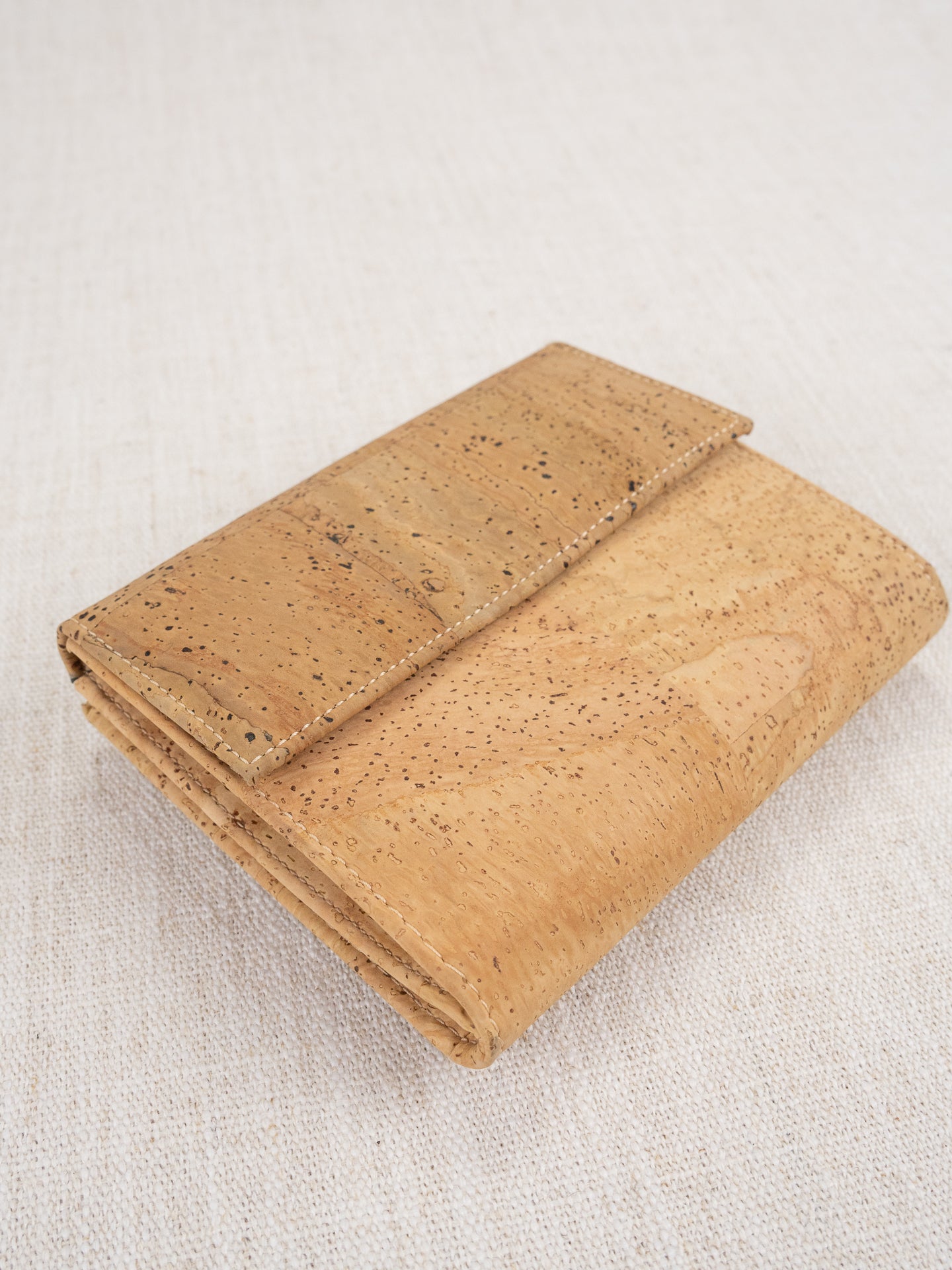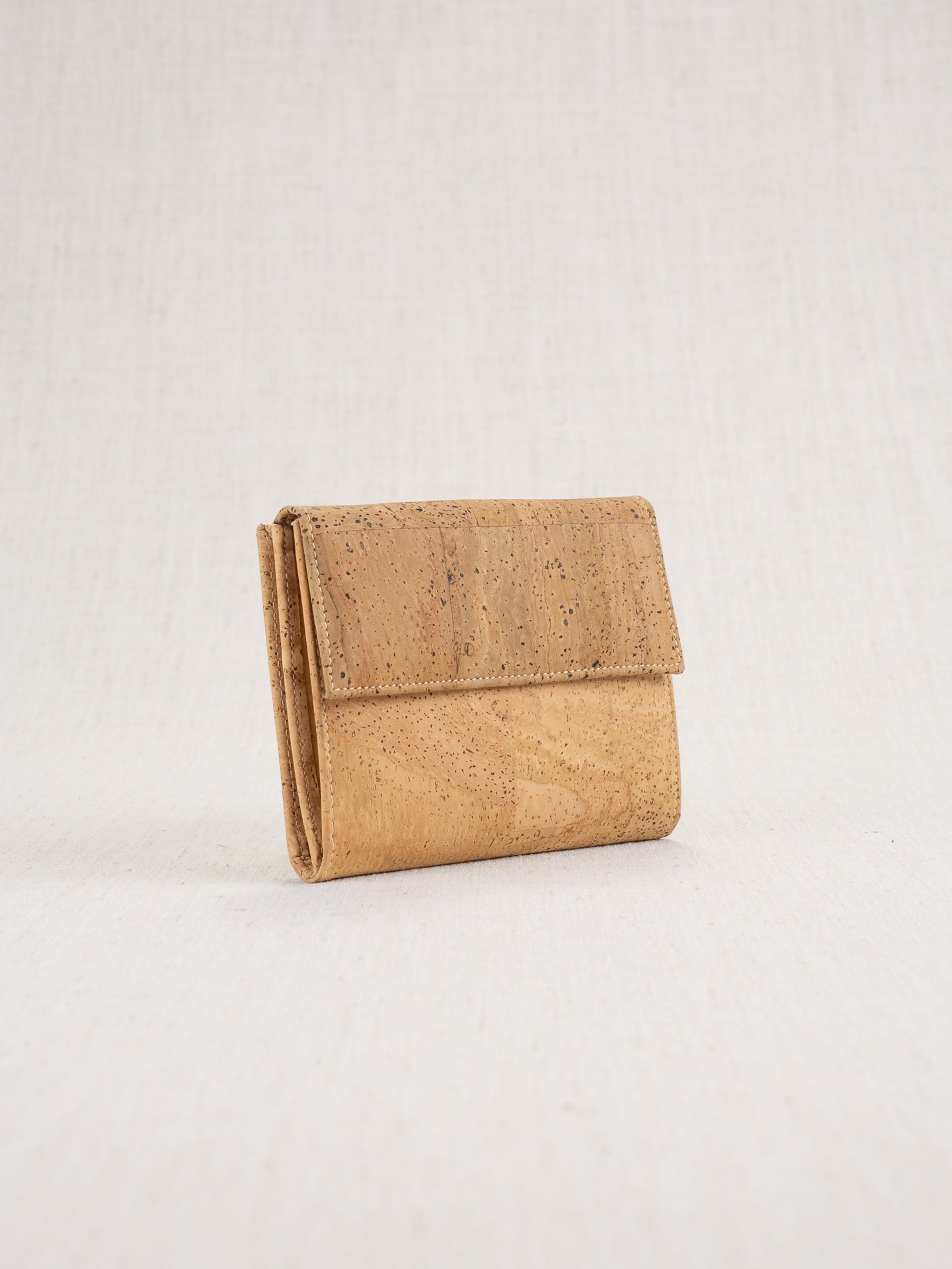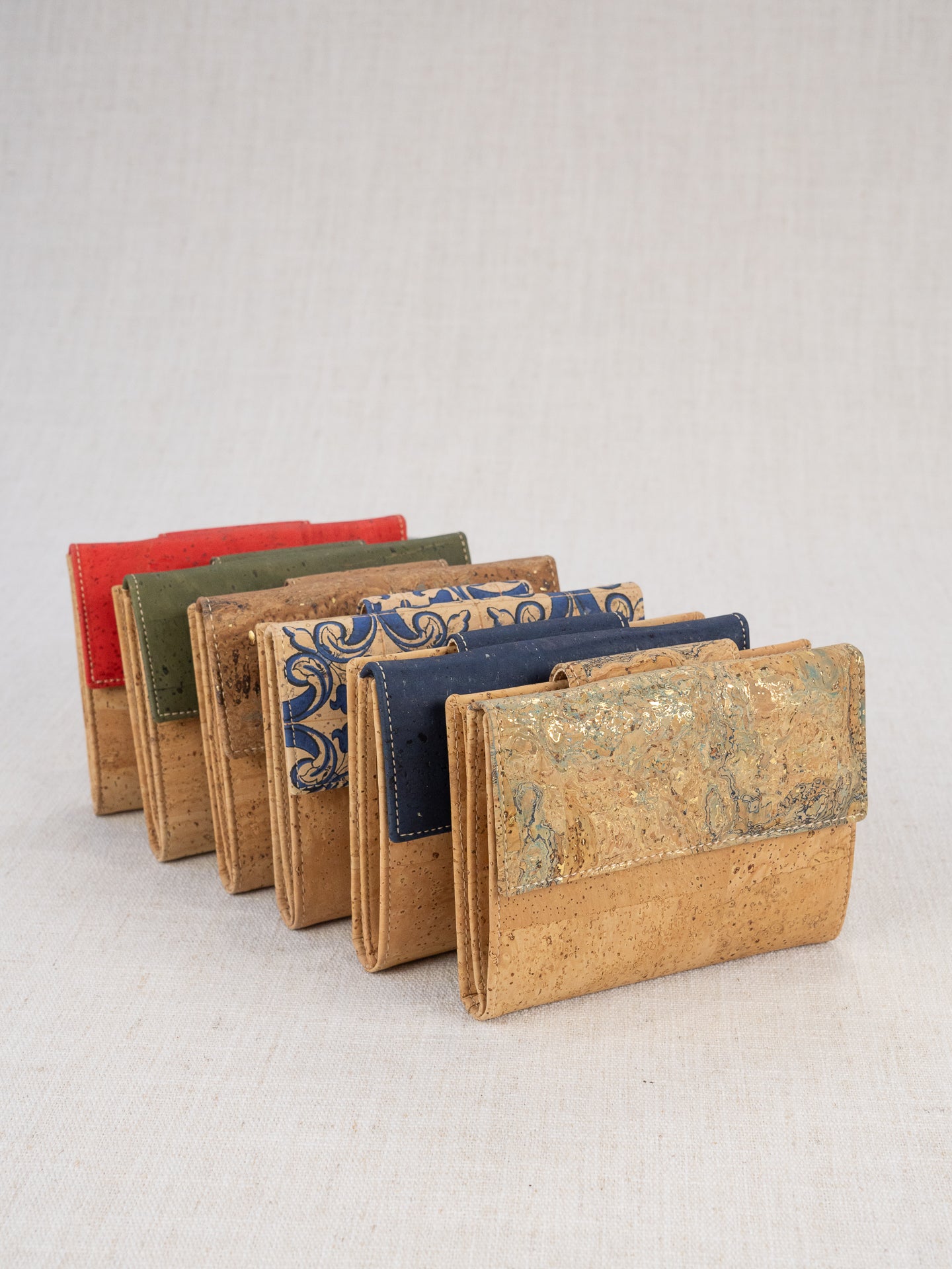 Measuring 5.25x4.3", the Small Clara is the little sister to the Clara. It still boasts 8 credit card slots, 4 window compartments, one larger compartment for bills, and the coin side with a zippered compartment and room on either side. As are all our cork products, beautifully vegan and renewable!