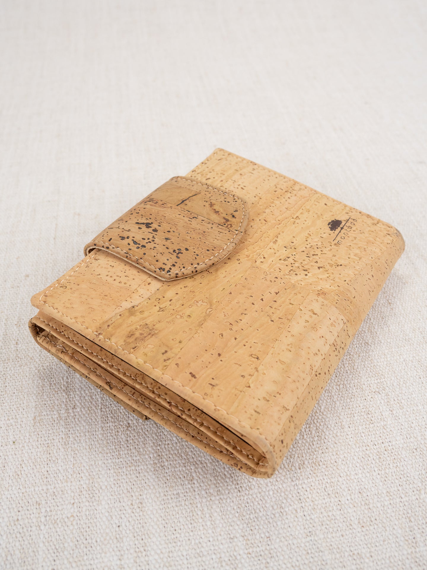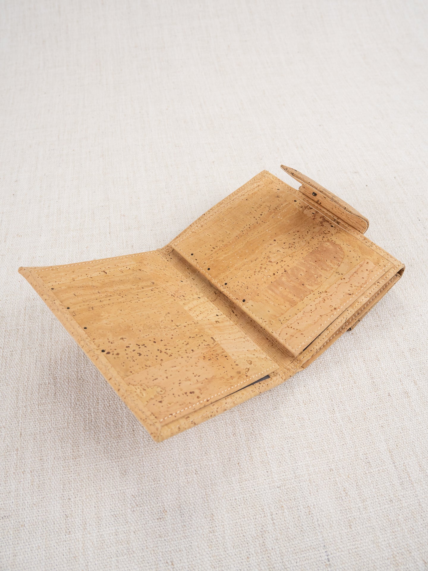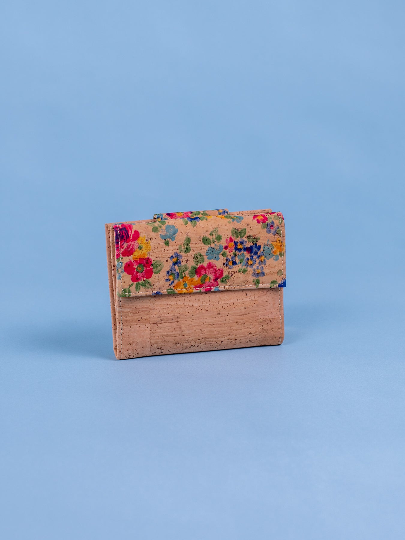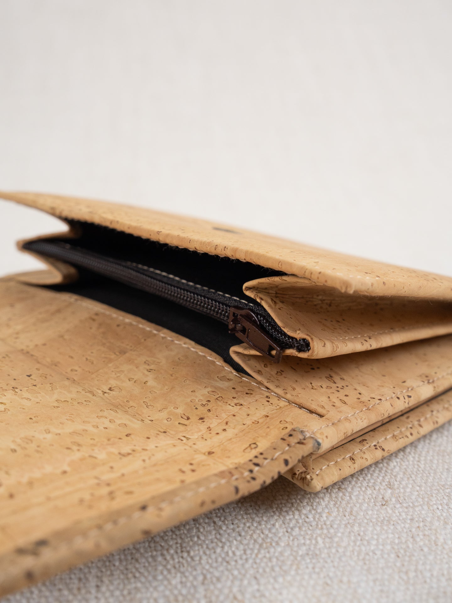 Measuring 5.25x4.3", the Small Clara is the little sister to the Clara. It still boasts 8 credit card slots, 4 window compartments, one larger compartment for bills, and the coin side with a zippered compartment and room on either side. As are all our cork products, beautifully vegan and renewable!