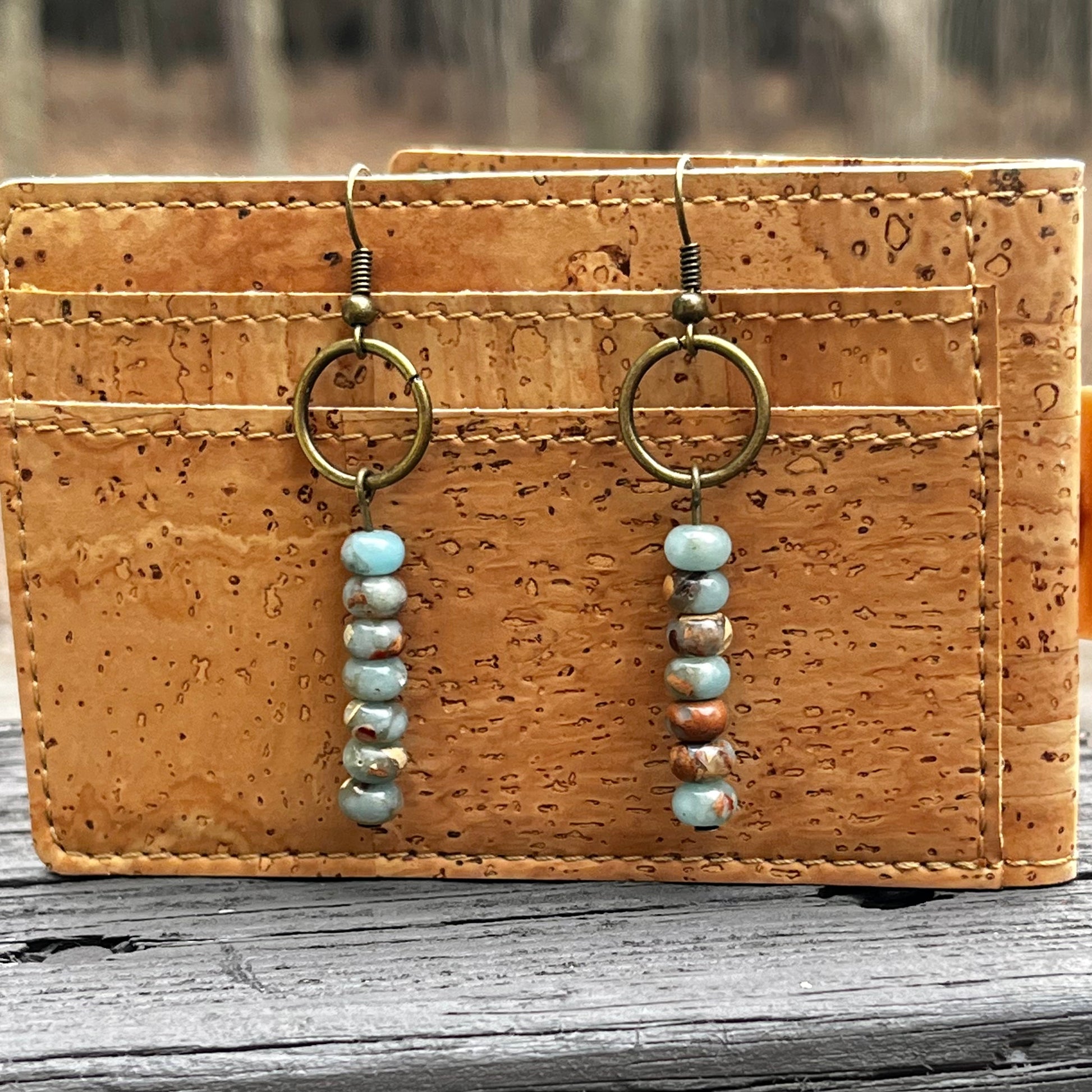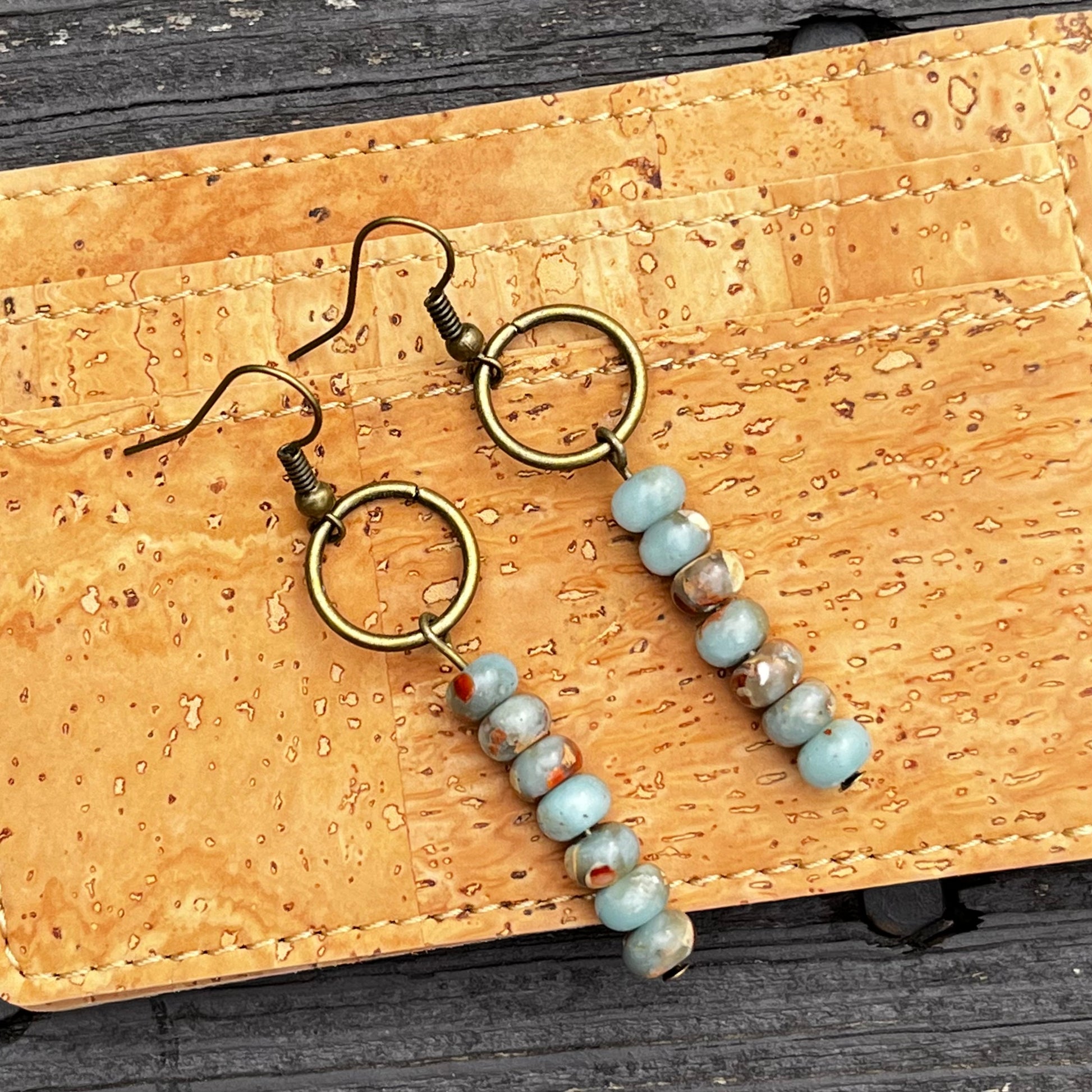 Semi-precious stones stacked by sevens, hanging from a .5" antiqued brass circle, and on a shepherd hook, for total hanging length of 2.5". Beautiful aqua with natural earthy colored accents. All are slightly different because they are natural stone.