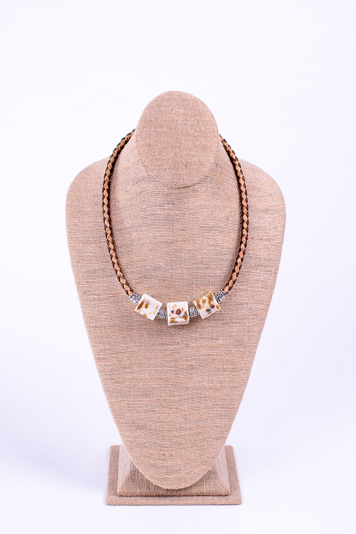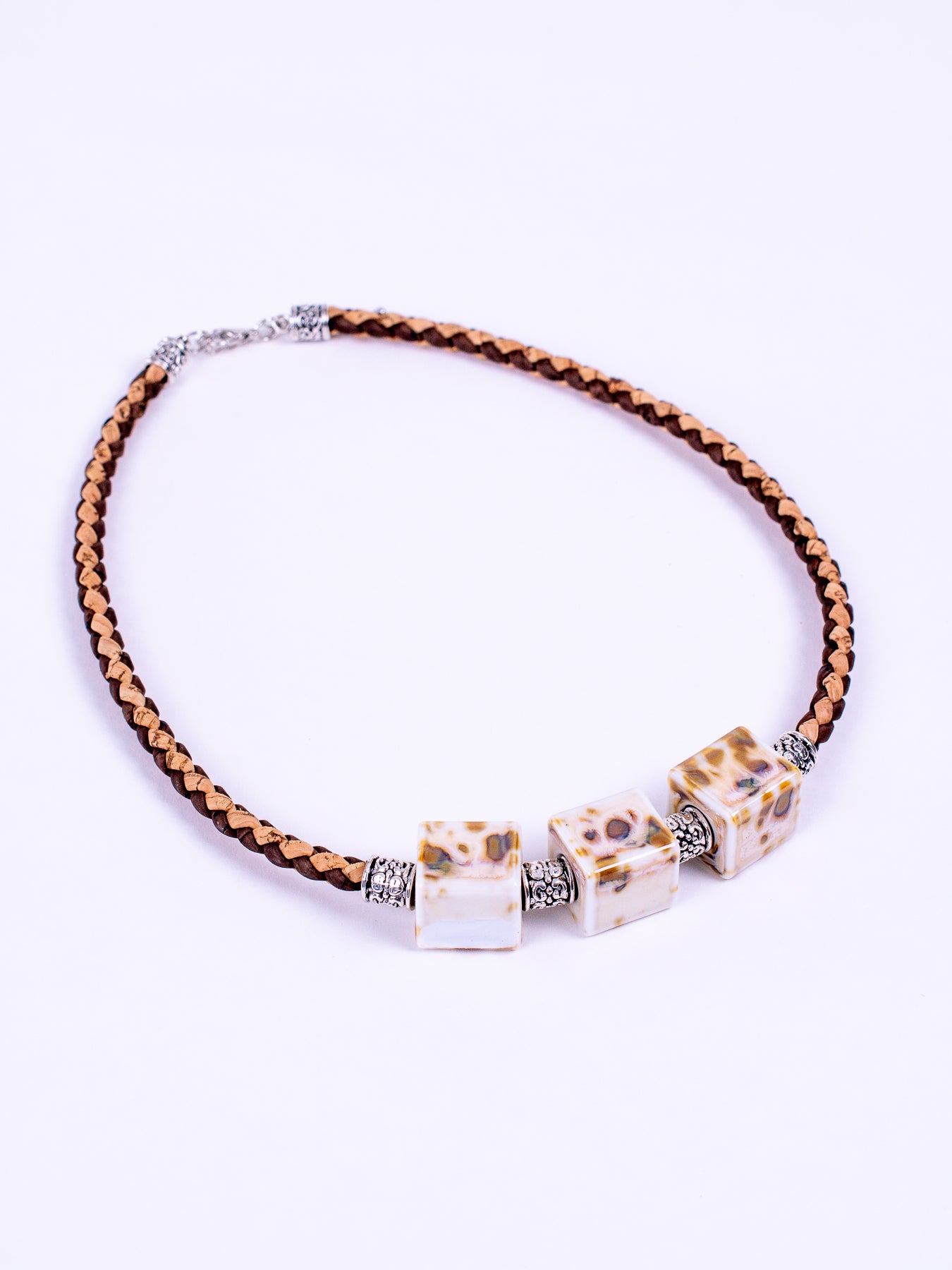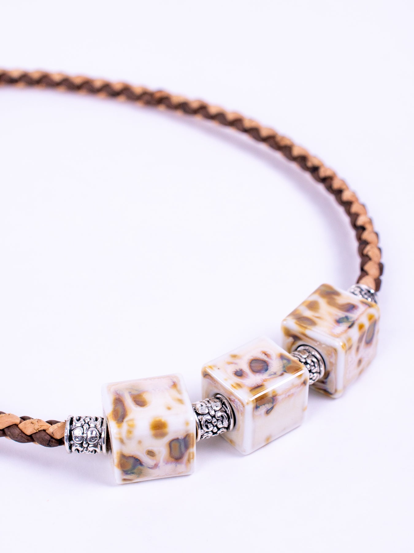 Unique cork necklace with beautiful, square ceramic beads mottled in gold-brown and tan. The cord is braided cork in natural and brown, and the three , 3/4" ceramic beads are set off by 5 silver spacers. Necklace measures 20-22".