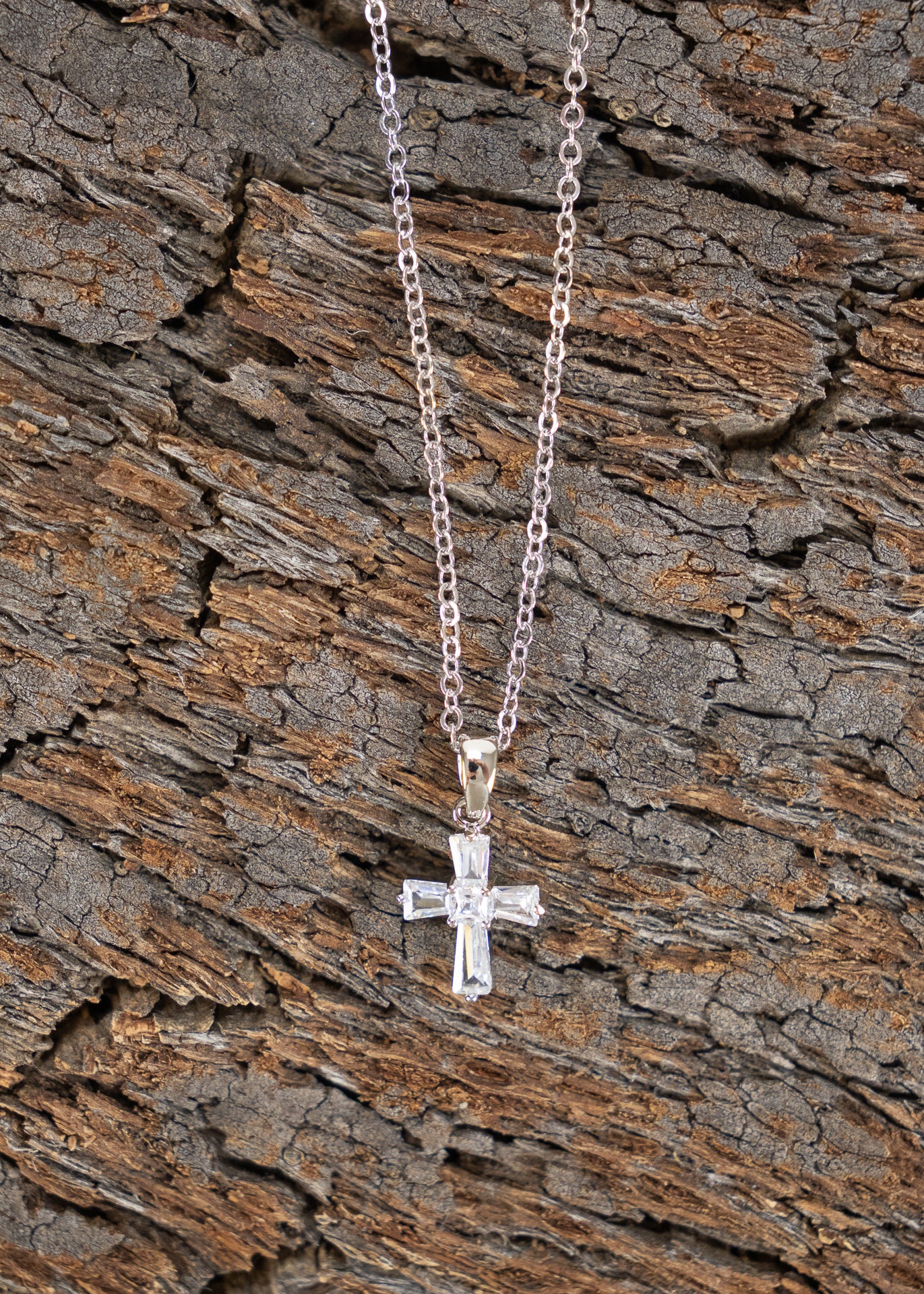 White gold plated beautiful tiny cross. Cross is 1/2" long, chain 15-17" adjustable.