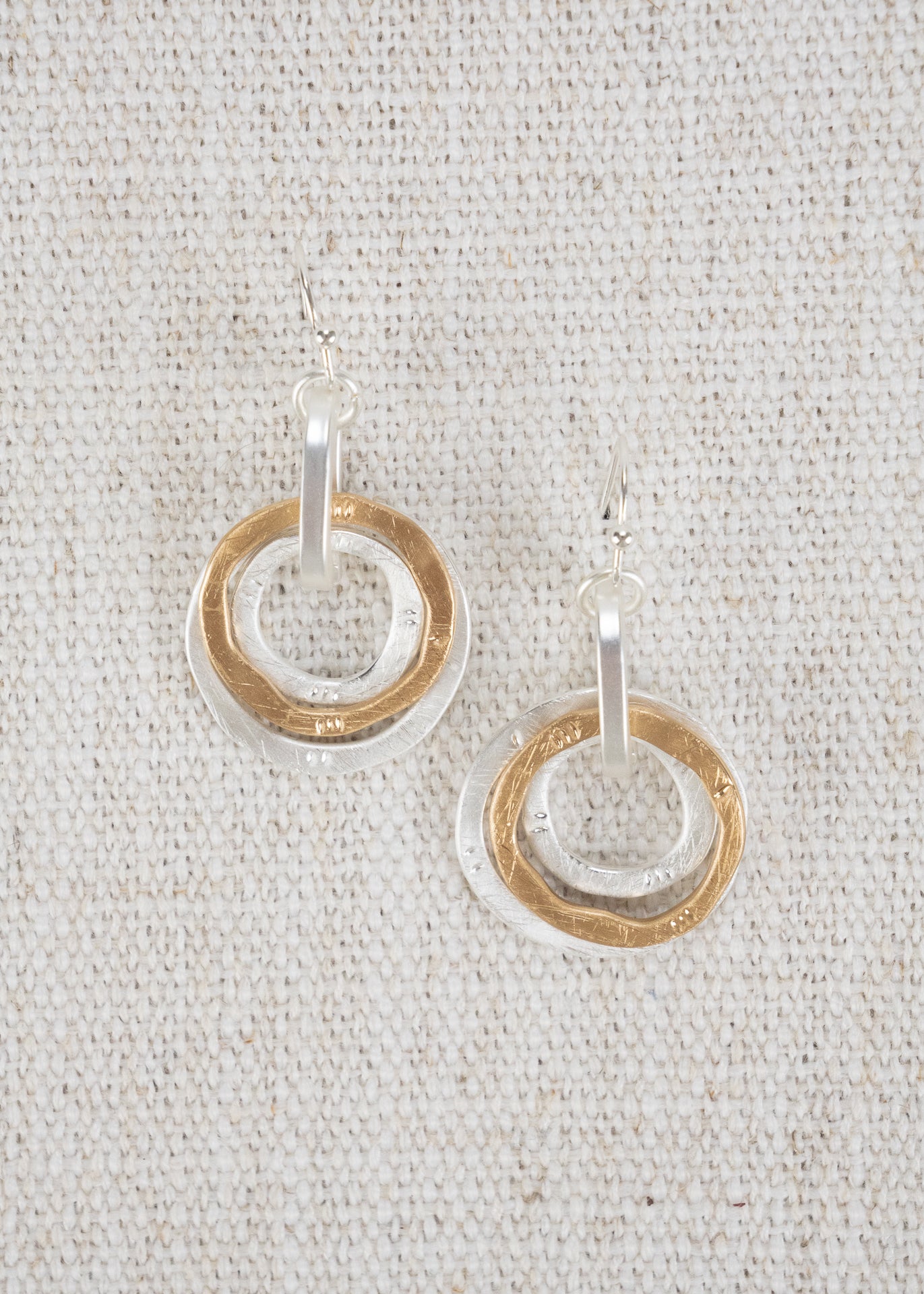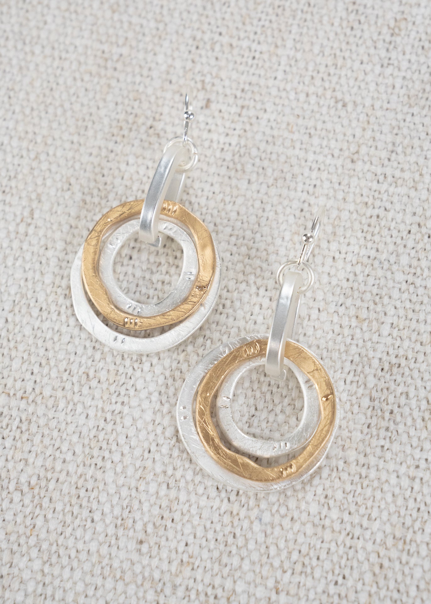 Part of our versatile mix and match collection! Hangs 1 5/8" on a shepherd hook, mixes matte silver and matte gold with a slight texture on the lower three rings, which move independently.