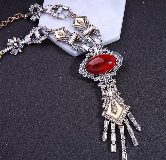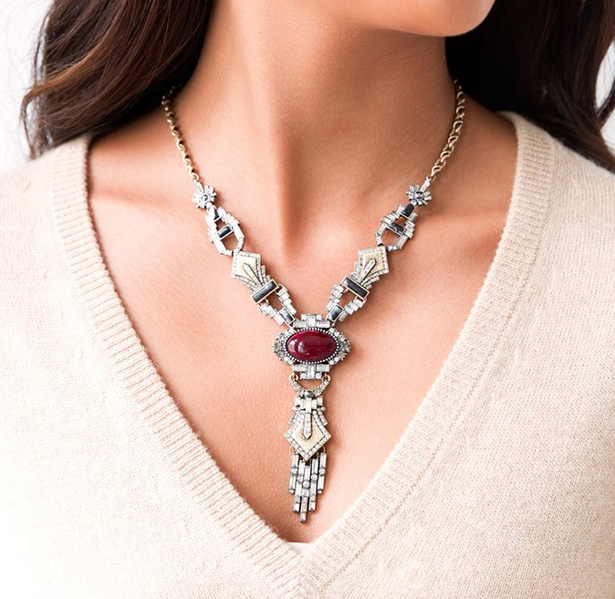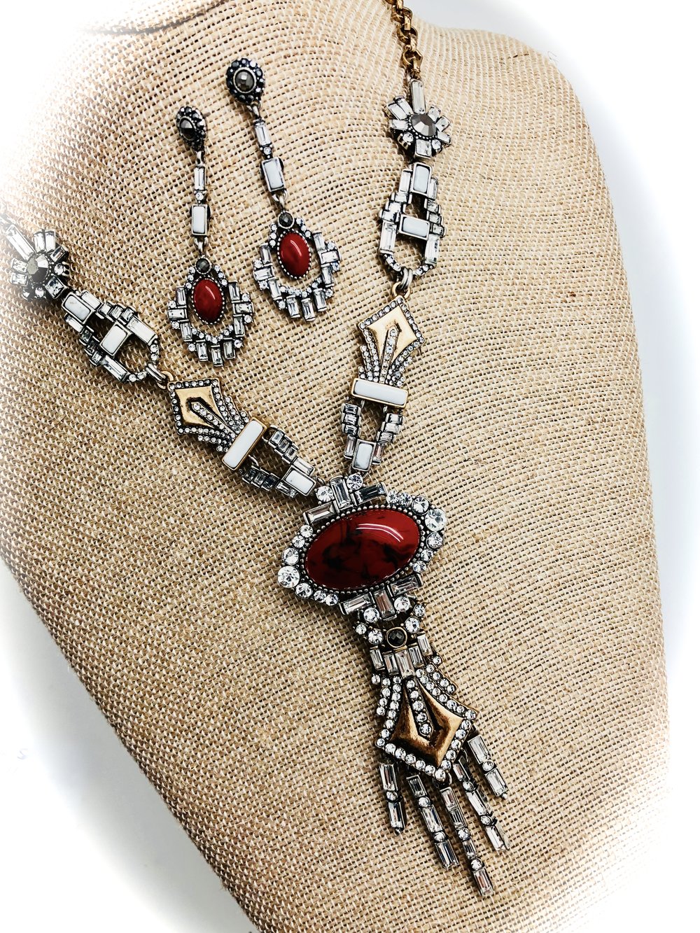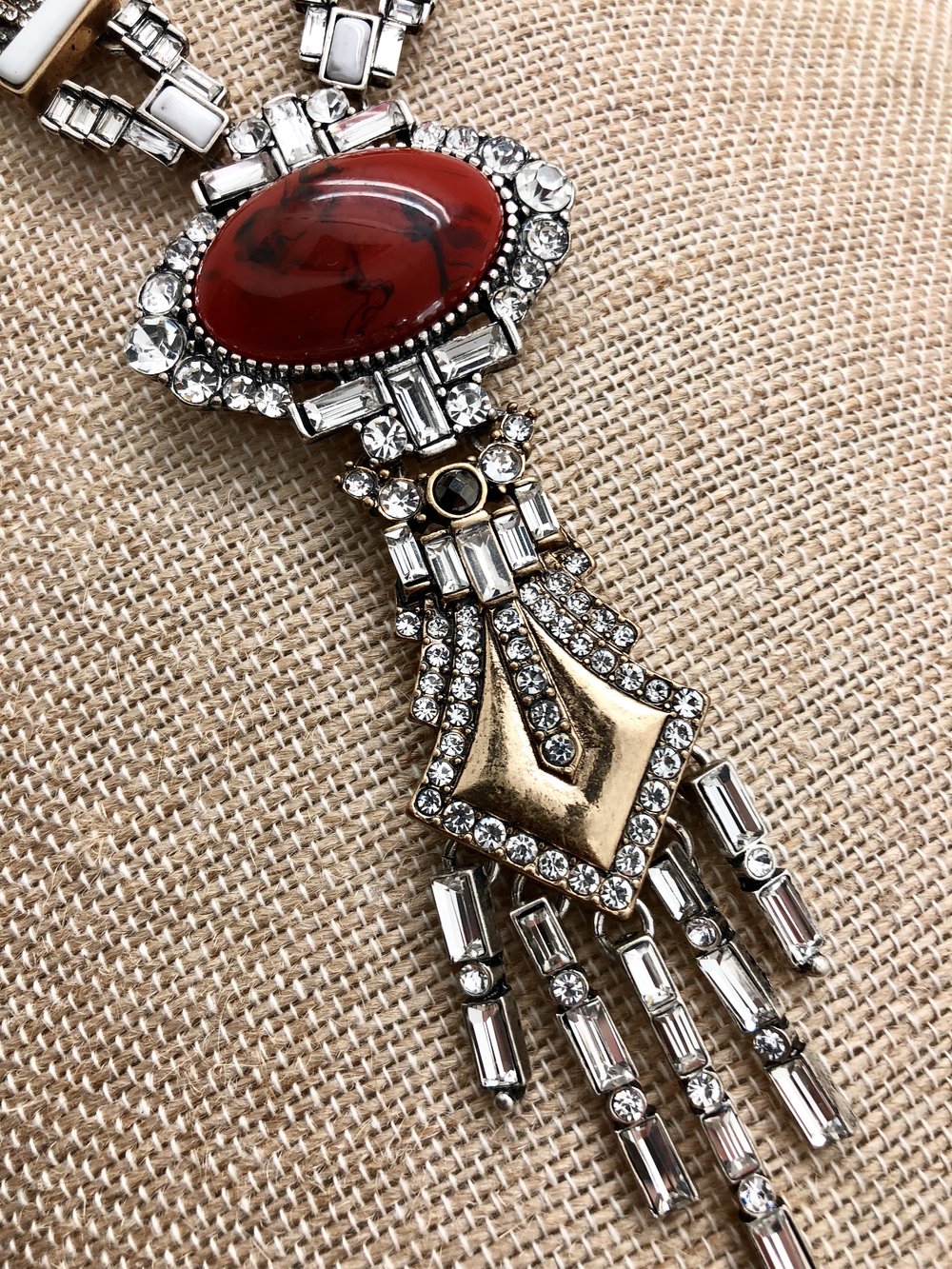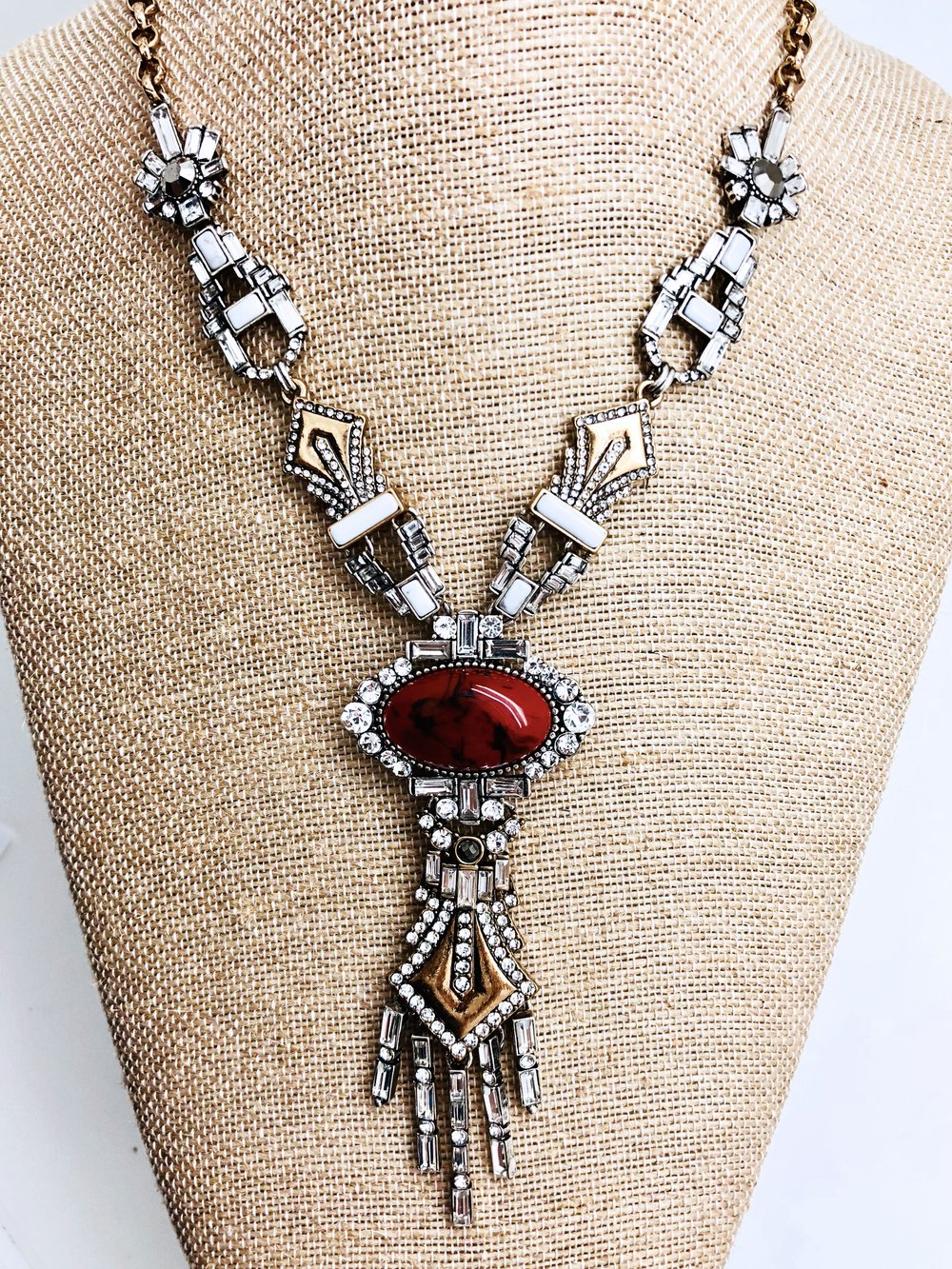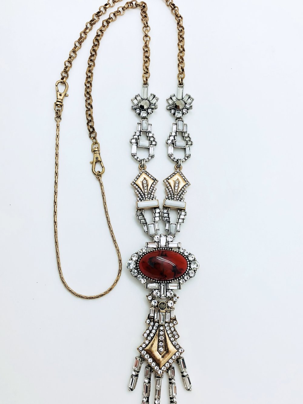 Nickel Free. This opulent, gorgeous necklace can be worn at either 32” or 22” using a removable piece in the back! This Louis IVX type detailed luxury includes clear bling, worn silver, worn gold, white stone, and marbled burgandy. Be bold! Does NOT have to be dressed up! See the matching Versailles earring.