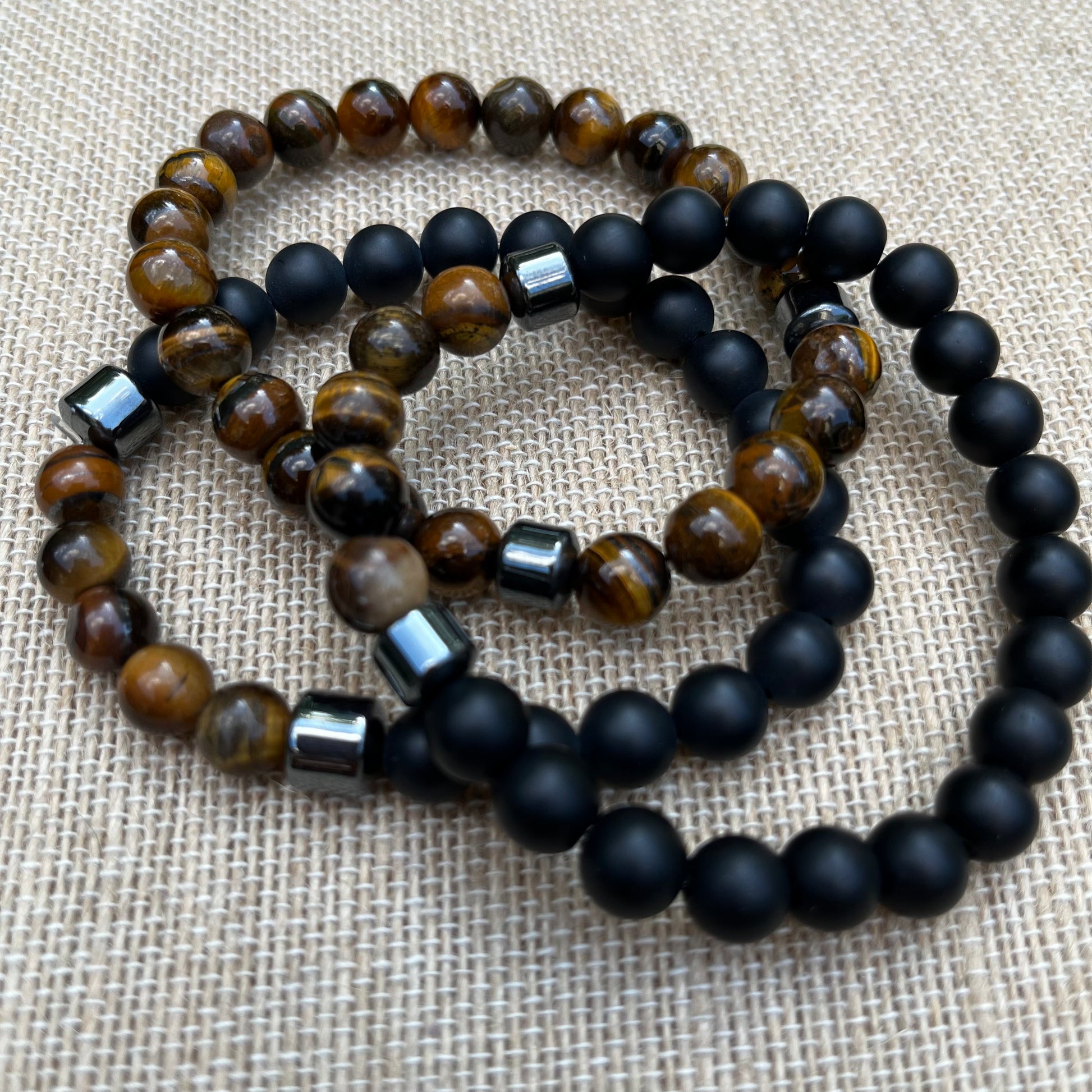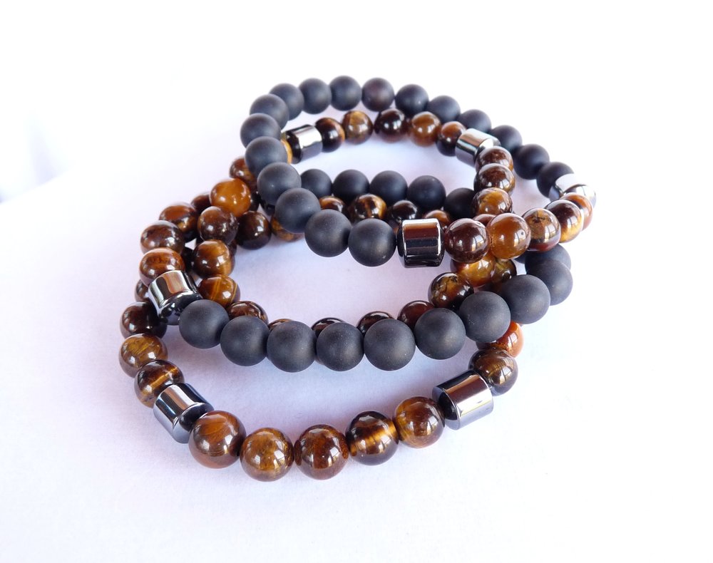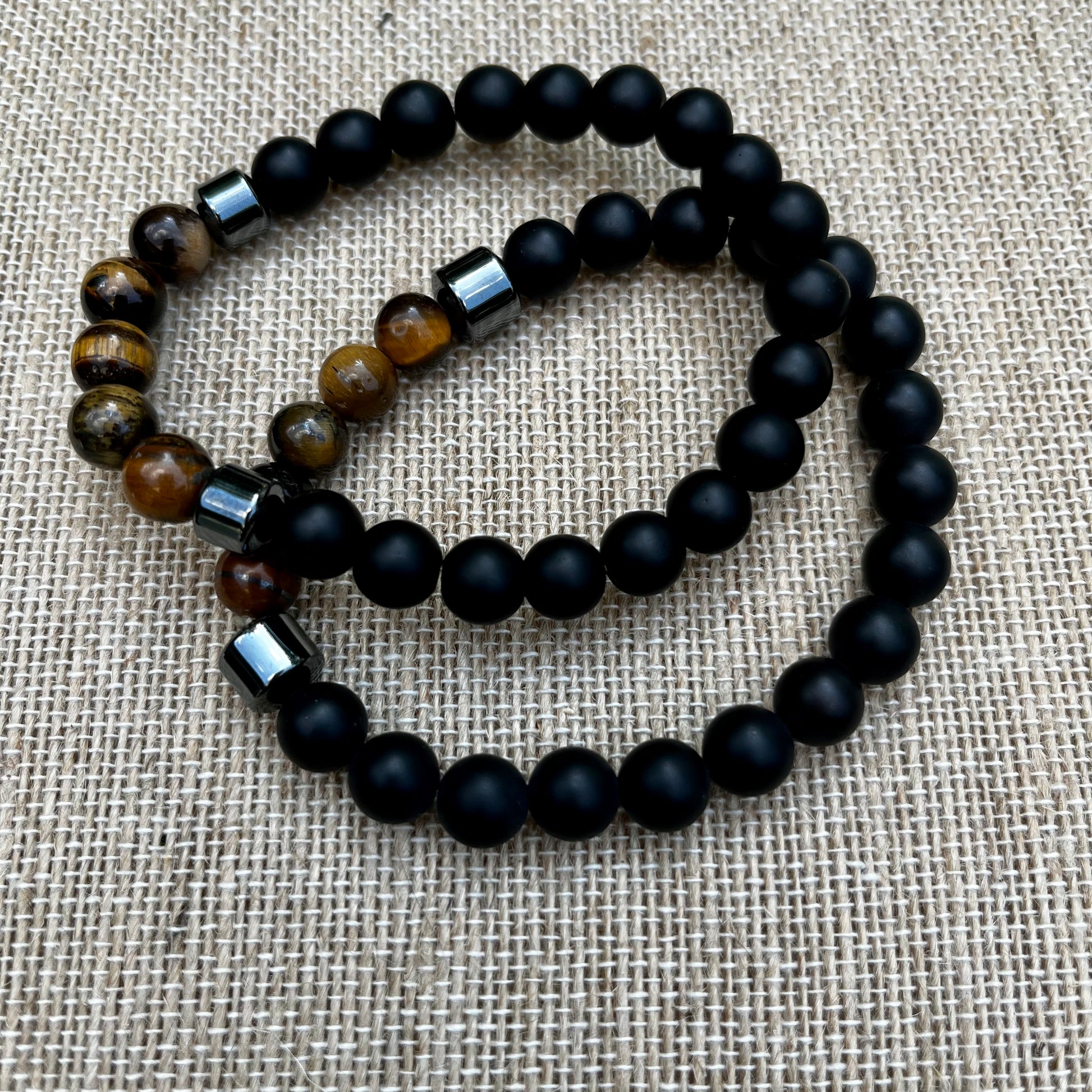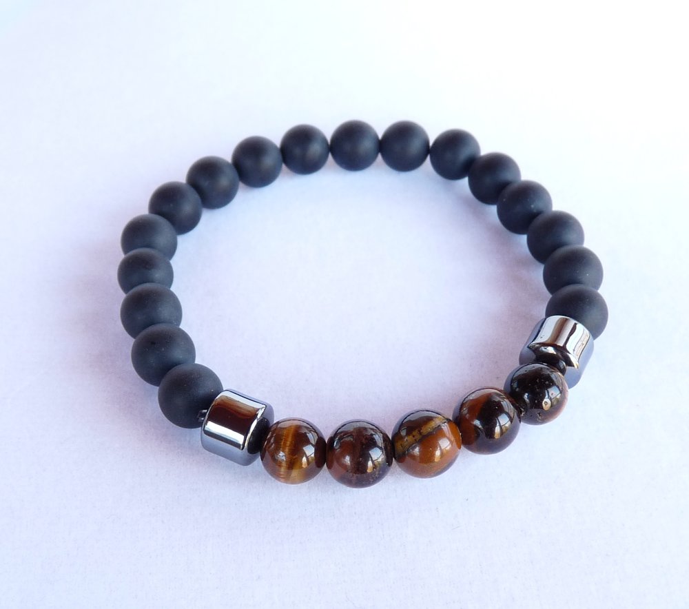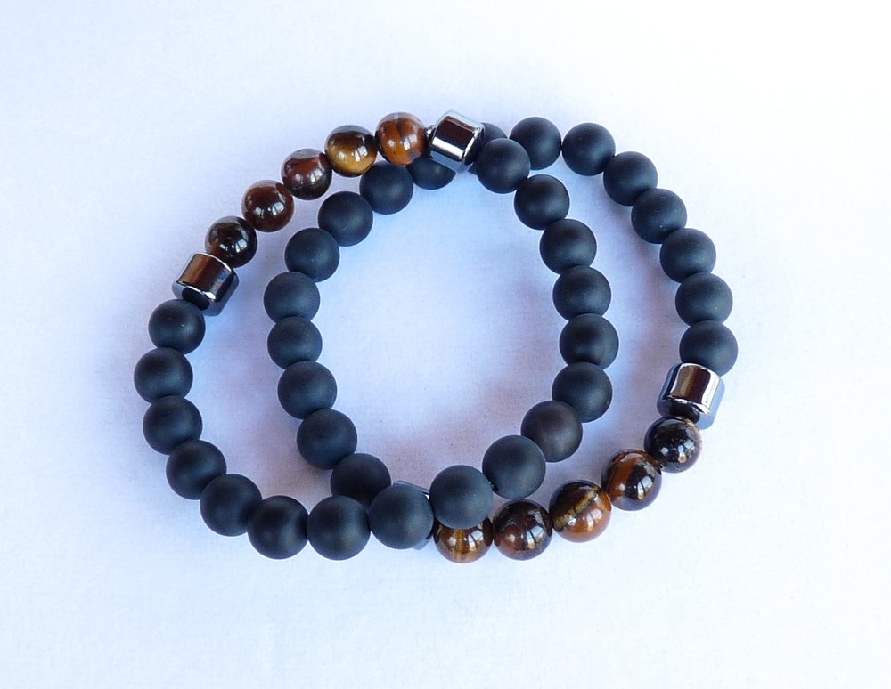 Men's semi-precious stone bracelets. Stretch. Choose from smooth brown or matte black with a small stretch of brown for contrast. This IS a man's bracelet, (though anyone can wear it!), but fits wrist only up to 7 1/2".