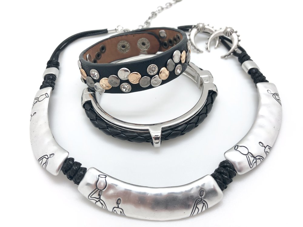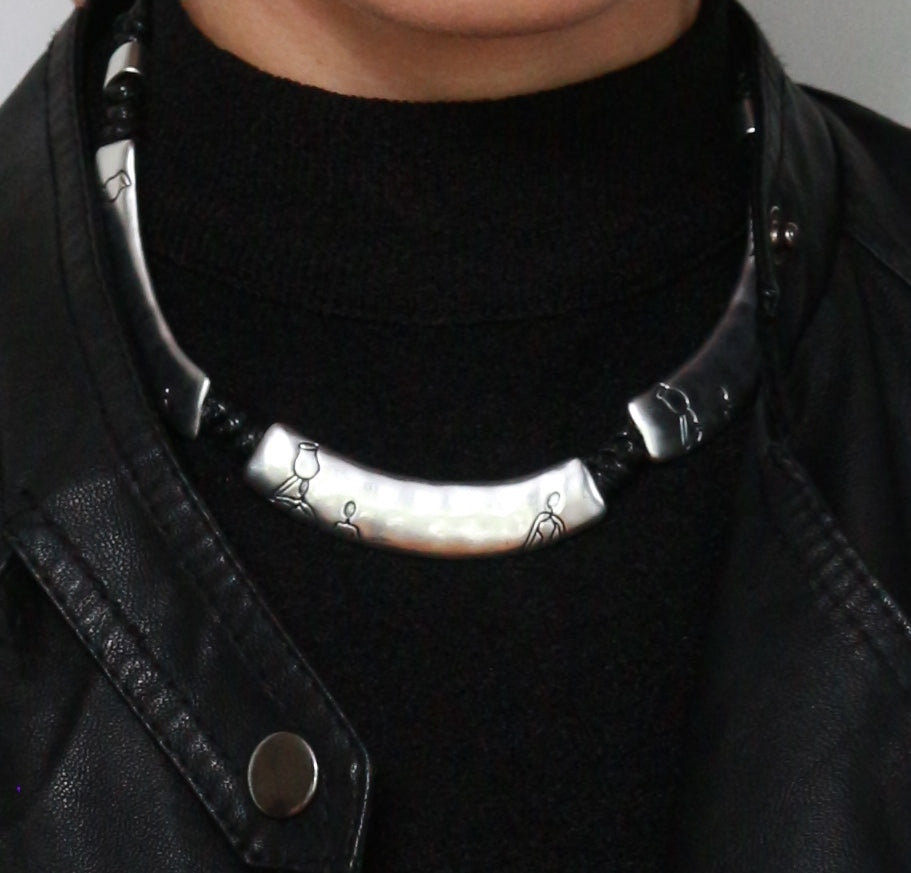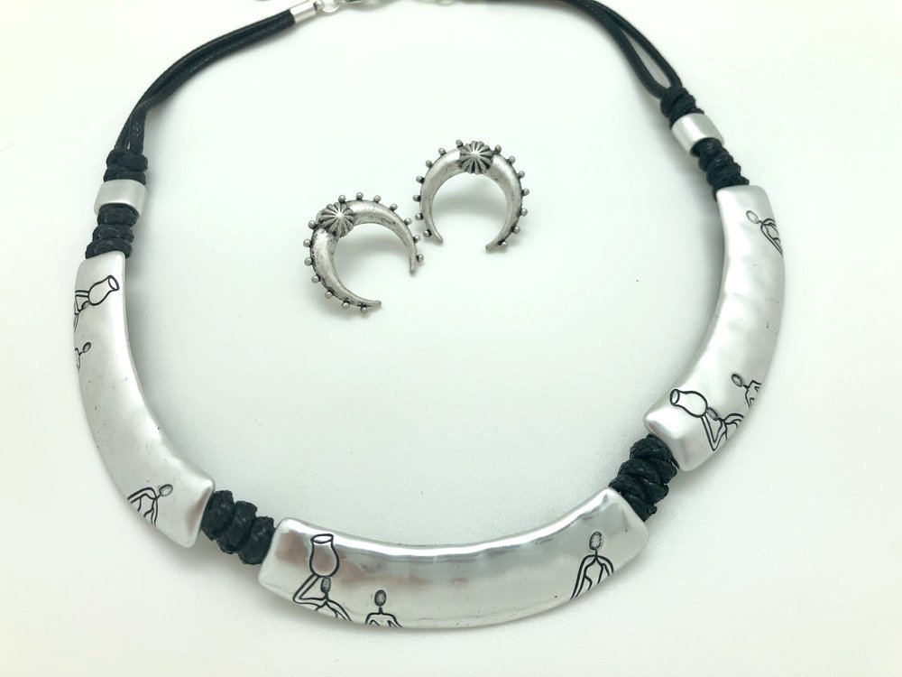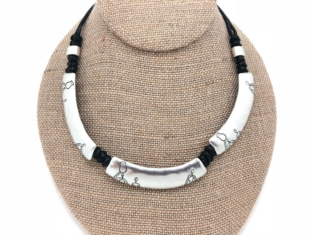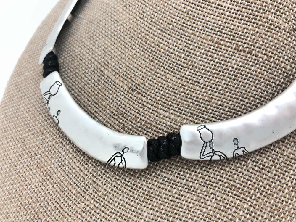 13-16” “choker” is a matte silver, sections connected with a wrapped double wax cord. Each metal section is etched with people figures, including a woman carrying a water jar on her head, bringing to mind the Biblical account of the woman at the well.