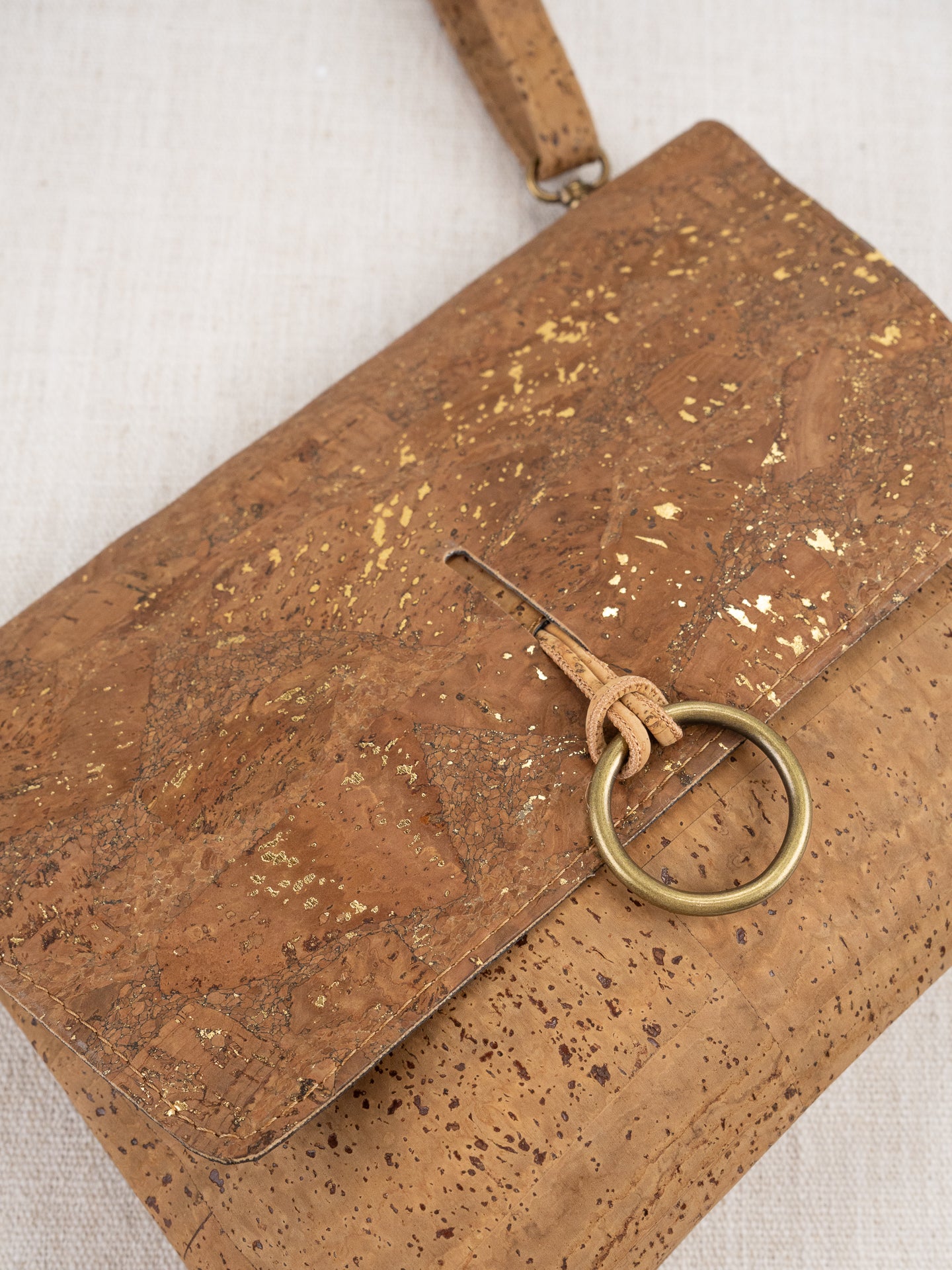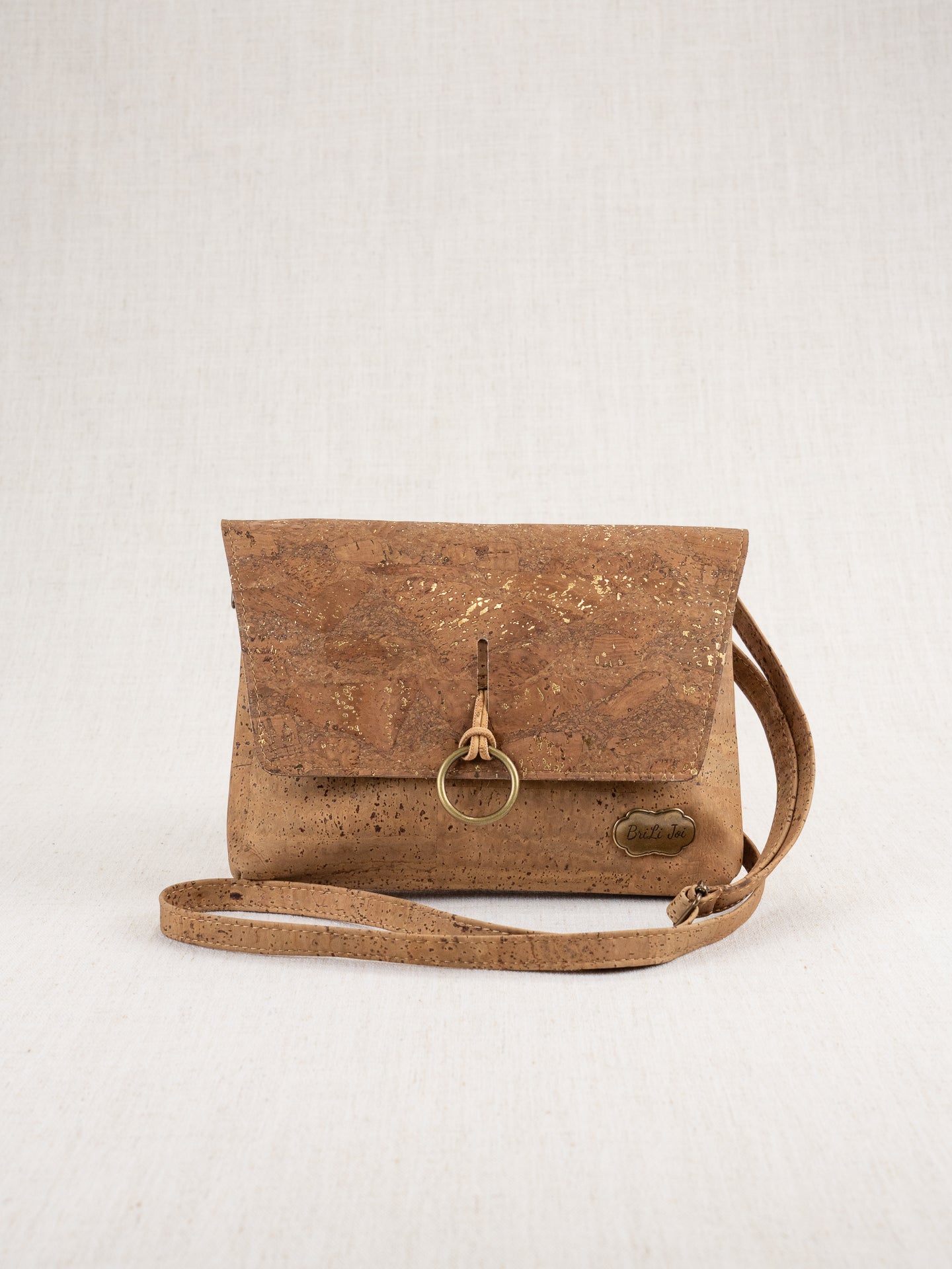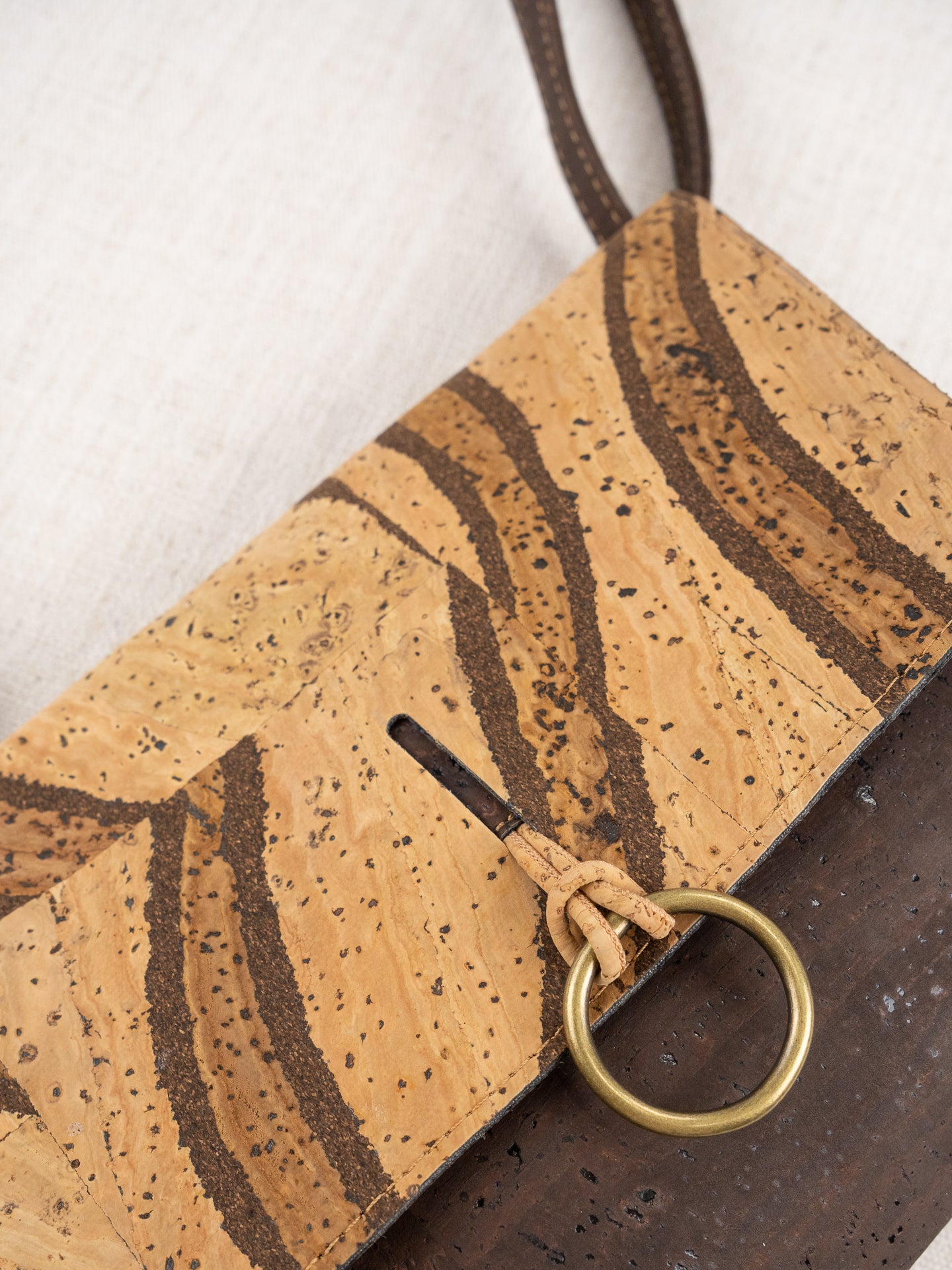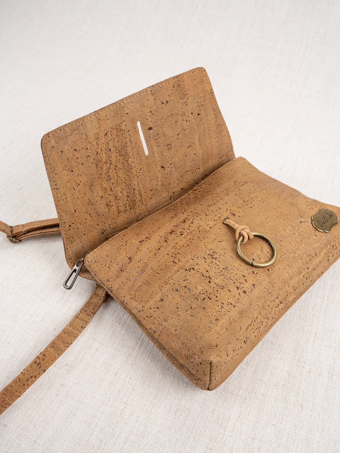 Approximately 10"x8", Zhuri boasts a cute ring closure, but with a zipper under the flap for security. Inside gives you a zippered pocket on the back and a drop in cork pocket on the front. Back of the bag has your handy zippered phone pocket.