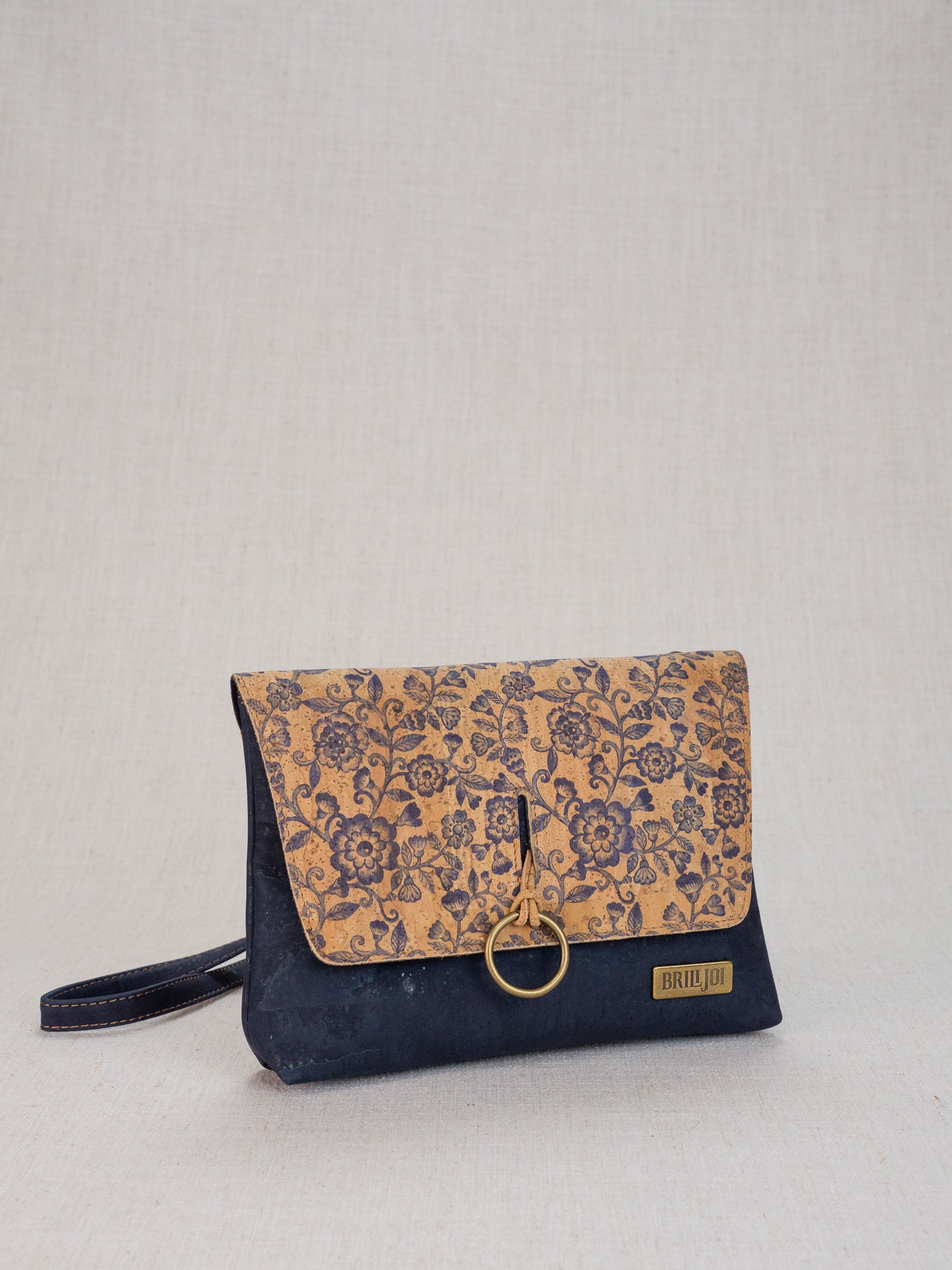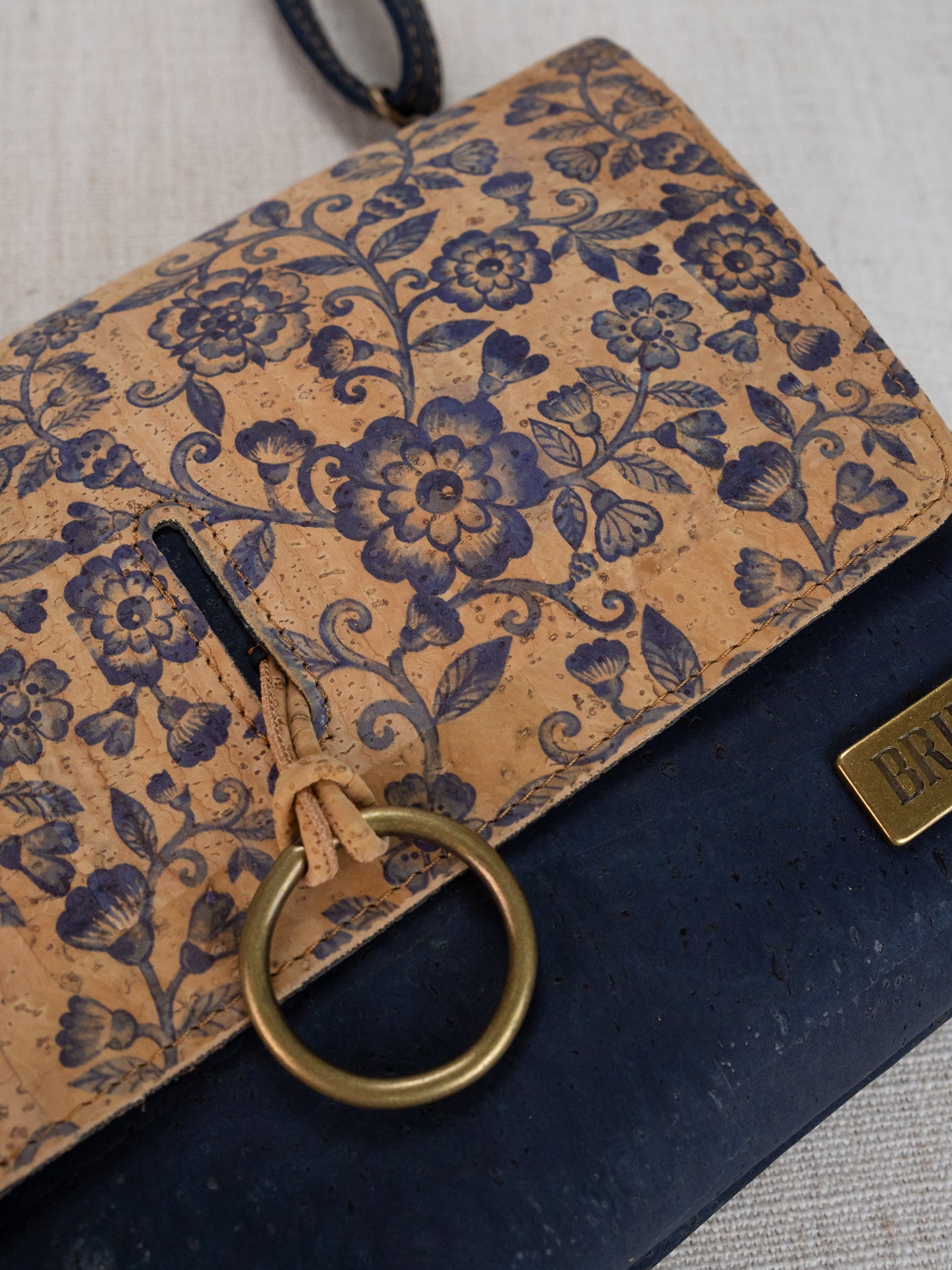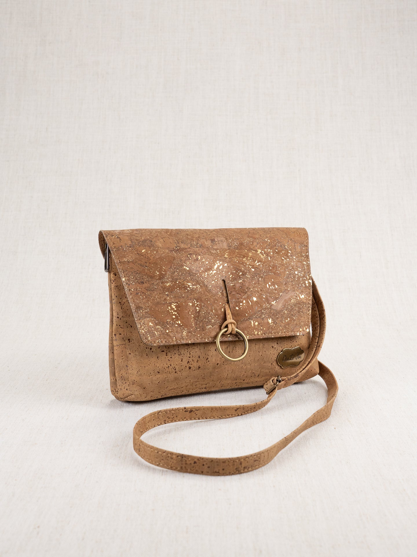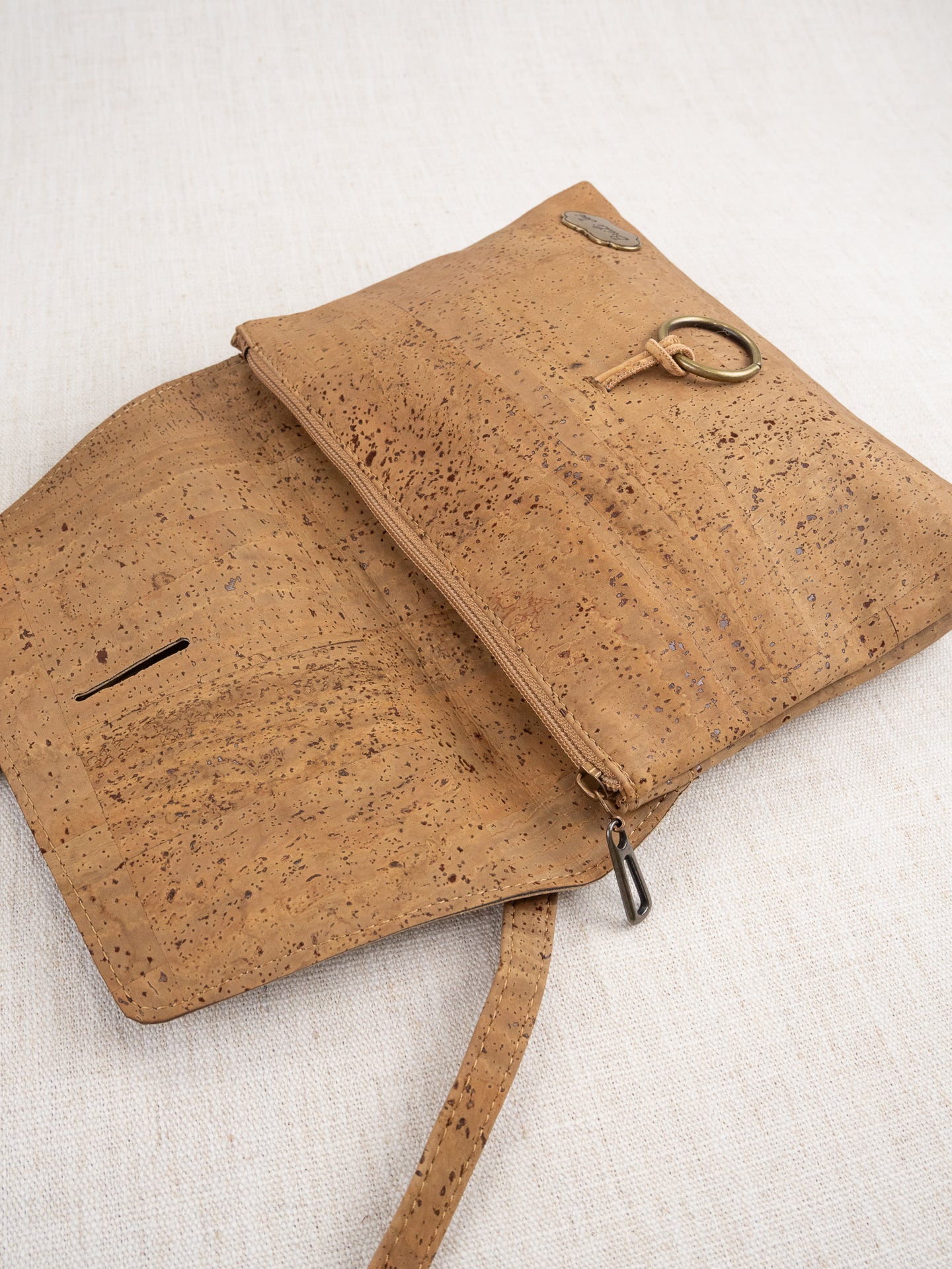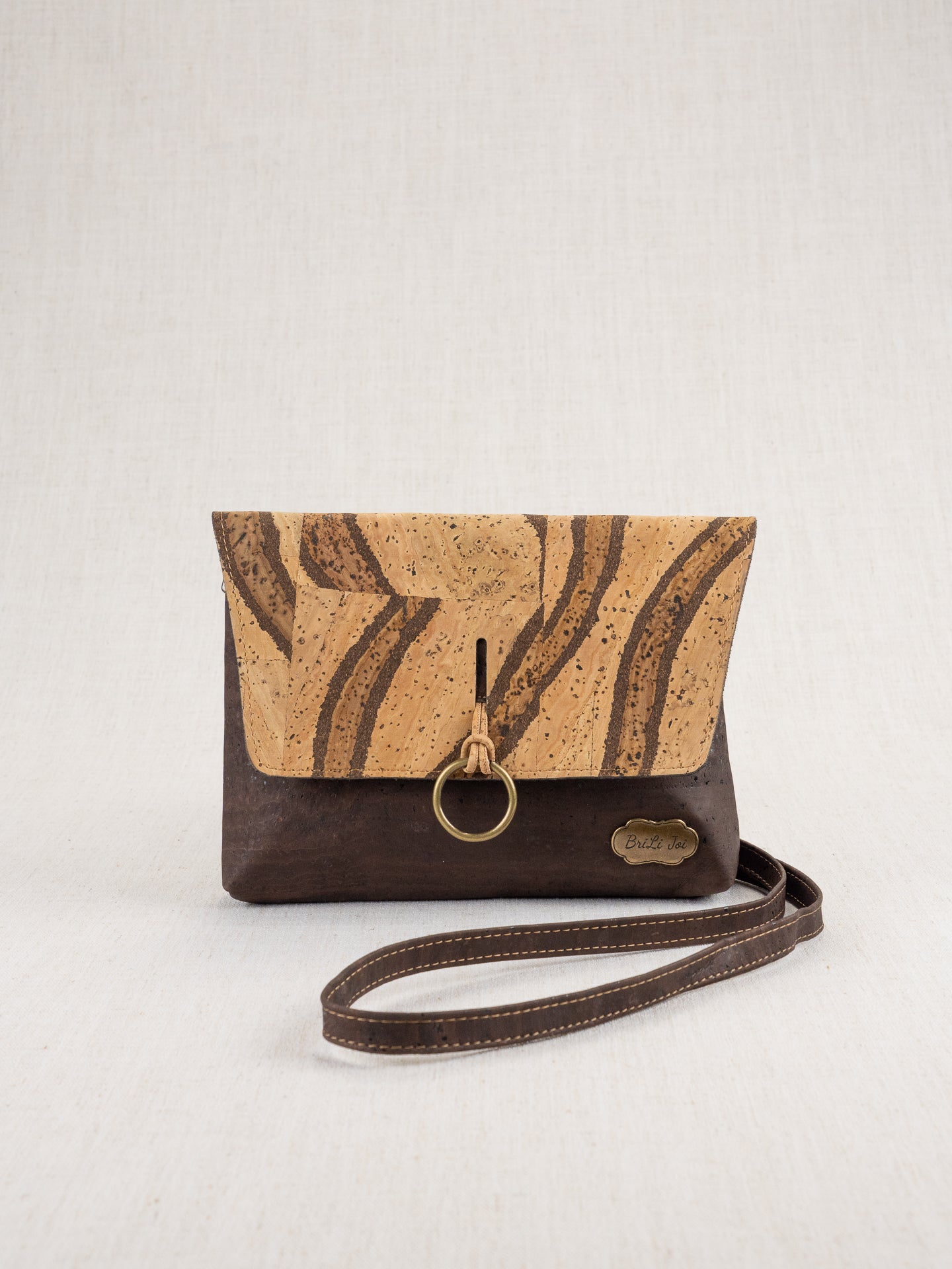 Approximately 10"x8", Zhuri boasts a cute ring closure, but with a zipper under the flap for security. Inside gives you a zippered pocket on the back and a drop in cork pocket on the front. Back of the bag has your handy zippered phone pocket.