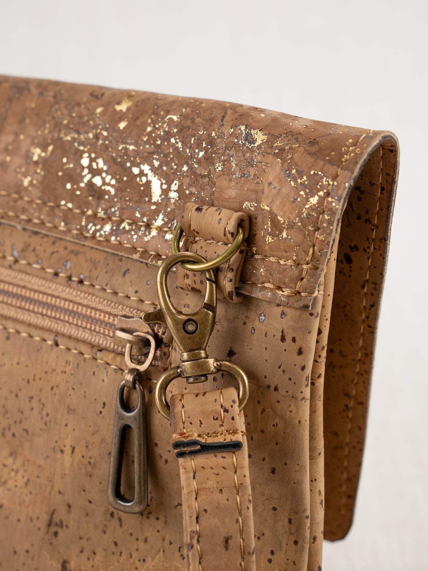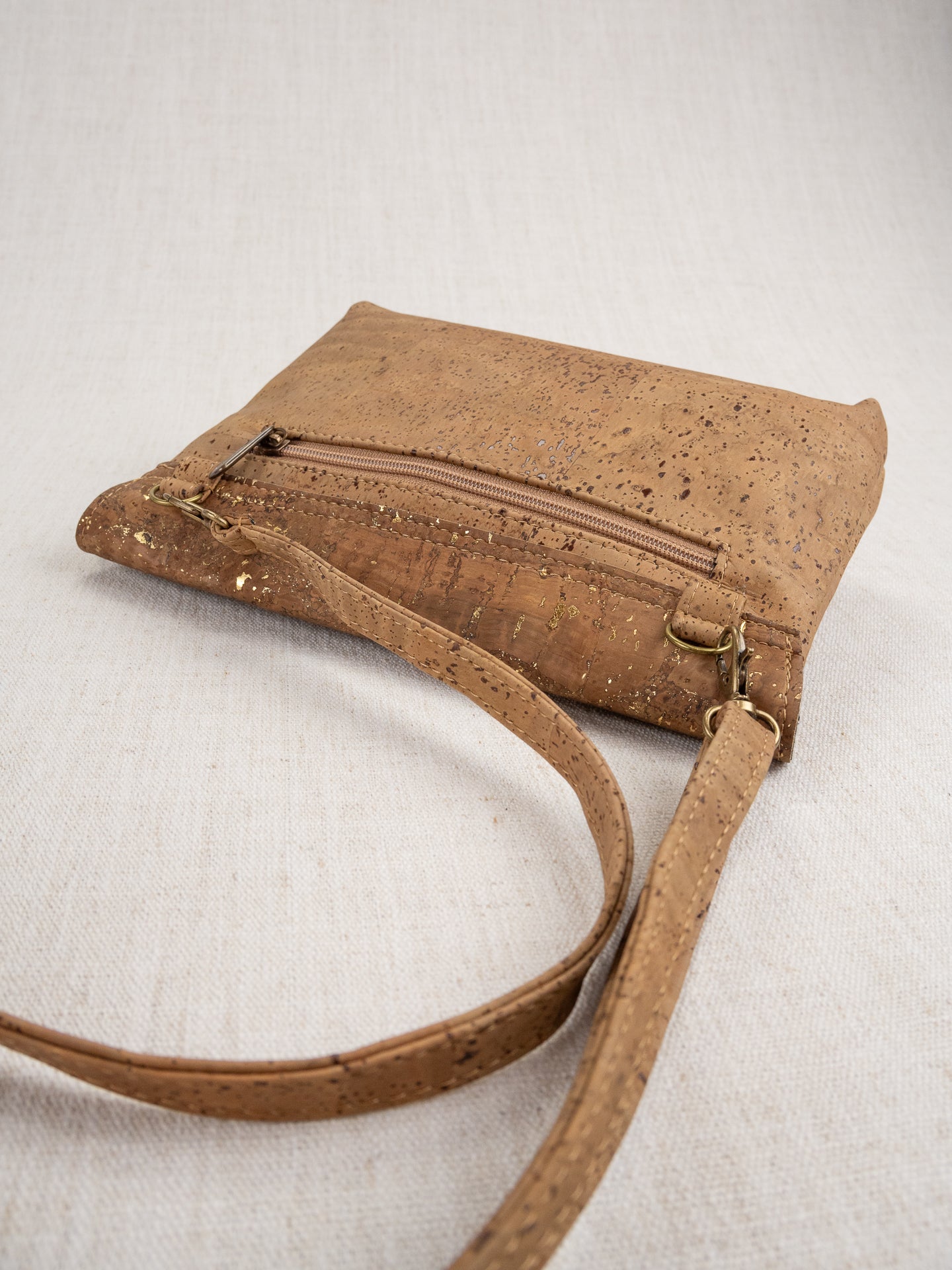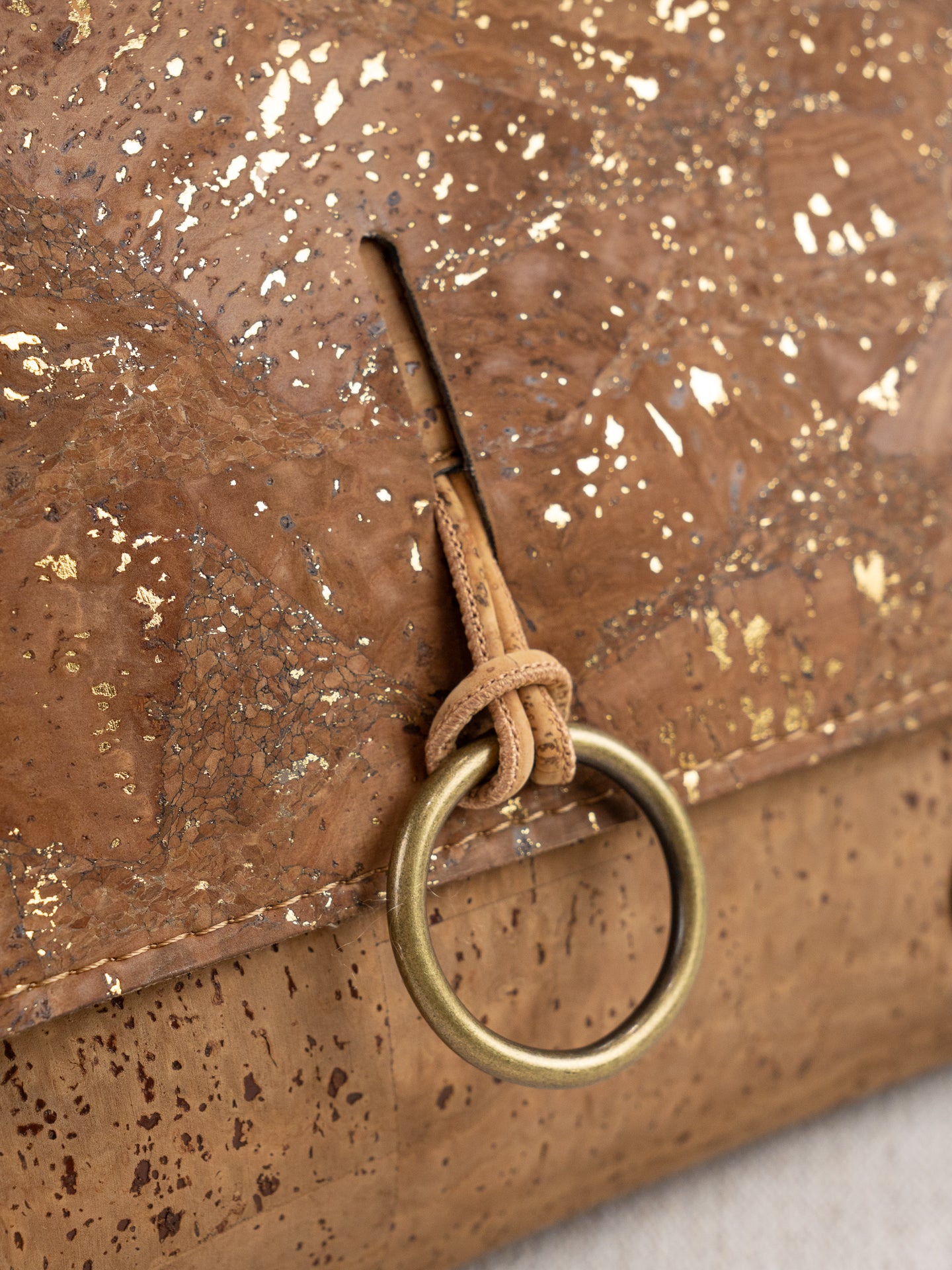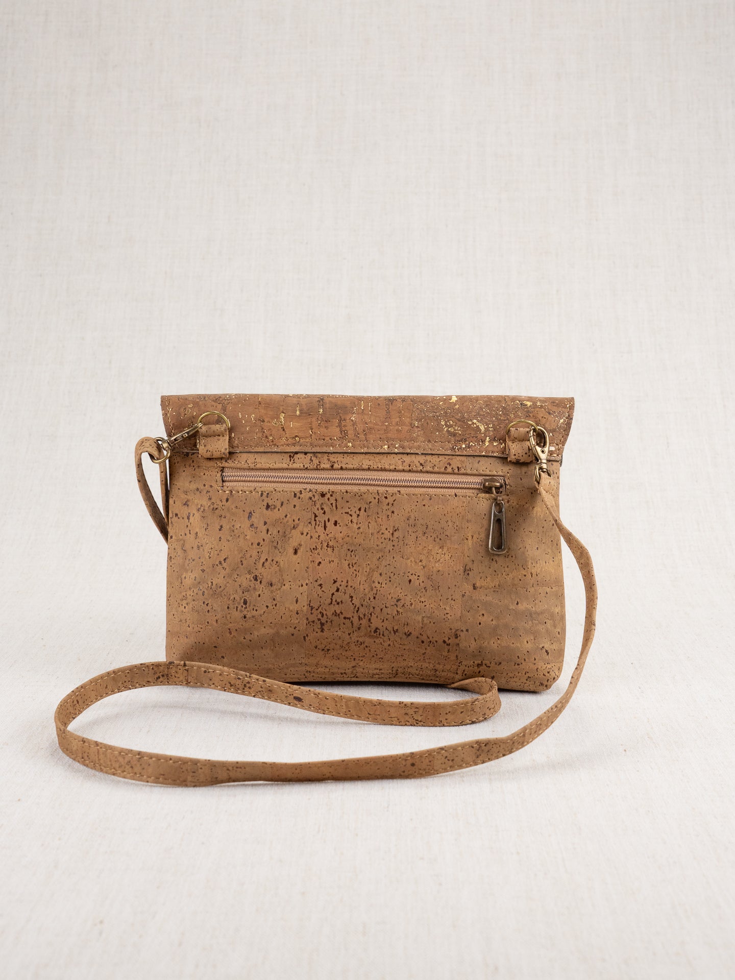 Approximately 10"x8", Zhuri boasts a cute ring closure, but with a zipper under the flap for security. Inside gives you a zippered pocket on the back and a drop in cork pocket on the front. Back of the bag has your handy zippered phone pocket.